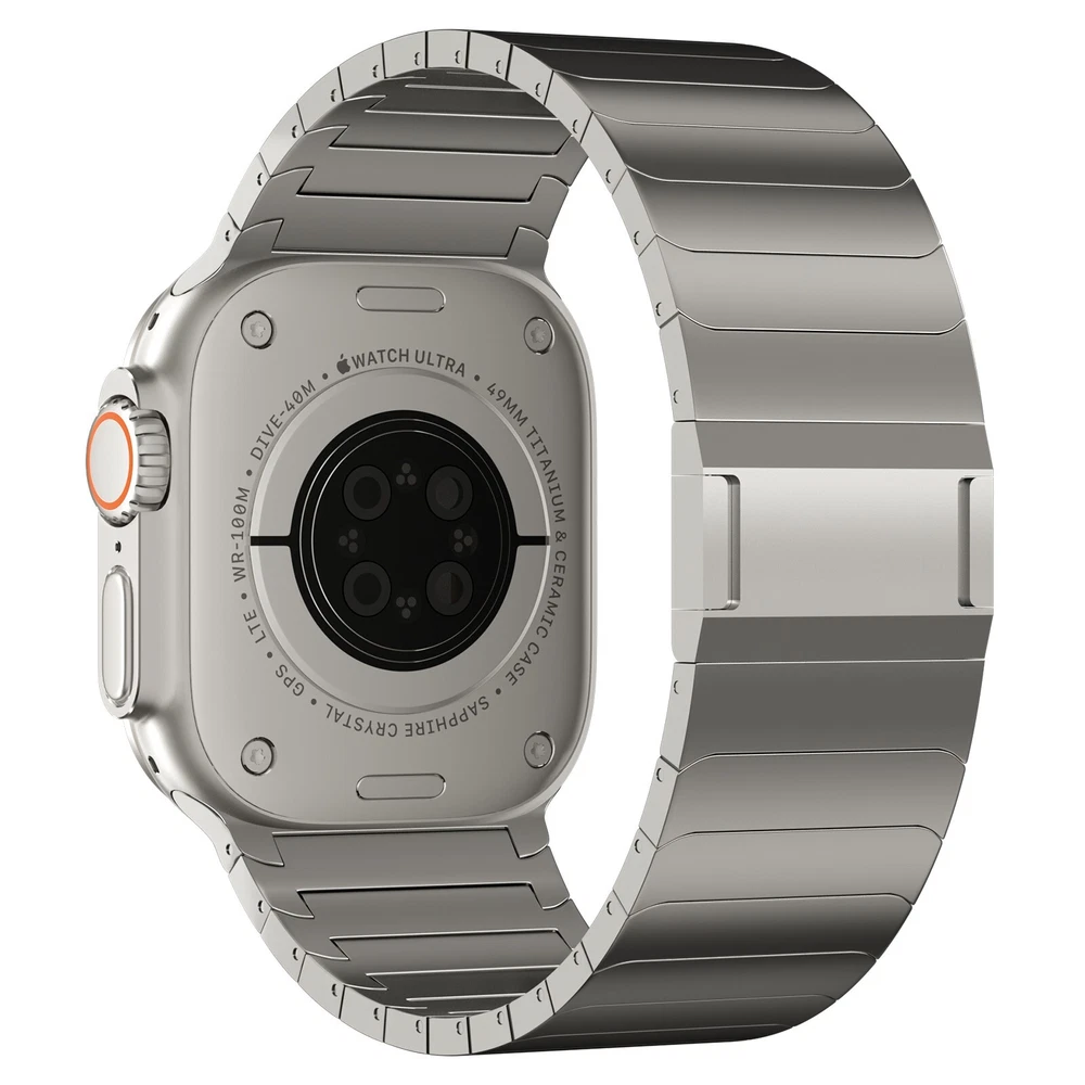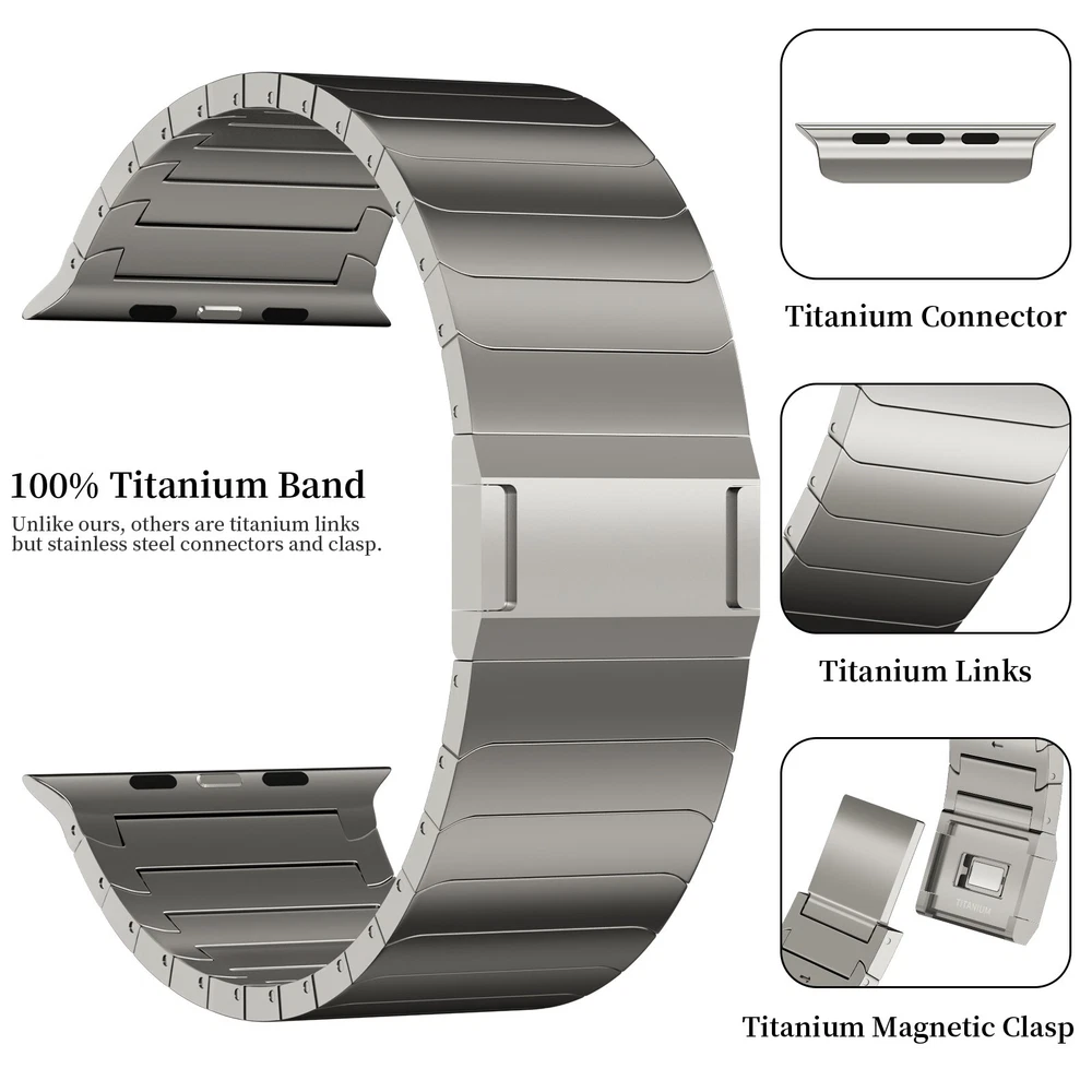 Specification Color TItanium Special Features Full titanium;DLC Coating Compatibility For Apple Watch Ultra 49mm / Series 10 46mm / Series 9 8 7 45mm / Series 6 5 4 SE2 SE 44mm Clasp Titanium Magnetic Clasp Connector Titanium Connector Titanium Grade Titanium Grade 2 Herring 800+HV Band Width 26mm Band Weight 72g(max) Band Thickness 3.4mm Band Length 210mm Clasp Thickness 5.5mm Wrist Size 150mm to 234mm Feature Lightweight;Corrosion-Resistant;Anti-Allergy Included Components Titanium watch band Warn tips: If you have specific requirements on packaging and components such as minor adjustment links、removal tool、tool pins and instruction, please contact online customer service. Product Description Full Titanium Band VS Titanium Band: All components include links, magnetic clasp, and connectors are crafted from titanium material, setting our bands apart from others with clasps and connectors made of non-titanium material 26MM Wider Design: The wider watch band best fits the Ultra. Design for any bold soul. Compatible with Apple Watch Ultra 49mm / Ultra 2 49mm / Series 10 46mm / Series 9 8 7 45mm / Series 6 SE 5 4 44mm. Fit wrist size 6.7" to 9.2"(170 to 234mm). We provide a minor adjustment link to adjust the band to fit for your wrist accurately Lightweight and Corrosion-Resistant: 72g(max). Experience the extraordinary benefits of full titanium - our titanium bands are not only lighter but also more corrosion-resistant than non-full titanium alternatives. Dive into the ocean or pool without worry, as our bands are built to withstand various environments Titanium Connectors: CNC high precision craftsmanship and unique titanium connectors ensure a tight and stable connection with original watch interface. Make sure your watch band stays securely attached, providing a seamless and comfortable fit Titanium Magnetic Buckle & Hook and Loop Closure: Sensitive skin? No problem. Our titanium magnetic buckle is an excellent choice, offering comfort without compromising style. Say goodbye to allergies associated with non-full titanium watch bands. Ensuring your watch band is comfortable to wear all day long. Magnetic buckle & hook and loop closure lock your watch easily and securely DLC (Diamond-Like Carbon): Our aerospace-grade titanium bands are not only a perfect match in material and color for the original watch, but also The DLC coating gives it extra durability and protection, far higher wear resistance than non DLC