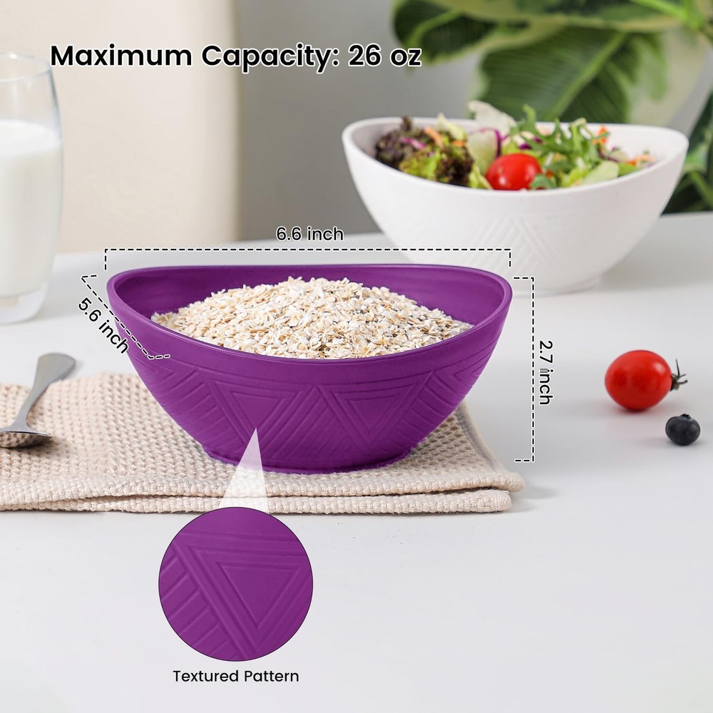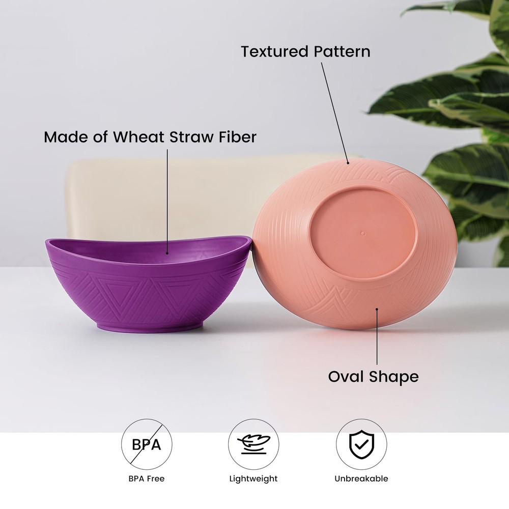 wheat straw bowls 26 oz snack bowls set of 4, made of wheat straw fiber and PP. Package includes: 4 pcs wheat straw bowls Capacity: 26 oz Shape: elliptical Color: white, rose, pink and purple 26 oz wheat straw bowls - the curved shape has a comfortable grip while enhancing your dining experience. Combination of aesthetics and functionality providing a comfortable dinning solution. The bowls set of 4 is made of wheat straw fiber and pp material which are BPA free. Providing a peaceful dining experience for your family with these wheat straw bowls. Our wheat straw bowls are lightweight and unbreakable compared to ceramic or glass bowls. No breakage when accidentally dropped, perfect for family usage. These plastic bowls reusable are easy to clean by hand wash or dishwasher. Microwave safe bowls can also be used in freezer. Note: The maximum temperature resistance is 248 ℉ (120℃). wheat straw bowls set of 4 have various color options, this set includes: white, rose, pink and purple. With a maximum capacity of 26 oz, these cereal bowls are perfect for daily usage such as cereal, salad, soup, snacks and popcorn without spillage. Wheat straw bowls are also great for everyday meals, parties, camping, traveling, etc. If you have any questions with these bowls, feel free to contact us and we will reply as soon as possible. 【Unique Shape and Pattern】 26 oz wheat straw bowls - the curved shape has a comfortable grip while enhancing your dining experience. Combination of aesthetics and functionality providing a truly comfortable and elegant serving bowls solution. 【Wheat Straw Bowls】 The bowls set of 4 is made of wheat straw fiber and pp material which are BPA free. Providing a peaceful dining experience for your family with these wheat straw bowls. 【Lightweight & Unbreakable】 Unlike ceramic or glass bowls that are heavy weight and fragile, our wheat straw bowls are lightweight and unbreakable. No breakage when accidentally dropped, perfect for family usage. 【Microwave & Dishwasher Safe】 These plastic bowls reusable are easy to clean by hand wash or dishwasher. Microwave safe bowls can also be used in freezer. Note: The maximum temperature resistance is 248 ℉ (120℃). 【Versatile Usage】 wheat straw bowls set of 4 have various color options, this set includes: white, rose, pink and purple. With a maximum capacity of 26 oz, these cereal bowls are perfect for daily usage such as cereal, salad, soup, snacks and popcorn without spillage. Wheat straw bowls are also great for everyday meals, parties, camping, traveling, etc. If you have any questions with these bowls, feel free to contact us and we will reply as soon as possible.