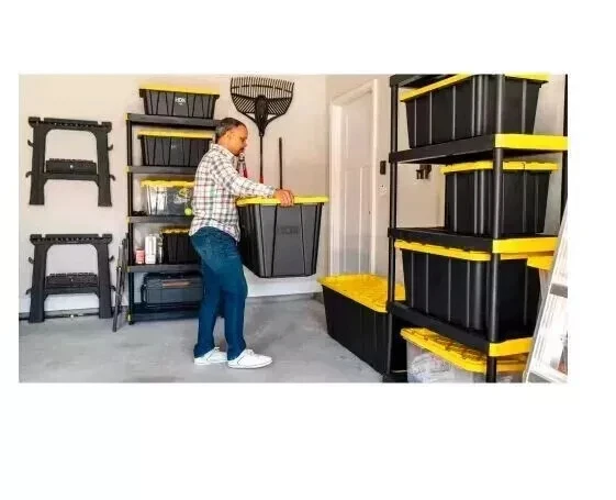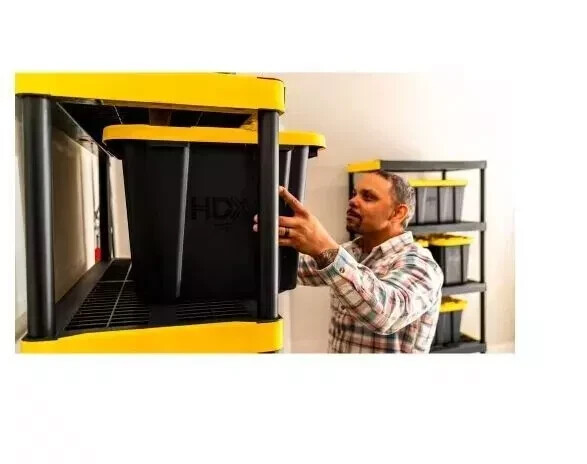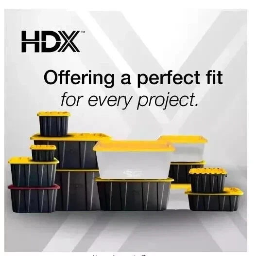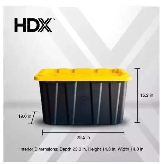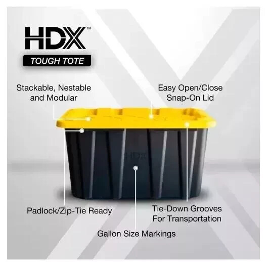 This heavy-duty HDX 27-Gallon Tough Tote is designed to handle all your storage needs. The recessed lid enables you to stack multiple units effortlessly, while the tapered design facilitates easy nesting when you need to store them. With a sturdy black base crafted from high-grade resin and a yellow snap lid, your items are safe and protected. Ideal for the thorough organizer seeking top-tier storage solutions, this tote features integrated slots for locking to deter unwanted access. Its unique tie-down channels also make it easy to secure for hassle-free transport and it's compatible with most hitch mounted cargo carriers. So that you can easily recognize what size your tote is, the gallon size is clearly visible on both the base and the lid. Embrace the essence of organized living with HDX Tough Totes! Highlights Weight capacity 75 lbs. Product empty weight 6.1 lbs. Exterior dimensions (at top of tote) 28.6 in. L x 19.6 in. W x 15.2 in. H Interior dimensions (at bottom of tote) 22.98 in. L x 14.02 in. W x 14.30 in. H Tie-down channels help with securing totes while transporting Snap-on lid with integrated zip tie/padlock holes for lockability These heavy-duty totes are convenient for storing in bulk; moving; organizing offices, food pantries, garages and closets; plus many more home or jobsite uses Comfortable ergonomic handles for easy carrying Stackable space saving design Storage containers nest when empty for easy storage Product design may vary by store