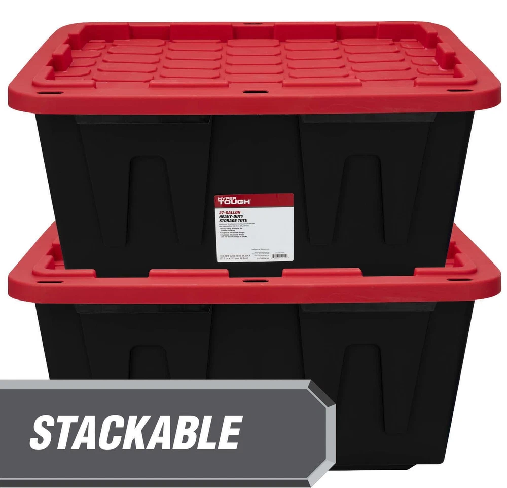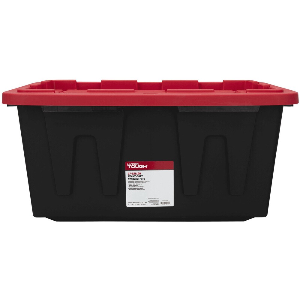You may also like Heavy Duty Trash Bags 100 Count 55-60 Gallon Tear Resistant Home Commercial New 13.58 USD Free shipping Expandable Drying Rack Metal Clothes Dryer W/ Folding Design Indoor Outdoor Use 33.22 USD 35.34 USD Free shipping 6% off Heavy Duty Recycled Plastic Hangers W/ Swivel Hook Pants Skirts Clothes Storage 12.55 USD 13.35 USD Free shipping 6% off Gourmet Wet Cat Food Flaked Fish Shrimp High Protein Balanced Nutrition New 18.27 USD 19.44 USD Free shipping 6% off 4 Qt Slow Cooker Touch Control Stoneware Pot Dishwasher Safe Lid Holder New 63.87 USD 67.95 USD Free shipping 6% off Wide Flex Storage Bins Closet Shelf Organizing Supplies Accessories Books 11.88 USD 12.64 USD Free shipping 6% off Large 2 Bushel Plastic Laundry Basket W/ 4 Comfort Grip Handles & Ventilation US 17.34 USD 18.45 USD Free shipping 6% off Wall Mounted Medicine Cabinet Adjustable Shelves Bathroom Storage Organizer New 111.98 USD Free shipping Large Woven Faux Seagrass Decorative Floor Vase Indoor Dried Plants Display New 48.94 USD 52.06 USD Free shipping 6% off 6-Cube Storage Organizer Bookcase Vertical Horizontal Display Home Office New 55.74 USD 59.3 USD Free shipping 6% off Stage 2 Baby Food Puree Variety Pack Fruit Cereal 6 Months Plus Nutritional Tubs 47.87 USD 50.93 USD Free shipping 6% off Corner Bookshelf Lamp 3-Way Adjustable Lighting Modern Tree Design Small Spaces 64.99 USD Free shipping Product details Organize clutter and hide unused items with the Hyper Tough 27 gallon snap-lid plastic storage tote, one of the most popular sized totes for home storage. Made of durable recycled plastic, the black storage tote allows you to hide away things you do not want to be seen, while the red patterned snap-lid adds color to your space. The 2-point snap-lid ensures your items are safely secure during storage or transport. The specially molded lid allows you to stack multiple totes on top of each other to prevent toppling and sliding while maximize vertical storage space. This easy to grip handles makes it easy to carry and move from room to room. Protect your valuable by utilizing the 6 tie-down holes made for zip-ties and padlocks to keep your valuables safe from unwanted pests, intruders, pets, or kids. The long-lasting Hyper Tough tote works great in basements, closets, pantries, sheds, barns, and attics. This tote is great for organizing household products, gardening supplies, pet treats and supplies, shoes, clothing, seasonal gear like boots, sporting equipment such as golf balls, tennis balls, or drill cones, and many other items. Tough black plastic construction resists rust, dents, stains and peeling to ensure lasting use Stackable lid design creates stability and reduce toppling when multiple units are stacked Snap-Fit Lid lip keeps your content from spilling or falling out Lockable Lid comes with 4 holes ideal for zip-ties or padlocks to keep your items safe and secure Semi fluted sides add strength when stacked Exterior Dimensions - 30.6 IN W x 20.6 IND x 14.3 IN H (77 .7 cm x 52.3cm x 36.3 cm) Easy to clean surface, Indoor or Outdoor use Tie down grooves for straps Made from recycled materials Reusable Set of 4 – Includes 4 black base and 4 red lid Weight – 6.6 lbs per tote Available in multiple sizes: 5 Gallon, 12 Gallon, 17 Gallon, 27 Gallon, 40 Gallons and 50 Gallons 5-Tier Wire Shelving W/ Wheel Chrome Plating Tiered Shelf 1500 Lbs Weight Load 101.51 USD 107.99 USD Free shipping 6% off Mirrored Jewelry Box Organizer Leather Storage Case Necklaces Earrings Rings New 48.21 USD 51.29 USD Free shipping 6% off Adirondack Ottoman Footrest Durable Meranti Wood Comfortable Outdoor Resting New 50.11 USD 53.31 USD Free shipping 6% off Heavy Duty Metal Rolling Utility Cart W/ Steel Shelves Garage Kitchen Office New 126.89 USD 134.99 USD Free shipping 6% off Dish Drying Rack 2-Tier Kitchen Counter W/ Drainboard & Mat Metal Gadgets Black 58.36 USD 62.09 USD Free shipping 6% off Wall Mounted Bike Rack W/ Shelf Hooks Space Saving Indoor Hanger Bicycle Orange 101.51 USD 107.99 USD Free shipping 6% off 6 Pack 334133-6PK Gloss White Turbo Spray Paint 24 oz Stops Rust 96.88 USD 103.06 USD Free shipping 6% off Hard Gun Case W/ ZERUST Anti-Corrosion Technology Secure Closure & Foam Padding 97.41 USD 103.63 USD Free shipping 6% off Electric Food Warming Mat Portable Silicone Tray Timer Safe Parties Buffets New 48.21 USD 51.29 USD Free shipping 6% off Durable Orthopedic Dog Bed Jumbo Breed Dog Sofa Bed with Removable Cover White 90.09 USD 95.84 USD Free shipping 6% off 10 Tons Hydraulic Crimper Tool 9 Pairs Dies Crimping Wire Cable Lug Terminal NEW 55.07 USD 58.58 USD Free shipping 6% off Narrow Side Table Charging Station Slim End Desk 3-Tier Storage Organizer New 76.13 USD 80.99 USD Free shipping 6% off