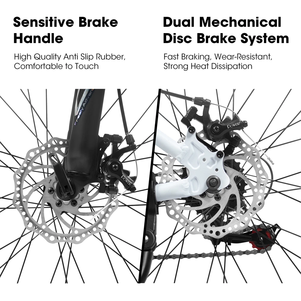 27 Inch Mountain Bike 21 Speed, Suspension Fork, Aluminum Frame Disc Brake Features 【High quality aluminum Frame】ECARPAT has a high quality ultralight aluminum frame for riding and moving with ease,corrosion resistant and very easy to clean and maintain. 【Brake&Shifter】Front and rear disc brakes ensure timely and effective braking,provide you better durability and stopping power for your rugged and damp adventures.The 21-speed drivetrain with Shimano shifters and Trigger Shifter allows you to find the most comfortable and efficient gear for the kind of road. 【Suspension Fork】Equipped with a shock-absorbing fork that absorbs any bumps and inclines in the road for a smoother feeling ride. 【27.5*2.125" Tire】27.5*2.125" Rubber mountain pattern tires with high friction. Anti-skid and wear-resistant with strong grip and puncture resistance for hillsides, gravel, city streets and trails. 【Buy Guide】27.5 inch wheel bike Suits riders between 5'5" & 5'10".85% pre-assembled,easy to assemble, assembly tools included. Please don’t assemble the fork BACKWARDS. If you have any questions about the bike, please do not hesitate to contact us for solution.