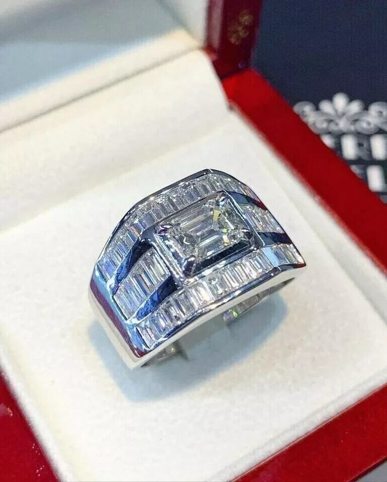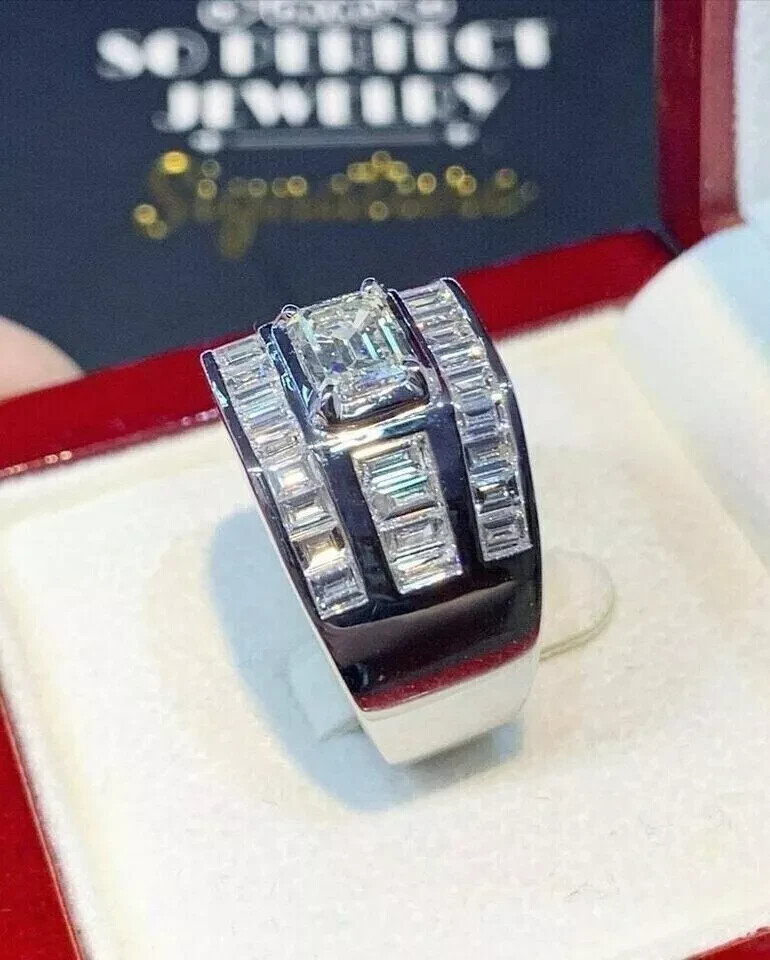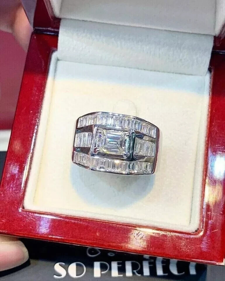 Elevate your style with this exquisite 2.70 Ct Emerald Simulated Diamond Pinky Ring. Crafted in 14k White Gold Plated Sterling Silver, this band boasts a stunning main emerald cut stone in the center, with additional simulated diamonds as a secondary stone. The ring is perfect for various occasions including Engagement, Wedding, Anniversary, Birthday, Valentine's Day, and even Christmas. This ring is available in all ring sizes and can be personalized as per buyer's requirements. It features a prong setting style with an excellent cut grade, making it a gorgeous and durable piece of jewelry. The ring is nickel-free, adjustable, and engraved, with a band width of 8.5 mm. Get this handmade ring with a seller warranty, and make a statement with this beautiful piece of art.