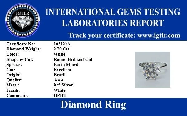 ALL ITEMS WILL BE DELIVERED WITHOUT PAYING ANY TARIFFS, CUSTOM DUTIES ETC. BY YOU. GREAT BRILLIANCE! EXCELLENT LUSTER! DIAMOND RING Diamond Color - White Shape of Diamond - Round Brilliant Cut Approx. Weight of Diamond - 2.70 Carat Approx. Size of Diamond - 8 mm Origin of Diamond - Brazil Species - Earth Mined Treated - HPHT Clarity - VVS1 Cut - Excellent Size of Ring – US 7 is default size - (Can be resized for additional $ 20.00 or default will be shipped) https://www.ebay.com/itm/404196768619 You can pay for resizing from the following link: Please copy and paste the above link in your browser Metal - Stamped Solid 925 Sterling Silver Finish - White Gold This diamond ring is handcrafted with utmost care. Would make an ideal gift for someone special. The diamond has excellent cut and luster. Comes in attractive packaging. CERTIFICATE OF AUTHENTICITY PROVIDED Shipping : Shipping is by UPS/SPEEDPOST/FEDEX or similar shipping agencies to reach you in 9-12 business days after processing the order. Tracking is provided. Please note: Jewelry items can take up to 10-12 business days to process to take care of ring sizing if any, polishing, finishing, packing and handling, certification, documentation etc. Shipping Charges include eBay fees on Shipping, packaging, certification costs, manpower costs, overheads, taxes etc. in addition to actual courier/postal expenses which have increased substantially as a result of pandemic & global economic conditions. We do not artificially increase the price of the products to include shipping charges but only charge what shipping actually costs us. Combined Shipping: Combined shipping discount is available up to 5 (Five)items in an order to be purchased within 5 days. You can continue to buy- Any additional items above 5 in quantity will be considered a new order. This is to avoid pilferage en-route as well as to ensure that you are happy with the merchandise. Once you have received their items you may buy additional items again. This limit may be revised for repeat and regular customers. Payment: Buyers are requested to pay within 3 (Three) days of purchases. eBay will automatically open unpaid item cases in case payment is not received within this period. The item will also be available for purchase to other buyers till such time that the payment is received. Customs and Taxes: Any customs duties, charges and local taxes are subject to local laws and vary from country to country and hence the payment of any eventual custom duties, charges, levies and taxes etc will be at the buyer's expense. We do not have any control on the same. Returns & Refunds: You can return the item within 14 days of receiving the parcel. - Please return in original packing. Buyers are required to check and ensure that the item/s are in good condition and as per item listing on eBay as no claims for returns and refunds will be entertained thereafter. The returned item should be unused and in original and undamaged condition. Buyer will be required to ensure that the item is sent by trackable shipper. Shipping charges are non-refundable. Refunds are made by PayPal and may take up to 5-7days after receiving back the product/s. Disputes: We aim to settle all disputes amicably. Please do not open any dispute on eBay for dis-satisfaction or for non-receipt or to return an item. We are available through ebay messages system and most messages are replied in a few hours. Personalized satisfaction is of utmost importance to us. Feedback : We always provide excellent feedback to our buyers and expect the same in return with 5-star ratings. In case of any dissatisfaction or any other reason please do contact us before leaving any neutral or negative feedback - we will strive our best to resolve all issues to your satisfaction. Metal : Silver is 925 Sterling Silver with Nickel Free Rhodium Plating. Please refrain from buying if you have allergic reaction to metals. We will not be responsible for any health problems in this regard. Legal Disclaimer : Refund or any claim liability for the buyer is only limited to the value of the item purchased. No additional claims will be entertained for any other reason whatsoever. Please note that since various labs may have different testing methods and the interpretation of all our Diamonds and Stones may differ from one lab to another as well as from one Gemologist, appraiser and Jeweler to another, we will be unable to accept another Lab Certificate or the judgement of any other third party including any Gemologist, appraiser, Lab, Jeweler etc. By consenting to buy our items it is understood that you have read, understood and agree to the terms and conditions as well as the FAQ for the Diamonds and Jewelry being sold buys. FAQ What are Color Diamonds? These are genuine Colored Diamonds found naturally mines mainly from Brazil. They are more porous than White Diamonds and are found in the upper layers of the ground relative to the White Diamonds that are mined deep. Some scientists are of the opinion that their origin maybe a Meteor that impacted earth Billions of years ago. What is their nature? Colored Diamonds are not found in the state as they are sold. They are made from earth mined rough rock found in mines of Brazil. The Rock color varies from Light Blue, Dark Blue, Champagne, Pink, Green etc. What is the treatment process? To bring out its true color it needs to be treated. The process is a natural one employing gentle heating a high-pressure environment (HPHT) which gradually brings out the true color of the Diamond. Are any artificial colors or chemicals added? There are no artificial colors or chemicals included in the process. They are not irradiated. Does it alter the composition? The process may or may not alter the composition. It remains a true Diamond nevertheless. Once our diamonds are heat-treated, it may move the molecules. This causes them to not always test properly with a hand tester. If a hand tester is used, sometimes they tes