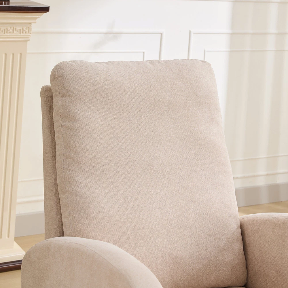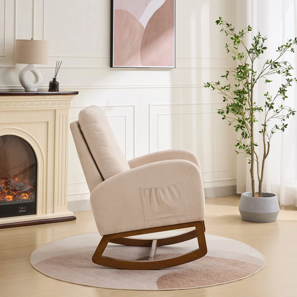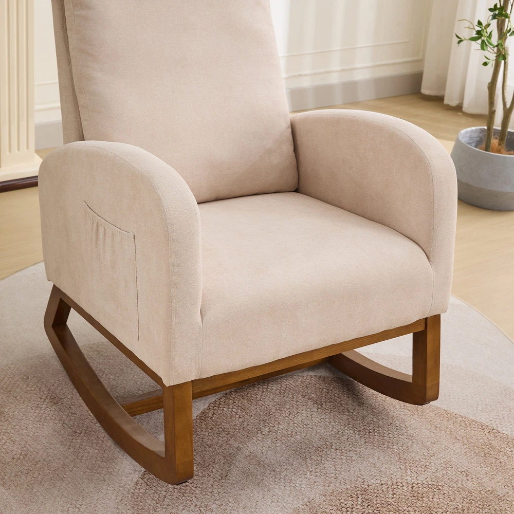 Specifications Place of Origin #originPlace# Main Color Beige Main Material Polyester Dangerous Goods #dangerFlag# Dimensions & Weights Assembled Length (in.) 27.17 Assembled Width (in.) 37.00 Assembled Height (in.) 40.55 Weight (lbs) 44.00 Product Features Fabulous Comfort:Covered with high-quality polyester for a soft and breathable surface, the rocking chair brings you a luxurious yet casual sitting. A refined curved wing back provides a comfortable sitting position for you to enjoy a leisurely time. Gentle Rocking:The rocking chair has excellent curved legs , making it rock gently and smoothly. Such a sweet design is the perfect centerpiece for the nursery and leisure, enjoying your time. Side Pockets:This rocking chair has side pockets for items like unfinished books and remote controls.Make it more practical for you to use. Sturdy and stable:The frame is made of sturdy plywood and rubber wood legs, which is super strong and durable. In addition, there is an extra fixed wooden cross bar between the two legs for better stability. Its max capacity can reach 250LBS. Easy to install:This chair only needs to be installed on the backrest and feet, and it only takes an adult to install it in 10 minutes, which is very time-saving. Description Product Description Product Name Rocking Chair Overall Dimensions 27.17'W x 37'D x 40.6'H Overall Product Weight 44lbs Seating Capacity 1 Upholstery Material Polyester Seat Cushion Fill Material Foam Back Cushion Fill Material Foam Frame Material