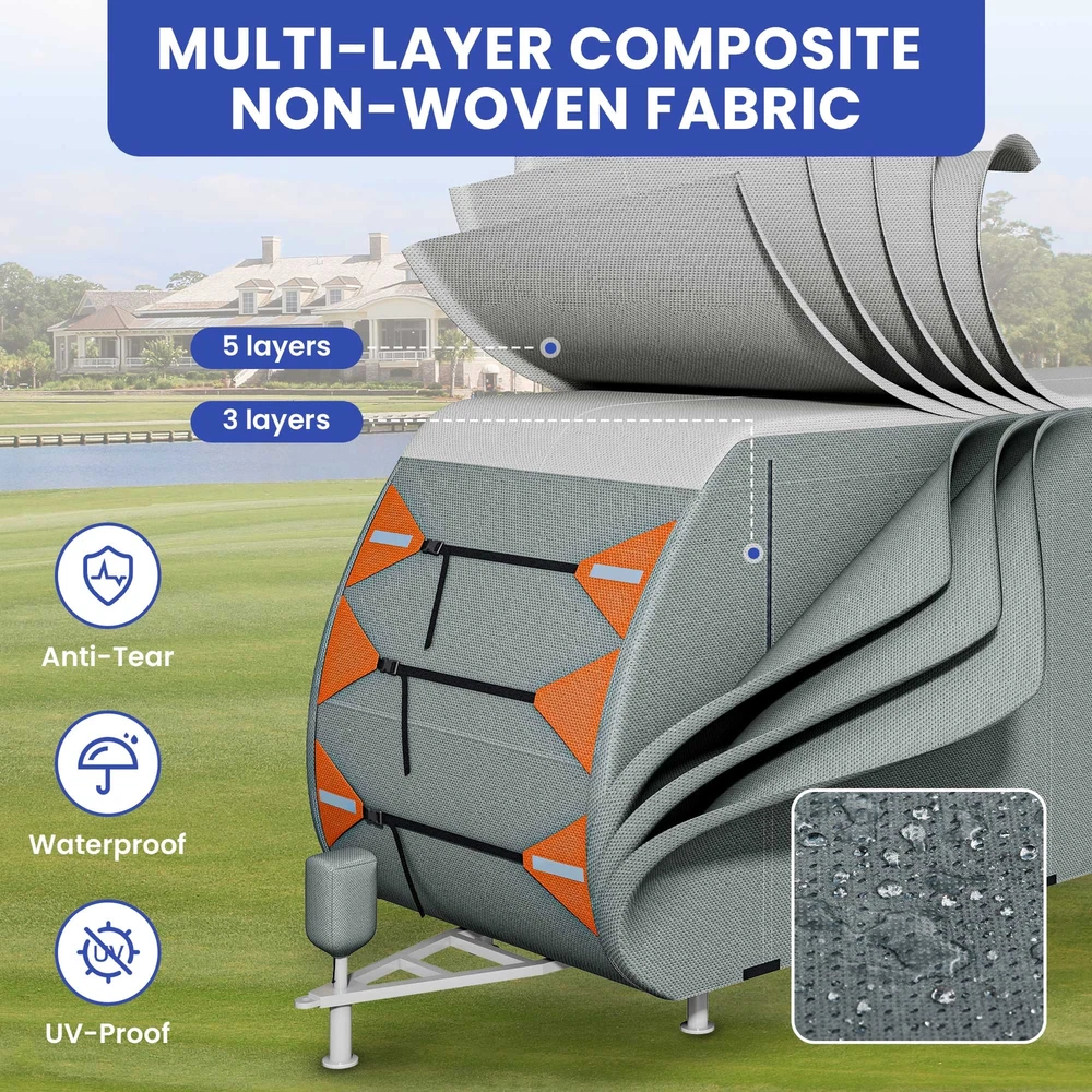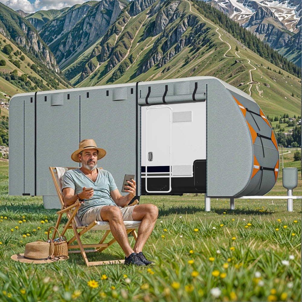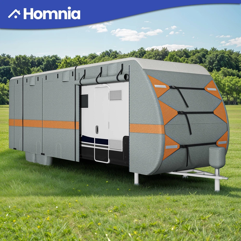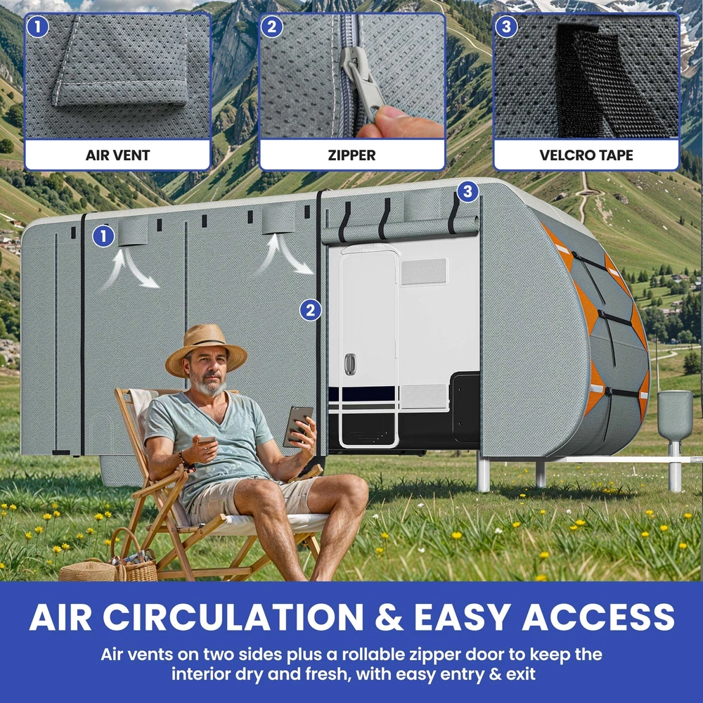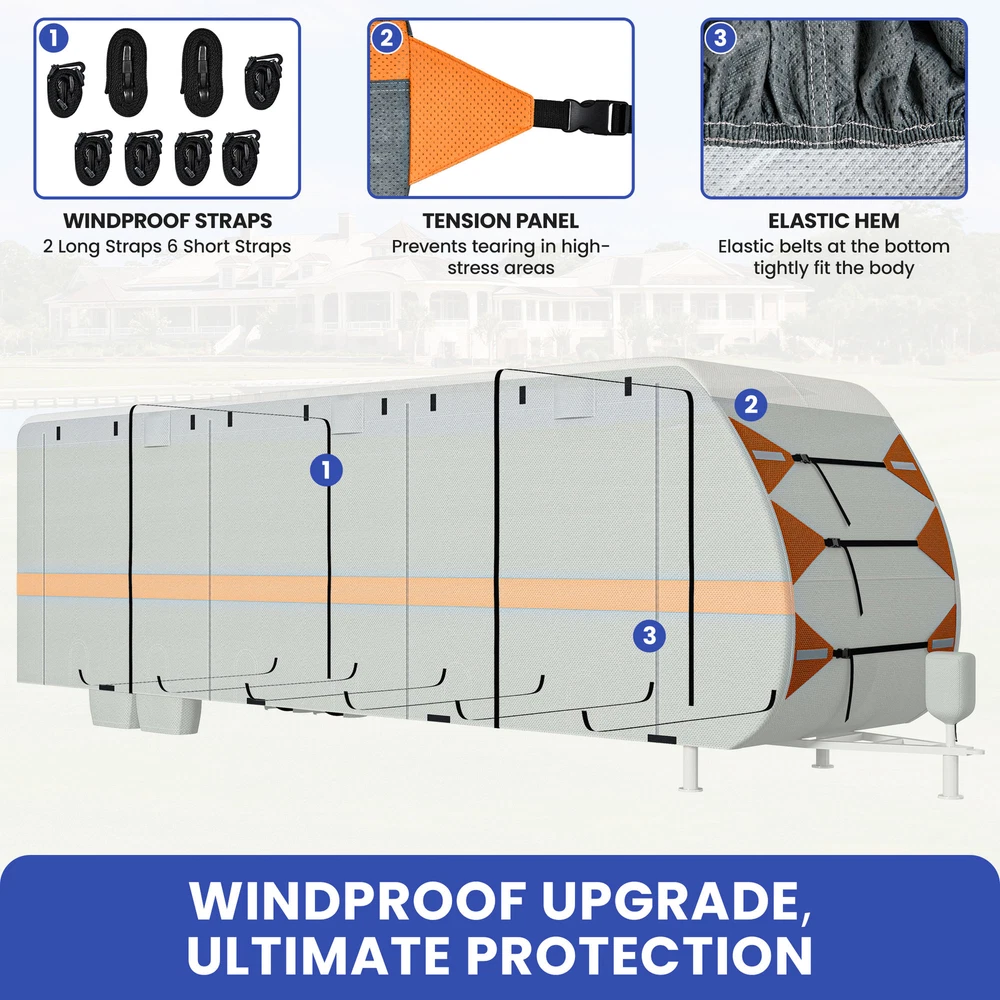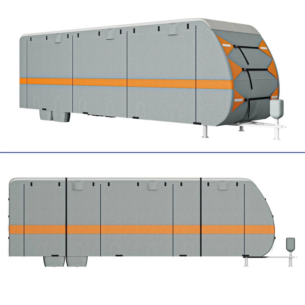 27-30FT Snow Proof RV Cover Tearproof w/ Vent Holes Camping Car Trailer Cover Product Description NOTE: Professional Installation would be Highly Recommended. Description: 1. Material: Multi Layered Composite Non Woven Fabric 2. Color: Grey 3. Item Included: 1 travel trailer RV cover, 4 tire covers, 1 storage bag, 1 tongue jack cover, 6 gutter covers, 2 repair patches 4. Features: Rainproof, UV Resistant, Anti Tear, Air Circulation, Easy Access, Vent, Velcro Straps Features: Windproof Camper Cover: Designed for strong stability and enhanced wind resistance, this cover includes extra-long windbreak straps, side tension panels, and front tension panels. These elements work together to keep your RV securely covered, even in harsh weather conditions. Ventilation and Accessibility: Equipped with air vents on both sides, the cover efficiently reduces wind stress and promotes quick drying, helping your RV withstand strong winds and heavy rain. Additionally, the rollable zippered door allows easy access to the RV and engine areas for convenient inspections and maintenance. Built for Protection: Featuring an upgraded extra thick 5-layer anti-UV fabric for the top panel, this cover is resistant to tears, scratches, and daily damage. It provides all-season protection against harmful UV rays, heavy rain, and snow, ensuring your RV remains in pristine condition. Weatherproof RV Cover: 27-30FT Travel Trailer Cover is a must-have for RV owners, perfectly fitting 27-30FT RVs. It includes 4 tire covers, a storage bag, a tongue jack cover, 6 gutter covers, and 2 repair patches, ensuring comprehensive protection and utility for your travel trailer. Dimensions: 1. Overall Size: Fits 27-30FT RV 2. Item Weight: 43.3 lbs Package Included: 1. 1 x Set of RV Fabric Cover 2. 4 x tire covers 3. 1 x storage bag 4. 1 x tongue jack cover 5. 6 x gutter coverr 6. 2 x repair patches Shipping 1. Normally the item will be dipatched within 1 business day if payment is cleared before 12pm PST. 2. Please verify the correct shipping address in your PayPal account before making the payment. We only dispatch the item to the address that is sent to us at the time of checkout. 3. We don't ship to Hawaii, Alaska, Puerto Rico, APO/FPO/PO Boxes. 4. We don't provide local pick-up service. 5. Normally we will use USPS, UPS, FedEx & LTL to dispatch items. Payment 1. We accept PayPal and credit card. 2. We will ship to the confirmed Paypal shipping address that is provided with the payment only. Return 1. 30 days Money Back Guarantee. 2. Please contact our customer service to receive a RMA form first if want to return the item. 3. All returned items MUST in new condition with the original package. Contact If has any problem, please contact us by sending an ebay message. Our customer service will resolve the problem as soon as possible. On Aug 20, 2024 at 05:04:22 PDT, seller added the following information: