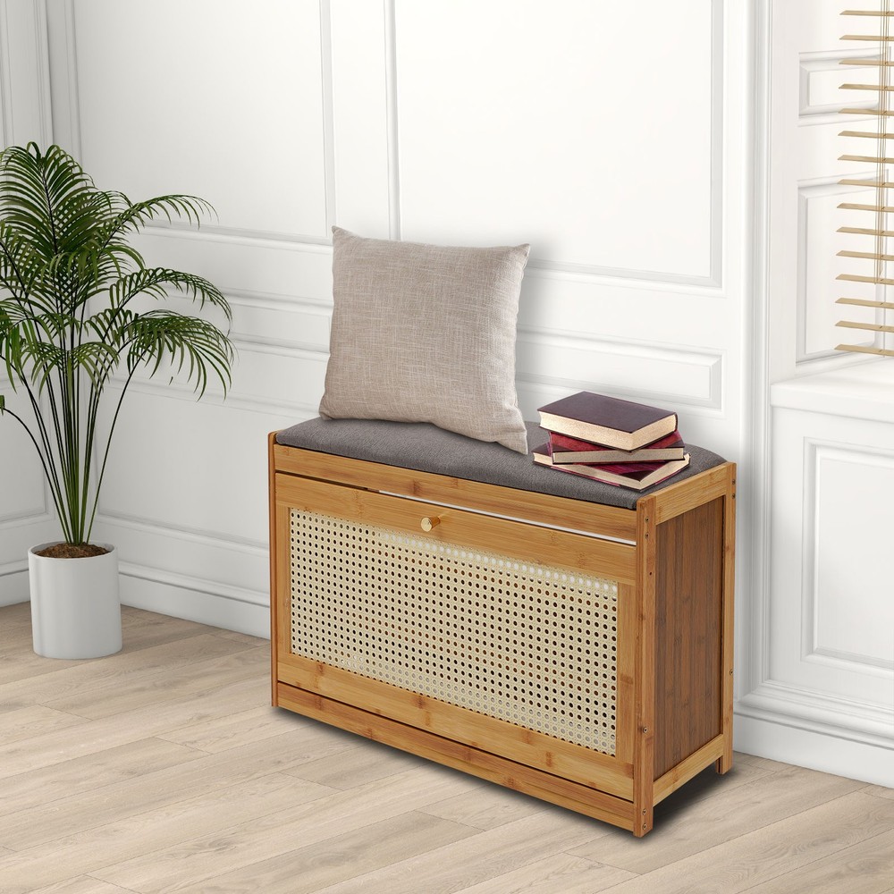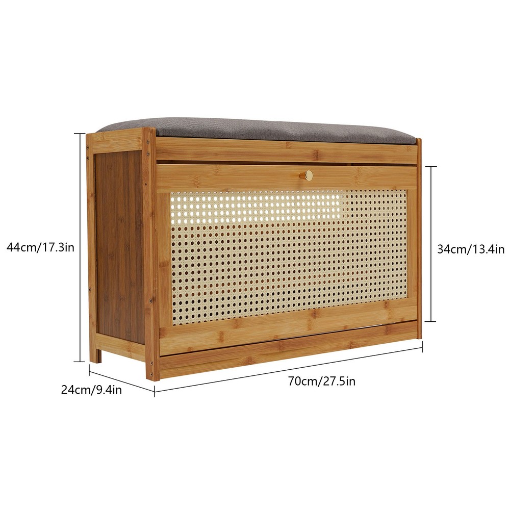 27.5" Shoe Storage Bench Shoe Organizer Wood Shoe Storage Stool Shoe Bench Description Do you hate coming home to a mess of shoes? Why not take a look at this shoe storage stool from us? It is made of high-quality premium materials and has a removable cushion. The exquisite workmanship provides it with unparalleled sturdiness and durability. The two-tier space allows you to store and organize your shoes, and tidy up your entryway. Key Features Durable and Sturdy: It is made of bamboo and composite board and adopts a spraying paint process, which is hard, e nvironmentally friendly, corrosion-resistant, and insect-resistant , ensuring a long service life. Comfortable Experience: The cushion with a built-in sponge allows you to comfortably sit and change your shoes, which is very convenient. Thoughtful Design: This product adopts a flip d oor design, making it easy to open and close. It is effective in preventing puppies from chewing on your shoes. In addition, the ABS door with small holes ensures air circulation in the cabinet and makes the shoes dry, avoiding producing an unpleasant odor. Large Capacity: With a two-tier storage space, it can easily store your daily shoes, and the middle shelf can removed to change the tier spacing, allowing you to store different kinds of shoes. Multi-functional Use: It can work as a stool and a shoe storage cabinet at the same time, solving the shoe storage problem at the entrance and providing a comfortable shoe-changing experience, ideal for families. Strong Load-bearing: Sturdy materials and stable construction provide an effective weight bearing of approximately 220.5 lbs, allowing you to sit down and change your shoes with confidence. Simple Aesthetic Style: The pleasing wood color and intricate mesh weave pattern create a touch of elegance and casualness. It blends well with a variety of interior styles to enhance home taste. Easy to Clean: The smooth surface and simple structure allow you to easily wipe away stains with a soft cloth, creating a clean and healthy environment for you. Customer Service: We aim to provide quality products and services. If you have any problems, please feel free to contact us. We will reply and solve the problem for you as soon as possible. Details Raised Bottom: It allows for convenient floor cleaning and can prevent moisture. Rotary Shaft Bracket: It has a certain buffering effect and reduces the noise when opening and closing the door. Hardware Handle: It facilitates the opening and closing of the door while adding a touch of design to the whole product. Non-slip Bottom Feet: They can effectively stabilize the shoe-changing stool and prevent accidental slipping. Smooth Edges: The smooth and burr-free edges enhance the beauty of the product and better care for your skin when installing and cleaning it. Application It is suitable for storing all kinds of shoes, ideal for placing in the entryway, bedroom, or parlor. Specification Material: Bamboo, Composite Board, ABS, Sponge, Linen, Hardware Color: Wood Shape: Rectangle Process: Spray Painting Mount Type: Free Standing Assembly Required: Yes Overall Load-bearing Capacity: About 100kg/ 220.5 lbs Door Width: 34cm/13.4in Overall Product Size: 70*24*44cm/27.5*9.4*17.3in Package Included 1* Shoe Storage Stool 1* Glove All Accessories for Assembly Notes Please note that shoes are not included. Please do not collide, knock, or rub with hard objects to avoid scratching or damaging the gloss of the product surface. Please do not use corrosive detergent, or hard objects for cleaning. It is recommended to use a soft cloth for wiping. Please check the color and size before purchasing. Bamboo products are made of natural materials, which will inevitably lead to different textures, knots, halos, gaps, and spots, but they will not affect beauty and use. Bamboo products should not be exposed to the sun, or in a dark, and humid place for a long time to avoid cracking, deformation, and mildew. Please note that the number of shoes that can be stored will vary depending on the size and height of the shoes. Please allow the slight color difference caused by the shooting light and 1-3cm error due to manual measurement and make sure you do not mind before ordering. Payment Delivery details Terms of sales About us Contact us Payment We accept ebay payment 。 Fees such as import duties, taxes are not included in the item price or shipping costs. These charges are the buyer's responsibility. Delivery details Shipping: 2-9 working days to: USA Terms of sales We maintain high standards of excellence and strive for hundred percent customer satisfaction. Feedback is very important to us. We hope that you contact us immediately before you give neutral or negative feedback, so that we can address your concerns. It is impossible to address issues if we do not know about them! About us Your satis faction is our ultimate goal. We work hard to earn your trust and future business. Our certified technicians have tested each item before shipping. The unit comes with 1 year limited warranty on all manufacturing defects. a) If you receive a defective item, you may return it or ask for a discount. Please contact us within 14 days after you receive the package. b) What you returned must be intact and in its original packaging as re? u. Customer is responsible for shipping costs of the returned item. c) We will cover the cost of shipping back t with the shipping rate indicated in the registration page. We will send you a new unit or refund the full payment you paid. Thank you. Contact us Business Hour Business Hour: Monday To Friday: 8:30 AM to 5:00 PM (Beijing China time) Due to time zones, our reply to your questions may not be immediately. But within above working time, we will reply your email within 24 hours. If it's non-workdays, please kindly be patient and wait till Monday. Please contact us with ebay message. Please feel free to contact us if you have any questions. Monday To Friday: 8:30 AM to 5:00 