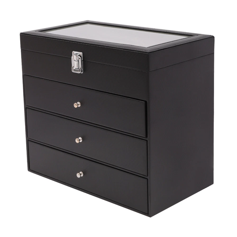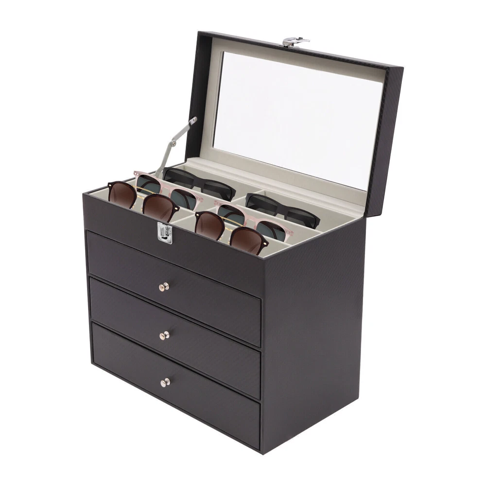 Application This storage box can hold all kinds of glasses, watches, and all kinds of accessories. This beautiful organizer is suitable for home or travel storage and gift-giving. Specification Material: Carbon Fiber PU, Medium Fiber Board, Hardware Locking, Velvet Fabric, Glass Color: Black Function: Dustproof Number of Layers: 4 Shape: Rectangular Gross Weight: 4kg/8.82lbs Net Weight: 3.5kg/7.72lbs Each Glasses Storage Slot: 16*6*4cm/6.3*2.4*1.6in Product Size: 33.5*19*29.5cm/13.2*7.5*11.6in Package Size: 35*22.5*34cm/13.78*8.86*13.39in Package Included 1* Sunglass Storage Box 27-Grids Eyeglass Sunglasses Glasses Storage Display Box Holder Organizer Case Description Are you still worried about not being able to find a certain pair of glasses or a certain piece of jewelry? If you want to find your glasses or other jewelry easily, then you definitely need this organizer. Its four-layer structure can hold enough glasses, watches, and jewelry. And the lockable design can also ensure your privacy. In addition, the clear glass design at the top allows you to display your beautiful glasses or accessories. This storage box can hold all kinds of glasses, watches, and all kinds of accessories. This beautiful organizer is suitable for home or travel storage and gift-giving. Specification Material: Carbon Fiber PU, Medium Fiber Board, Hardware Locking, Velvet Fabric, Glass Color: Black Function: Dustproof Number of Layers: 4 Shape: Rectangular Gross Weight: 4kg/8.82lbs Net Weight: 3.5kg/7.72lbs Each Glasses Storage Slot: 16*6*4cm/6.3*2.4*1.6in Product Size: 33.5*19*29.5cm/13.2*7.5*11.6in Package Size: 35*22.5*34cm/13.78*8.86*13.39in Package Included 1* Sunglass Storage Box Key Features Storage Assistant: The multi-layer design of this box allows you to store different accessories in different categories. You will say goodbye to the difficult search in the pile of cluttered glasses and jewelry with it. Excellent Dustproof Function: The top of this box is equipped with a buckle to improve sealing, which can effectively block dust. And the drawers are tightly connected to well protect the glasses and jewelry from the outside environment. More Decorative: This organizer has a sophisticated look and does not take up too much space. Place it on your dresser not only to store your glasses and watches but also to decorate your dresser and show your unique taste. High-quality Material: This stylish organizer is made of moisture-proof carbon fiber PU, which is waterproof and easy to clean. The inner compartment part is a medium fiberboard made by high-temperature pressing after the plant fiber is crushed, which is environmentally friendly. Enough Space: This organizer has a total of three layers of 6 slots for glasses and one layer for watches, necklaces, and bracelets, which can hold up to 18 pairs of glasses, 6 watches and many valuables. With it, you don't have to worry about the lack of storage box capacity! Exquisite Gift: The product's elegant appearance and thoughtful design make it a good gift for mothers, wives, friends, colleagues, etc. Ready to Use: It has a one-piece design without the need for installation. You can use it directly after you receive it, which is very convenient. Easy to Access: The transparent design at the top allows you to clearly see your various collections and various styles of eyeglasses at a glance, greatly reducing the time spent searching for items. Details Interior Velvet: The box is fully lined with soft velvet, which effectively protects the watch and jewelry from scratches. Removable Pillow: The small fleece pillow in the irregular storage slot can be removed. If necessary, you can then remove it to provide space for more things. Scratch-resistant Glass Top: We use clear glass as the top window because it helps to display your collection beautifully and you can easily pick your favorite pair of glasses for any occasion. What's more, the glass material is hard to scratch and its lifespan is longer. Notes Please allow the slight color difference caused by the shooting light and 1-3cm error due to manual measurement. Please make sure you do not mind before you order. Payment Delivery details Terms of sales About us Contact us Payment We accept ebay payment 。 Fees such as import duties, taxes are not included in the item price or shipping costs. These charges are the buyer's responsibility. Delivery details Shipping: 2-9 working days to: USA Terms of sales We maintain high standards of excellence and strive for hundred percent customer satisfaction. Feedback is very important to us. We hope that you contact us immediately before you give neutral or negative feedback, so that we can address your concerns. It is impossible to address issues if we do not know about them! About us Your satis faction is our ultimate goal. We work hard to earn your trust and future business. Our certified technicians have tested each item before shipping. The unit comes with 1 year limited warranty on all manufacturing defects. a) If you receive a defective item, you may return it or ask for a discount. Please contact us within 14 days after you receive the package. b) What you returned must be intact and in its original packaging as re? u. Customer is responsible for shipping costs of the returned item. c) We will cover the cost of shipping back t with the shipping rate indicated in the registration page. We will send you a new unit or refund the full payment you paid. Thank you. Contact us Business Hour Business Hour: Monday To Friday: 8:30 AM to 5:00 PM (Beijing China time) Due to time zones, our reply to your questions may not be immediately. But within above working time, we will reply your email within 24 hours. If it's non-workdays, please kindly be patient and wait till Monday. Please contact us with ebay message. Please feel free to contact us if you have any questions. Monday To Friday: 8:30 AM to 5:00 PM (Beijing China time) Due to time zones, our reply to your questions may not 
