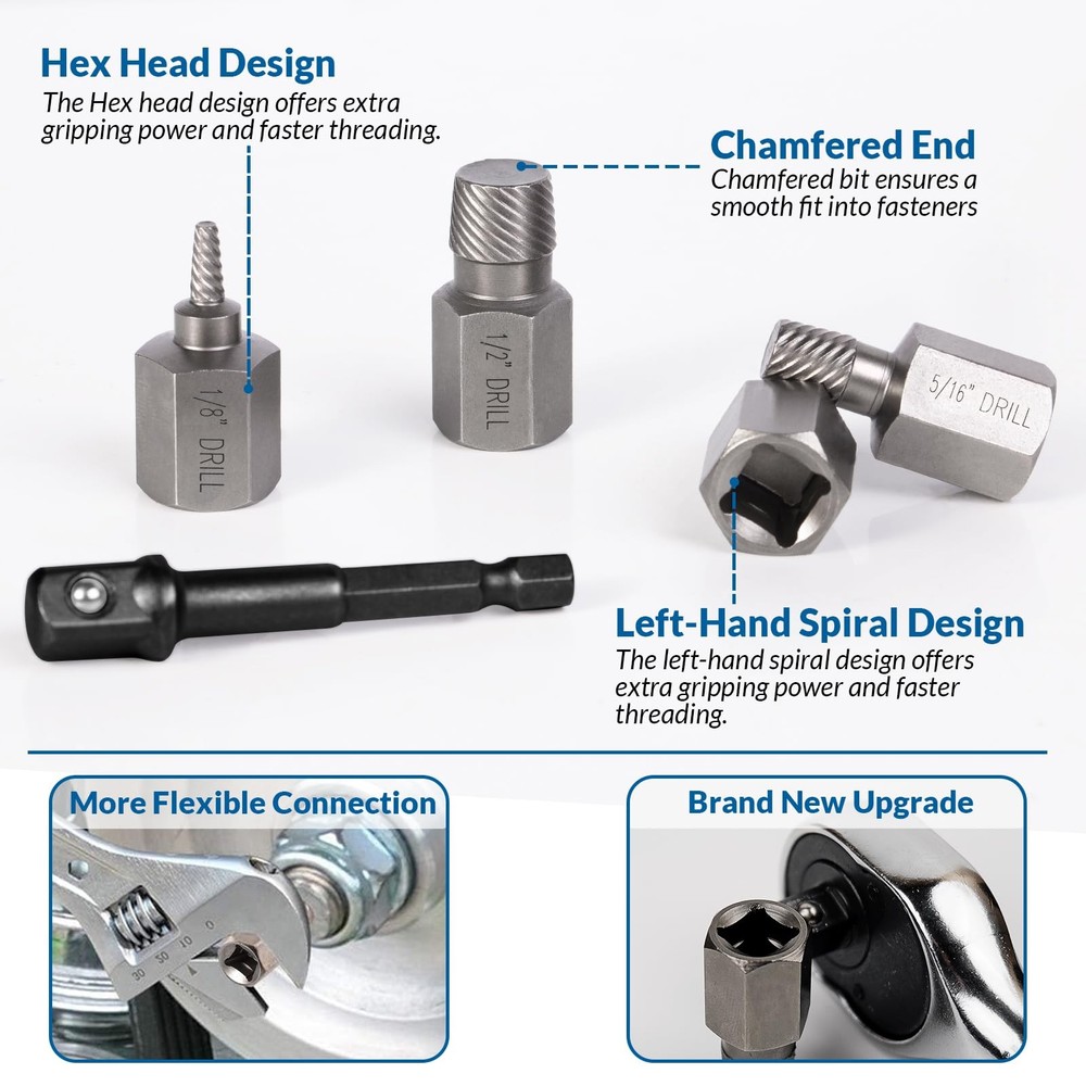 The 27PCS Screw Extractor Set is a comprehensive tool kit designed to help professionals and DIY enthusiasts easily remove damaged studs, bolts, and screws. This set is perfect for various applications such as automotive repairs, construction projects, and household maintenance. The extractor set includes 27 different pieces, each specifically designed to tackle different sizes and types of damaged fasteners. The set features a 3/8" inch drive hex-head, providing a secure grip and compatibility with standard ratchets, sockets, and wrenches. The multi-spline rounded bolt remover tool is the highlight of this set. It is engineered with precision to grip rounded, damaged, or stripped bolts and screws firmly. This allows for effective extraction without further damaging the surrounding materials. Crafted from high-quality materials, the screw extractor set is built to withstand heavy-duty use and provide long-lasting performance. The reliable construction ensures that the extractors maintain their shape and grip, even when dealing with stubborn or rusted fasteners. Using the 27PCS Screw Extractor Set is straightforward and user-friendly. Simply select the appropriate extractor from the set, insert it into the damaged fastener, and apply clockwise force to loosen and remove the fastener. The set also comes with a handy storage case, keeping all the pieces organized and easily accessible. Investing in the 27 PCS Screw Extractor Set will save you time and effort when dealing with damaged fasteners. No more frustration or wasted money on expensive replacements - this set provides a cost-effective solution to remove damaged screws, bolts, or studs with ease and precision. 【Easy Removal】Our bolt extractor set come with double head stud extractor set can be connected directly with a wrench, without the need for a connecting sleeve. Solve the problem of difficulty in removing damaged bolts in tight spaces. 【Portable and Storable】This easy out extractor set is placed in a storage box for easy access and portability, you can perform maintenance like a pro anytime anywhere. Multi spline extractor removal tool is also easy to operate for a bike, boat, truck or SUV. 【Sturdy and Solid】Each stripped screw and bolt extractor is made of high hardness chrome-molybdenum steel for superior durability. The material of molybdenum steel and the complex processing make the extractor harder. Each surface is precision machined and resistant to corrosion. Internal left-handed spiral design for extra grip and faster tapping. 【Excellent Compatibility】All the stud removal socket set's sizes are engraved on the socket for easy identification.The screw bolt extractor remover contains 7/8",27/32",13/16",25/32",3/4",23/32",11/16",21/32",5/8",19/32",9/16",17/32",1/2",15/32",7/16",13/32",3/8",11/32",5/16",9/32",1/4",7/32",3/16",5/32",1/8", and a 3/8"-1/4" hex adapter, a 3/8"-1/2" hex adapter, meets almost all your needs. 【Versatile usage】Suitable for both power tools and hand tools, including Wrench/ Ratchet/ Drill/ Impact. The high-density spiral design helps faster remove broken screws, bolts, nuts, studs, fittings, threaded pipes, and pins. Not only as automotive tools, but also as a helper of home decor or craft production.