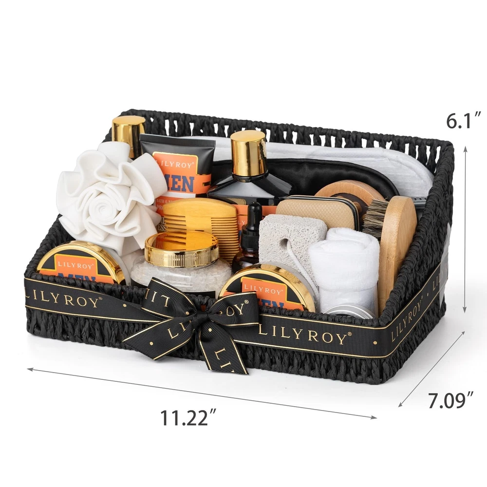 27Pcs Valentines Day Gifts Spa Gift Basket for Men - Bath and Body Gift Basket Set for Dad with Massager | Perfect Gifts for Christmas, Fathers Day, Birthday Gift Beard Bath Spa Gift Set for Men Product Details Scent: Oak Sandalwood Brand: LILY ROY MPN: LR2025013 UPC: Does not apply EAN: Does not apply Item Form: Liquid Scent: Oak Sandalwood Brand: LILY ROY Product Benefits: Brightening, Cleansing, Moisturizing, Nourishing, Smoothing, Softening Skin Type: Combination, Dry, Normal, Oily Package Dimensions : 11.18 x 7.72 x 6.81 inches; 4.41 Pounds Manufacturer : LILY ROY Best Sellers Rank: #108,693 in Beauty & Personal Care (See Top 100 in Beauty & Personal Care) #329 in Bath & Shower Sets #329 in Bath & Shower Sets Customer Reviews: 4.7 4.7 out of 5 stars (406) 27 PCS SPA GIFT BASKETS FOR MEN: 210mL Shower Gel, 210mL Beard Wash, 100mL Beard Conditioner, 50mL Aftershave Balm, 50mL Body Scrub, 30mL Beard Oil, 250g Bath Salt, 150g Bath BOMB, 20g Beard Wax, 8pcs Nail Tool Set, Eva Puff, Bath Towel, Beard Brush, Beard Comb, Wooden Massager, Silk Eye Mask, Slippers, Pumica packaged in a nice natural beautiful basket. The 27 pcs men spa set offers the most luxurious and perfect bath experience BATH GIFT BASKET SET FOR MEN: Sandalwood has a warm, forest scent, and this bath set creates a warm feel like a holiday CHRISTMAS SPA GIFT SET FOR MEN: Lily Roy's at-home spa kit for men contains premium quality and Mit Free, Paraben-Free, Cruelty-Free shower spa essentials that are rich in Vitamin E, Shea Butter, and Essential Oil to help moisturize and soothe the skin SPA GIFTS FOR MEN: Great gift baskets for men on Valentine's Day, Father's Day, Anniversary, Birthday, Christmas. The recipient will like it COMES WITH A REUSABLE WEAVED BASKET: Its upscale and beautiful basket makes a multi-purpose storage solution to keep your beauty essentials. It also creates a unique decoration for your bathroom, vanity table, powder area, and more. It also has a gift note card for you to personalize it