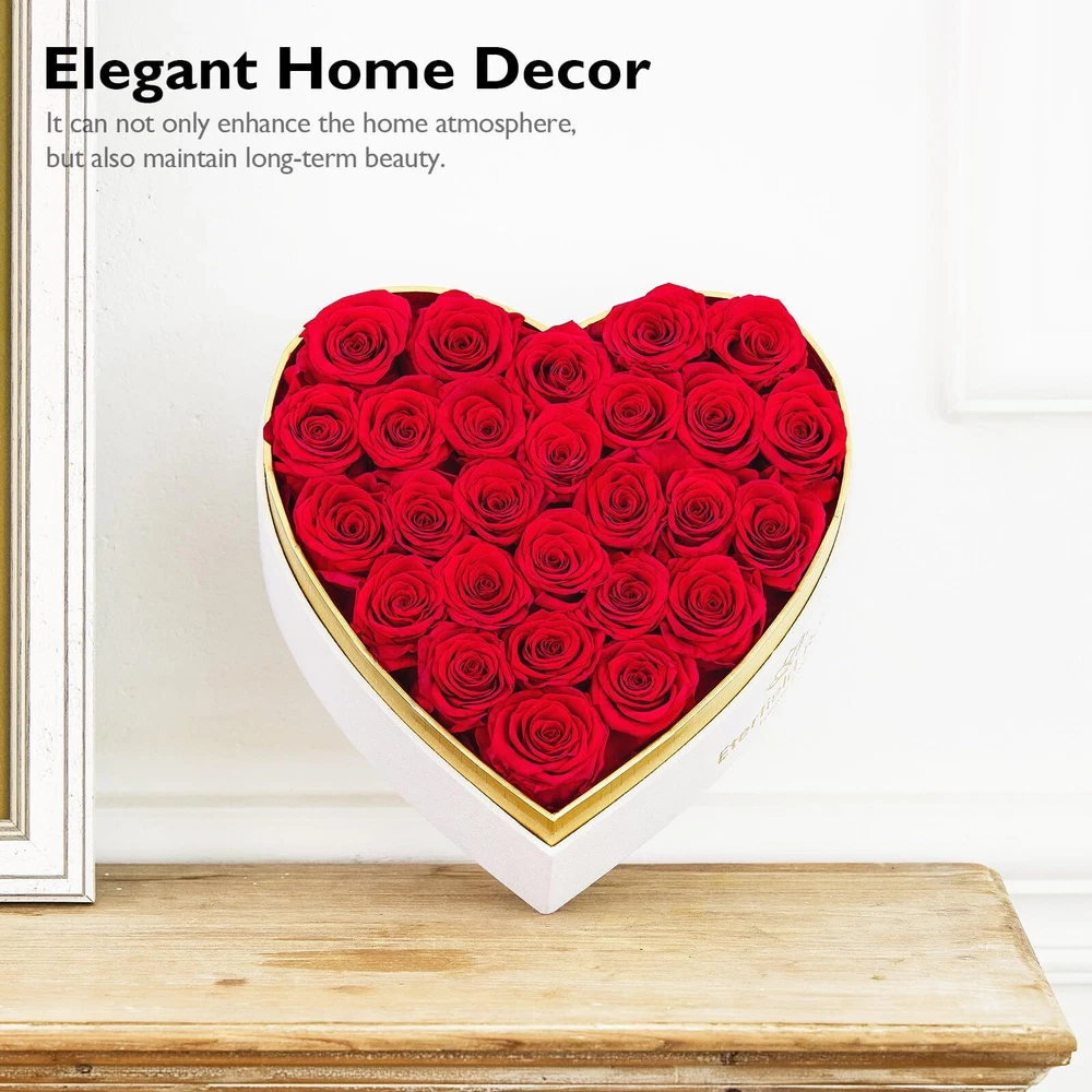 100% Real Rose - Our preserved roses are hand-picked at peak freshness and carefully arranged in variety of colors, styles, and looks by our master florists. Unique Roses Box Gift: 27-piece long lasting roses are arranged in a white heart-shaped suede box to give your significant ones a gift that represents your love. The transparent PVC cover not only effectively protects the roses from dust or damage, but also adds a sense of fashion and elegance to the entire preserved roses box. Roses that last over a year: Every preserved rose undergoes a cutting-edge method which allows them maintain their beauty and color for at least a year. With our long lasting rose, we offer an elegant, luxurious way to create lasting moments with the people you cherish most. Not just once, but every day, all year. Ultimate Gift for Her: Whether it's Birthday, Anniversary, Valentine's Day or any other special occasion, our eternal roses Gift Box will be a perfect gift. They are a symbol of love and will be cherished for years to come. Maintenance-Free: They will not wilt, fade, or lose their petals like fresh flowers. There is no need for water, no need for sunlight, easy to care for, just enjoy the forever beauty.