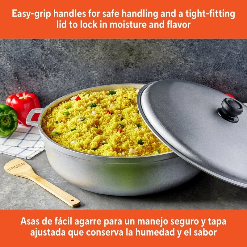 You may also like 6 Qt Nonstick Jumbo Cooker Pots Dishwasher Oven Safe Durable Aluminum Aqua New 24.55 USD 25.84 USD Free shipping 5% off Non-Stick 5 QT Saute Pans W/ Glass Lid Handles Stainless Steel Base Oven Safe US 38.9 USD 40.95 USD Free shipping 5% off 5 Quart Non-Stick Dutch Oven W/ Venting Lid Easy Meal Prep Induction Safe New 45.08 USD 47.45 USD Free shipping 5% off 13"Saute Pan W/ Glass Lid Non-Stick Coating Dishwasher Safe Kitchen Aluminum Red 56.96 USD 59.96 USD Free shipping 5% off The 27Qt Basic Caldero is an essential piece in every Hispanic kitchen, renowned for its durability and unique design. This caldero is manufactured in Colombia and is made of cast aluminum with a natural finish cooking surface that seasons over time. This cookware piece has a capacity of 27Qt. The Basic Caldero includes its tight-fitting lid, steam vent for moisture control, and a convenient knob and side handles for safe operation. The thick walls will deliver consistent and delicious results each time. With this versatile piece, you can cook a variety of different meals. Whether creating gourmet dishes, cooking rice, simmering beans, braising meats, preparing stews, crafting sauces, or enjoying comfort foods, the Basic Caldero excels. The Basic Caldero is oven-safe without the lid, making it perfect for grilling and baking. After cooking, take this caldero straight from the kitchen to the table as a stylish serving dish. Trust the Basic Caldero for balanced, home-cooked meals. It will surely become your kitchen's beloved companion, uniting tradition, and innovation in every delectable creation. Elevate your culinary experience with this enduring symbol of Hispanic heritage. LARGE COOKING CAPACITY: This caldero has a capacity of 27 quarts, making it ideal for substantial meal sizes effortlessly, providing extensive versatility in various cooking applications DURABLE AND RELIABLE: Made of cast aluminum for reliable durability, with a cooking surface that seasons over time for enhanced flavor TRADITIONAL AND CONVENIENT DESIGN: provides even heat distribution and oven safety without lid, and also features easy grip handles and tight-fitting glass lid with steam vent CULINARY ADAPTABILITY: Perfect for cooking rice, simmering soups, beans, sauces, stews, and a wide variety of other delicious dishes, this versatile caldero adapts to numerous cooking styles and recipes, making it an essential tool in any kitchen VERSATILE ESSENTIAL: Perfect for preparing a diverse array of traditional Hispanic recipes, making it an indispensable choice for everyday culinary endeavors