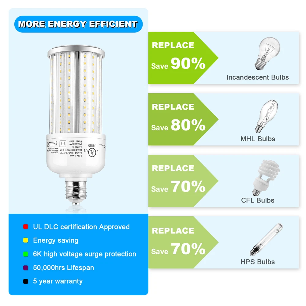 Product Description 27W LED Corn Light Bulb Warehouse Workshop Parking Lot Lighting 5000K Daylight Specification: Rated Power: 27W Base Code : E39 Light Bulb Base Type : Medium Base Power Factor: >90% Input Voltage: AC100-277V 50/60Hz LED Type:SMD2835 LED chips with 130-150Lm/W Luminous Flux(lm): 4,010Lm Color Temperature: 5,000K Color Rendering Index (RA) : >80 PFC: >90% Materials: Aluminum+ASA Certification: UL & DLC Not dimmable Notice: 1.The LED Corn bulb is wide input voltage(AC100V-277V) 2.Please turn off power before install or change assembly parts 3.Make sure to remove ballast or starter before install the lamps 4.The input voltage and lamps should be matched, after connecting the power line, please make sure the wiring section is insulated About Us Payment Shipping Terms Returns Contact Us 1. 10 Years LED Light Manufacturer 2. Certified Safety LED Light Products 3. US Warehouse Fast & Convenient Delivery 30,000 sq.ft production area &100 employees professional team. UL,cUL,cETL,ETL,DLC approved products standard produce by certified request. 6 separately production line strictly control quality & speed production Professional Aging test machine&SMT Machine&IES test system&Reflow oven 1. We only accept payment by PayPal . Your ebay address must match your paypal address. PO BOX can not delivered. 2. Please make payment within 7 days. If you don't need it, please inform us to cancel it, for eBay will open UNPAID dispute automatically in eighth day. 3. Paypal allows you to complete your purchase quickly and securely. It offers a variety of payment options including all the major card carriers. ★★★ ★ ★ USA Warehouse! 2-5days Fast shipping! 1. We will ONLY ship item to eBay physical Paypal address. Your eBay address must match Paypal address. 2. We ship daily Monday - Friday . All orders will be shipped within one working day after payment. 3. Tracking number will be upload on ebay within 24 hours after shipment. 4. Shipping Time: 2-5 working days for US buyers. ★ ★ ★ All of our products are shipped from our 3 different warehouses in the US.(KY/OH/TX) 1. Please kindly CONTACT US via eBay message if there is any problem, instead of Open Case or Return Requests, We will always try our best to solve the problem for you. 2. We provide a 30 days satisfaction or return guarantee for exchange or refund. 3. The package must be in its original packaging and include all of the original accessories or items that came with it when returning an item. The item and package should be in original and perfect condition. 1. Sellers pay return shipping costs. Sellers pay for return, replacement or exchange shipping if there's a problem with the item. For example, if the item a. Doesn't match listing description b. Damaged or defective when received c. Missing spare parts d. Counterfeit or imitation goods 2. Buyers need to pay return shipping costs. If the buyer changes mind about a purchase and wants to return an item, there may need to pay return shipping costs. For example a. Chose the wrong size or feel that the product is not suitable for buyers himself b. No need this product after received c. Find a more suitable price elsewhere than choose a return. 1.Office Time: 9:30 - 18:30, Monday - Saturday (UTC+8) 2.Please contact us with eBay Messa ge . 3.We will respond you within 24 hours on business day. Your feedback is very important to us, please leave us a Positive Feedback with all 5-star for the Detailed Selling Rating when you received the item. If there is some problem about the product, please take communication with us before leaving neutral/negative feedback or opening ebay/paypal case, we will do our best to resolve your problem. We try our best to reply to your emails as soon as possible, however, due to high volume of daily incoming emails and time zone difference; we may not be able to reply your emails immediately. Please allow 24 business hours for us to response. About Us 1. 10 Years LED Light Manufacturer 2. Certified Safety LED Light Products 3. US Warehouse Fast & Convenient Delivery 30,000 sq.ft production area &100 employees professional team. UL,cUL,cETL,ETL,DLC approved products standard produce by certified request. 6 separately production line strictly control quality & speed production Professional Aging test machine&SMT Machine&IES test system&Reflow oven Payment 1. We only accept payment by PayPal . Your ebay address must match your paypal address. PO BOX can not delivered. 2. Please make payment within 7 days. If you don't need it, please inform us to cancel it, for eBay will open UNPAID dispute automatically in eighth day. 3. Paypal allows you to complete your purchase quickly and securely. It offers a variety of payment options including all the major card carriers. Shipping ★★★ ★ ★ USA Warehouse! 2-5days Fast shipping! 1. We will ONLY ship item to eBay physical Paypal address. Your eBay address must match Paypal address. 2. We ship daily Monday - Friday . All orders will be shipped within one working day after payment. 3. Tracking number will be upload on ebay within 24 hours after shipment. 4. Shipping Time: 2-5 working days for US buyers. ★ ★ ★ All of our products are shipped from our 3 different warehouses in the US.(KY/OH/TX) Terms 1. Please kindly CONTACT US via eBay message if there is any problem, instead of Open Case or Return Requests, We will always try our best to solve the problem for you. 2. We provide a 30 days satisfaction or return guarantee for exchange or refund. 3. The package must be in its original packaging and include all of the original accessories or items that came with it when returning an item. The item and package should be in original and perfect condition. Returns 1. Sellers pay return shipping costs. Sellers pay for return, replacement or exchange shipping if there's a problem with the item. For example, if the item a. Doesn't match listing description b. Damaged or defective when received c. Missing spare