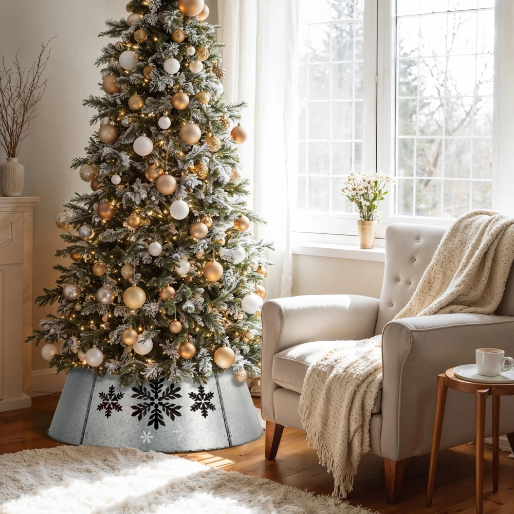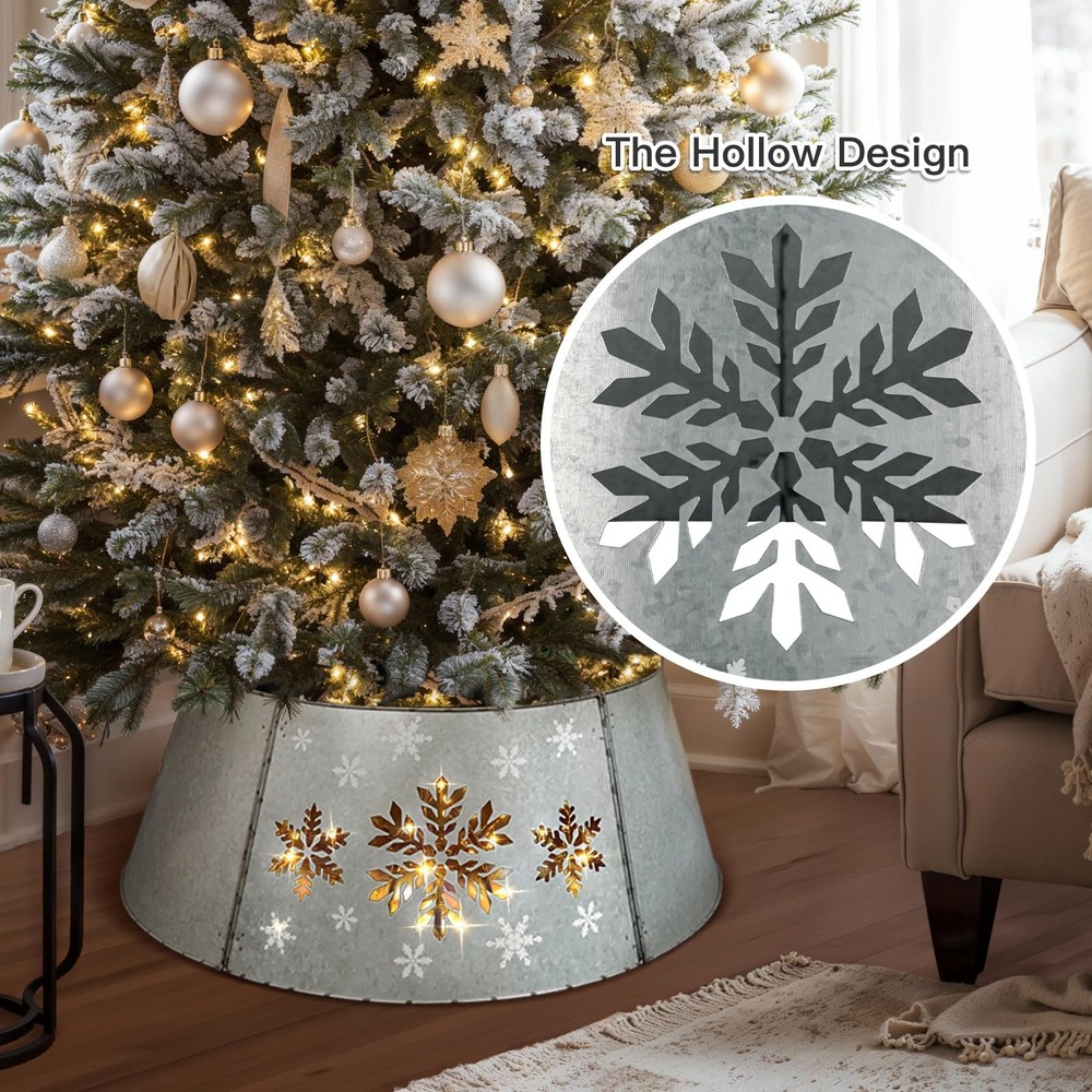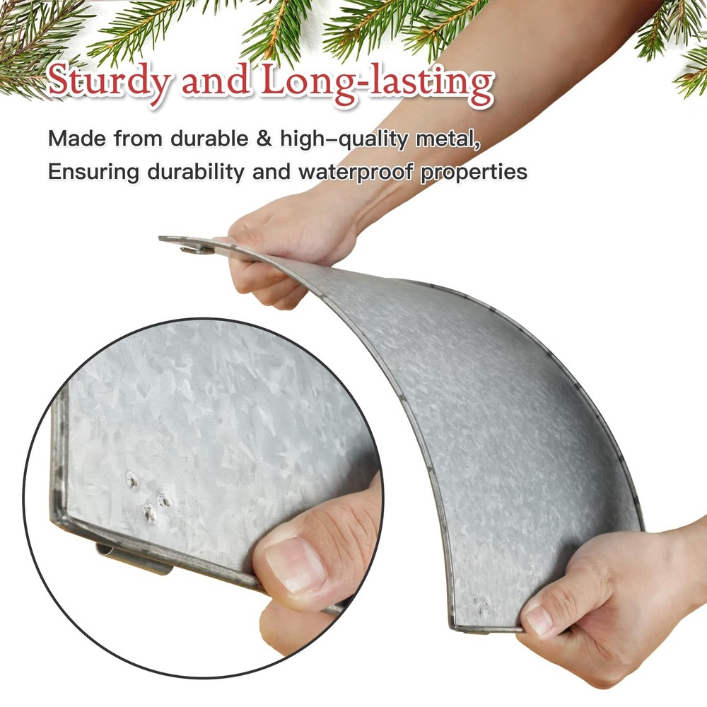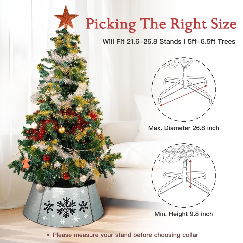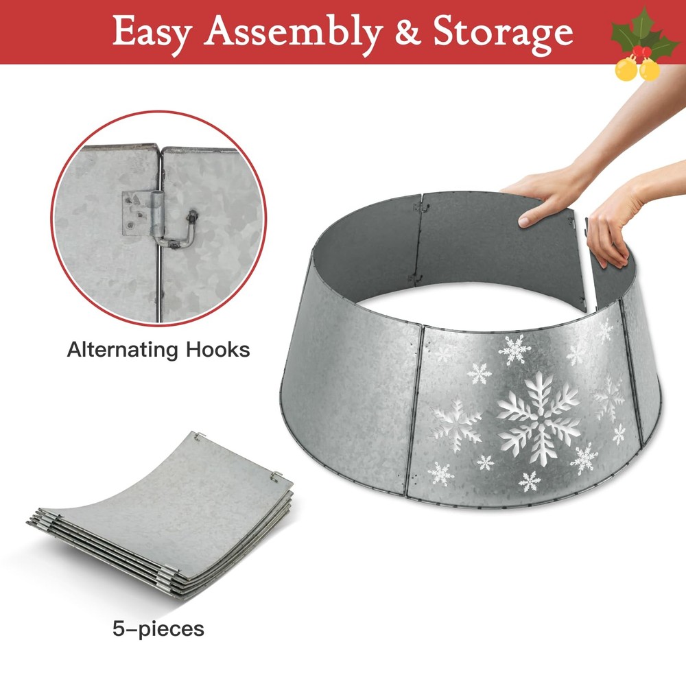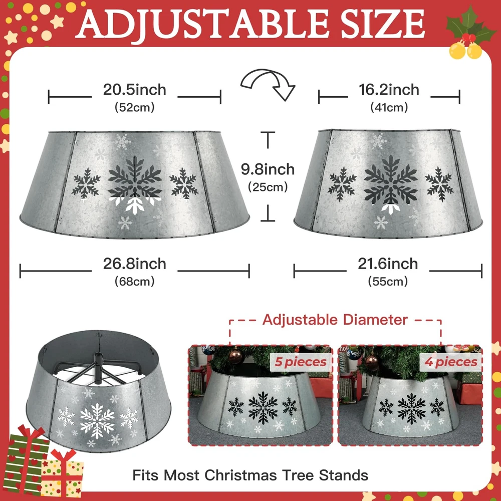 Quality Metal Material - The silver metal tree collar is made from high-quality metal, ensuring durability and waterproof properties. Its galvanized metal appearance exudes a rustic charm, giving it a classic countryside feel! Perfect Size Fits Most - Suitable for 6-7.5ft tall Christmas trees, for any Christmas tree stand with a diameter of less than 27in. You can adjust it by choosing how many panels to use as needed.√NOTE: Measure your body and tree stand before choosing a collar! Easy Assembly & Storage - Our Christmas tree stand cover comes in 5 pieces, with hardware included, making it easy to assemble in minutes. No tools are needed. It's also convenient to away after the holiday season. Reusable metal tree stand for Christmas trees! Alternative to Tree Skirt - Hide the artificial tree stand inside this Christmas tree ring and keep your puppy or cat away from the Christmas tree base! A great for traditional tree skirts, with no need to remove wrinkles! Holiday Decoration - The Christmas-themed patterns add a beautiful touch to your holiday atmosphere. This tree collar for pencil trees is a perfect gift for family or friends during the Christmas season.
