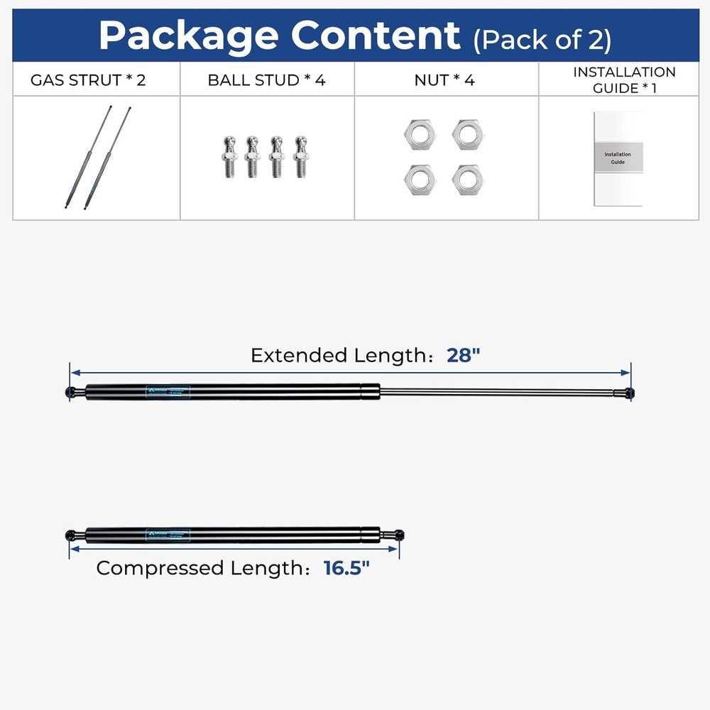 28 inch 200 Lb (889 N) Gas Struts Spring Shocks 28 in for 28 inch, Black Product Details Package Dimensions : 17.36 x 3.66 x 1.14 inches; 2.38 Pounds Item model number : ara_302a Manufacturer : ARANA Brand: ARANA Color: Black Material: Carbon Steel Auto Part Position: Rear Extended Length: 28 Inches Detailed Parameters: Extended Length: 28 inch, Force 200lbs Per Strut, 400lbs Per Pair! 2 Struts and 4 ball struts included in 1 Package (NO L MOUNTS) Multi-scenario Usage: ARANA 28 inch heavy lid gas struts are widely used on snowmobile sled trailer, heavy sled trailer cap, floor hatch trap door, outdoor well pit Precise Manufacturing: The gas struts sturdy, well-constructed and perform well, offering a controlled, gradual lift rather than a sudden jolt; With a 60lb capacity per strut, they provide enough support for heavy-duty lids