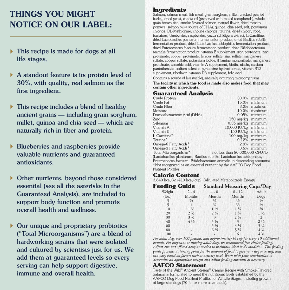 Taste of the Wild Ancient Stream Smoke-Flavored Salmon with Ancient Grains Dry Dog Food, 28-lb bag This smoke-flavored salmon dry dog food with ancient grains is crafted with real fish as the #1 ingredient and is high in protein (30%) to help support bones, joints and lean, strong muscles. Crafted with vitamins and minerals from real fruits, superfoods and ancient grains, omega fatty acids for skin and coat health and nutrients for the energy your furry friend needs thrive! Contains species-specific K9 Strain Proprietary Probiotics, along with antioxidants and prebiotics to help support healthy digestion, immune system health and overall health and wellness. Made in the USA by a family-owned brand that only uses quality ingredients from trusted domestic and global sources. A grain-inclusive recipe specially crafted for canine companions. Modern science proves that dogs share DNA with wolves. With Taste of the Wild Ancient Stream Smoke-Flavored Salmon with Ancient Grains Dry Dog Food, you can satisfy your canine’s carnivorous cravings, while also providing him with the proper ingredients and nutrition he needs to thrive. This recipe is crafted with fish along with healthy grains to support his overall health and well-being. With this recipe, you can give your dog a taste of the wild! Ingredients Salmon, Salmon Meal, Fish Meal, Grain Sorghum, Millet, Cracked Pearled Barley, Dried Yeast, Canola Oil (Preserved With Mixed Tocopherols), Whole Grain Brown Rice, Smoke-Flavored Salmon, Natural Flavor, Dried Tomato Pomace, Salmon Oil (A Source Of Dha), Quinoa, Chia Seed, Salt, Potassium Chloride, Dl-Methionine, Choline Chloride, Taurine, Dried Chicory Root, Tomatoes, Blueberries, Raspberries, Yucca Schidigera Extract, L-Carnitine, Dried Lactobacillus Plantarum Fermentation Product, Dried Bacillus Subtilis Fermentation Product, Dried Lactobacillus Acidophilus Fermentation Product, Dried Enterococcus Faecium Fermentation Product, Dried Bifidobacterium Animalis Fermentation Product, Vitamin E Supplement, Iron Proteinate, Zinc Proteinate, Copper Proteinate, Ferrous Sulfate, Zinc Sulfate, Manganese Sulfate, Copper Sulfate, Potassium Iodide, Thiamine Mononitrate, Manganese Proteinate, Ascorbic Acid, Vitamin A Supplement, Biotin, Niacin, Calcium Pantothenate, Sodium Selenite, Pyridoxine Hydrochloride, Vitamin B12 Supplement, Riboflavin, Vitamin D3 Supplement, Folic Acid. Contains A Source Of Live (Viable), Naturally Occurring Microorganisms. The Facility In Which This Food Is Made Also Makes Food That May Contain Other Ingredients. Caloric Content 3,640 kcal/kg, 413 kcal/cup