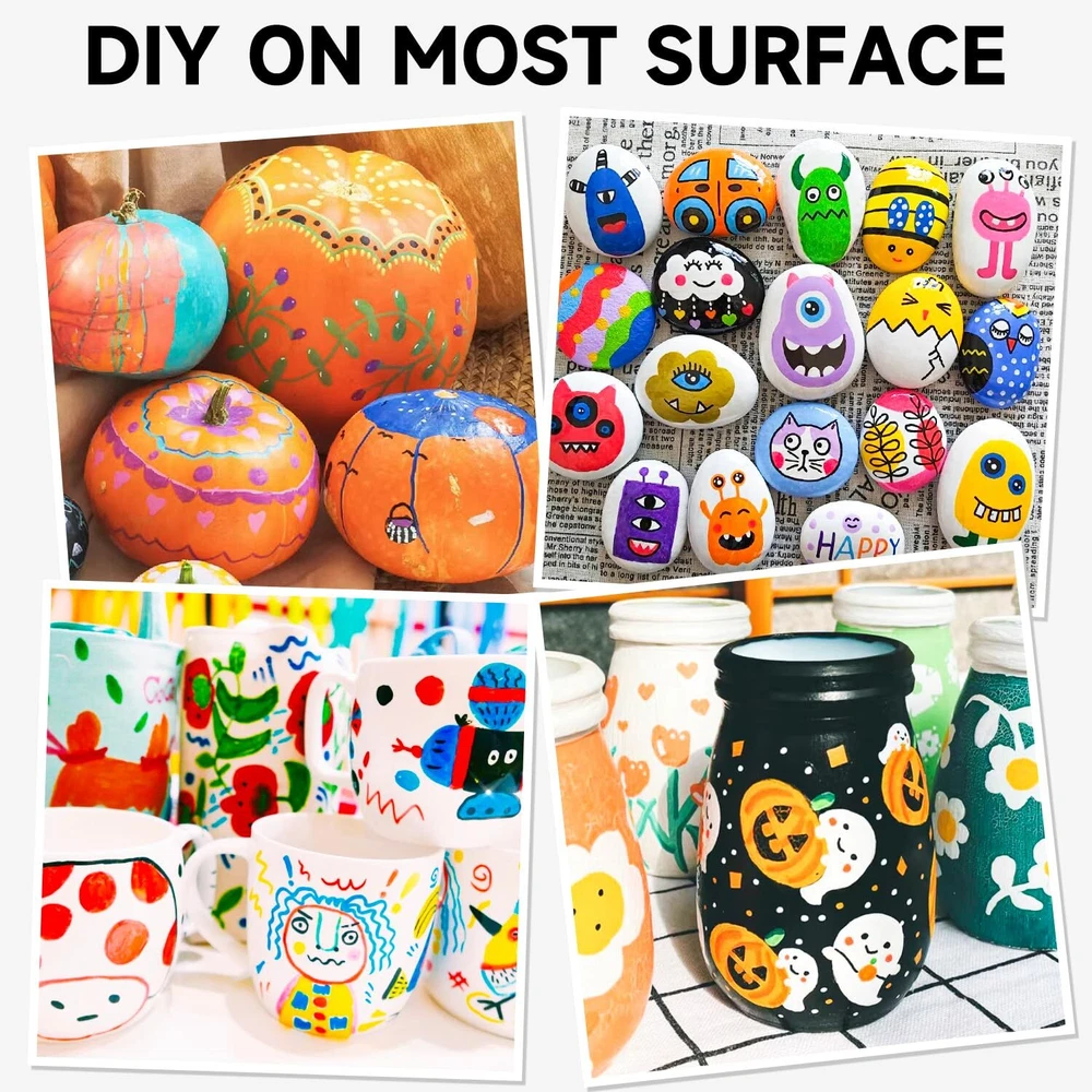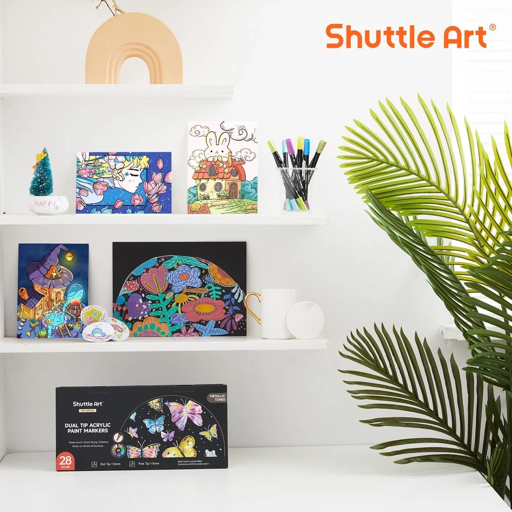 28 Metallic Colors Dual Tip Acrylic Paint Markers, Brush Tip and Dot Tip Acrylic Paint Pens for Rock Painting, Ceramic, Wood, Canvas, Plastic, Glass, Stone, Calligraphy, Card Making, DIY Crafts 【28 UNIQUE AND METALLIC COLORS】: Shuttle Art 28 acrylic paint markers set contains 28 METALLIC colors: With so much colors, you can almost complete all of your daily creations. 【UNIQUE DUAL TIP DESIGN】: Each acrylic paint marker come with a 1-5mm flexible fiber brush tip and 1-5mm flexible fiber dot tip. Our tips are made of special fiber material which is wear-resistant, no branching and durable for a really long time. 【MULTI-PURPOSE】: Enjoy creating art projects on a variety of surfaces, acrylic paint marker set suitable for rock painting, ceramic and mug painting, glass and wine glass painting, wood, fabric, stone, metal, plastic, canvas, Christmas ornament, Halloween pumpkin painting, calligraphy, scrapbook, bullet journal, brush lettering, custom mugs, DIY crafts projects, and much more for both smooth and porous surfaces. 【EASY TO UES】: These pens with new design, very easy to apply and no need to shake and press tips before using, you only need to open the cap to use pen.Warm tip: Please close the cap after use, it can keep the pen ink more smooth. 【SAFTY & SERVICE GUARANTEE】: Conforms to U. S. ASTM D-4236 & EN71-3, non-toxic and acid-free, safe and suitable for all ages. Your satisfaction is our top priority, please rest assured to purchase our products. If you are not satisfied with our products or have any questions, please feel free to contact us at any time.