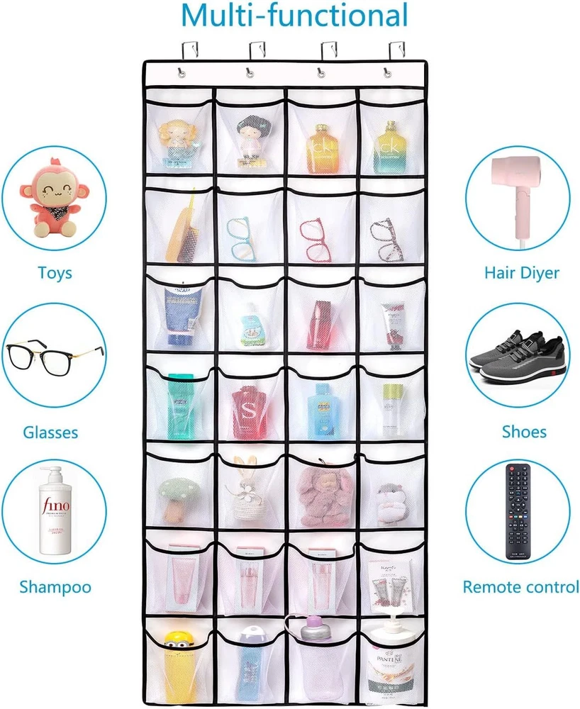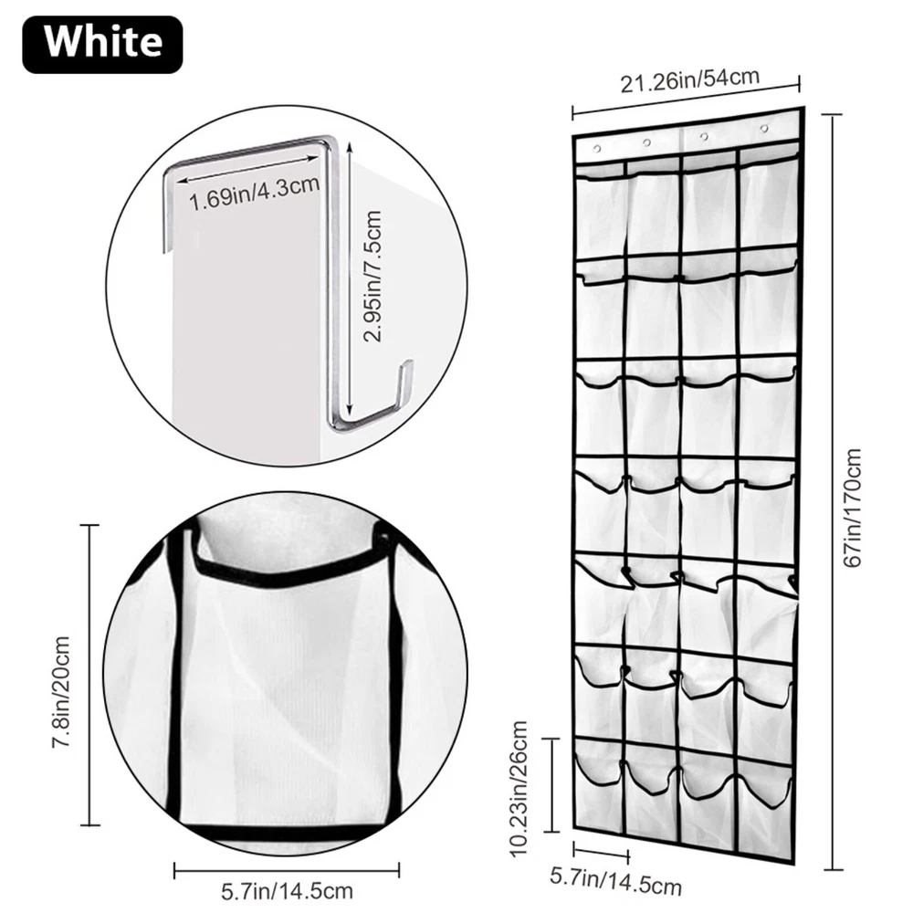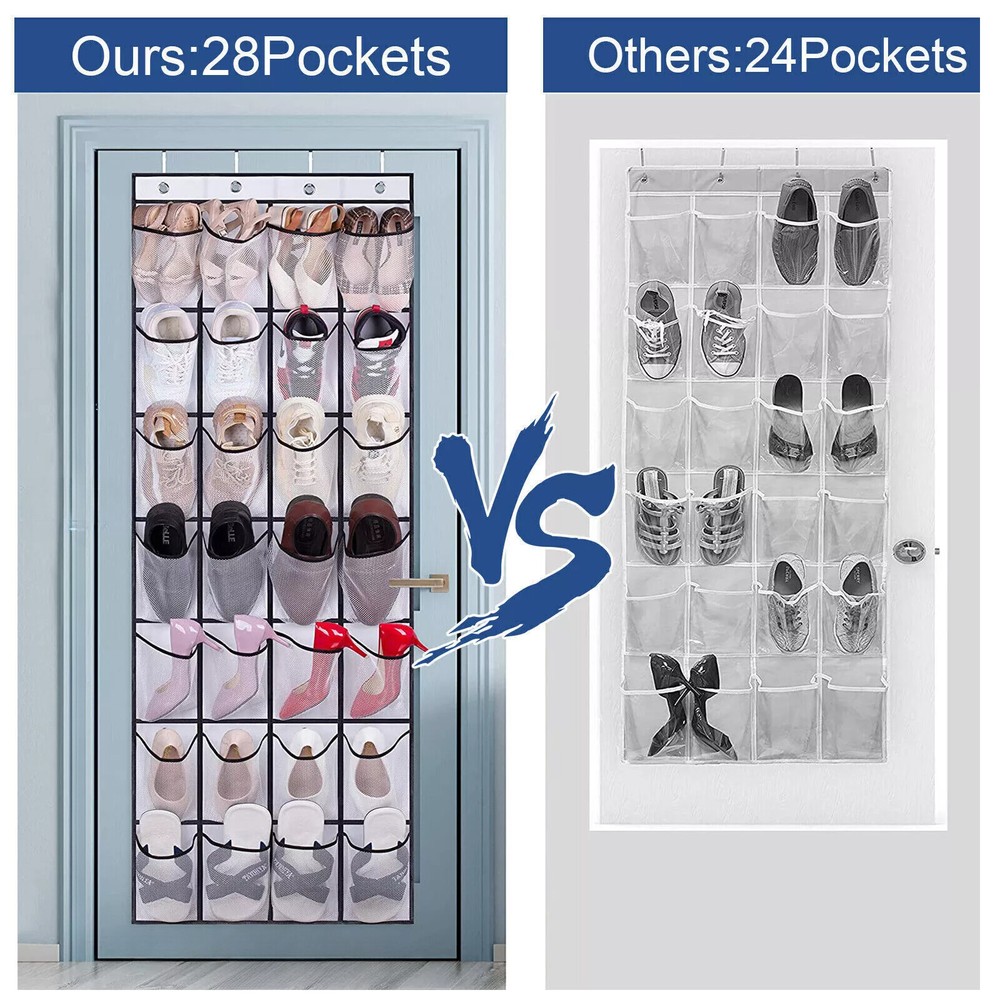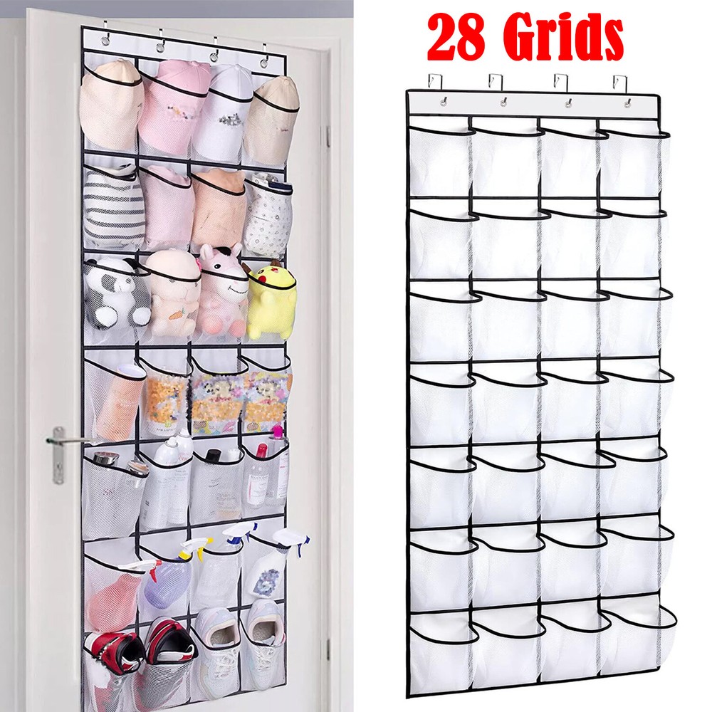 Plenty of Pockets: The organizer hanger has a total of 28 large pockets, 4 more than other similar hanging organizers, so the closet shoe rack organizer can hold at least 14 pairs of men's shoes such as tennis shoes, sneakers or 28 pairs of slippers, flip-flops, sandals, high heels, etc. Pockets are Big Enough: Each pocket is spacious enough to hold a size 13 men's shoe or a pair of women's shoes without taking up space, making your home more organized and tidy, each pocket measures: 7.5in L x 5.7in W. Fits Doors: Comes with 4 metal hooks, easy to install, fits most standard doors within 1.37 to 1.65 inches in thickness, no problem closing the door, overall size: 170x54cm (67x21.26in). Material: This hanging bag is made of 100g non-woven + 60g mesh, breathable non-woven material, transparent mesh for easy viewing of the inner items, mesh pockets allow the shoes to ventilate, and you can find what you need at a glance. Versatile: The storage hanging bag is suitable for behind the door and also suitable for storing other items such as socks, hats, toys, accessories, etc. Perfect for storage rooms, walls, closets, dorms, bedrooms, bathrooms, etc. Package Included 1 x 28 Compartment Storage Bag 4 x Hooks CONTACT US: For any problems during the transaction, e.g. you not receive the item on time, the item with issues, etc. Pls contact us first, we promise to give you a satisfactory solution, rather than leaving neutral or negative feedback without contacting. Many thanks!