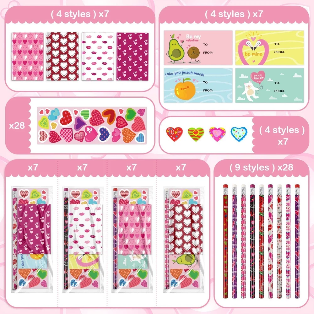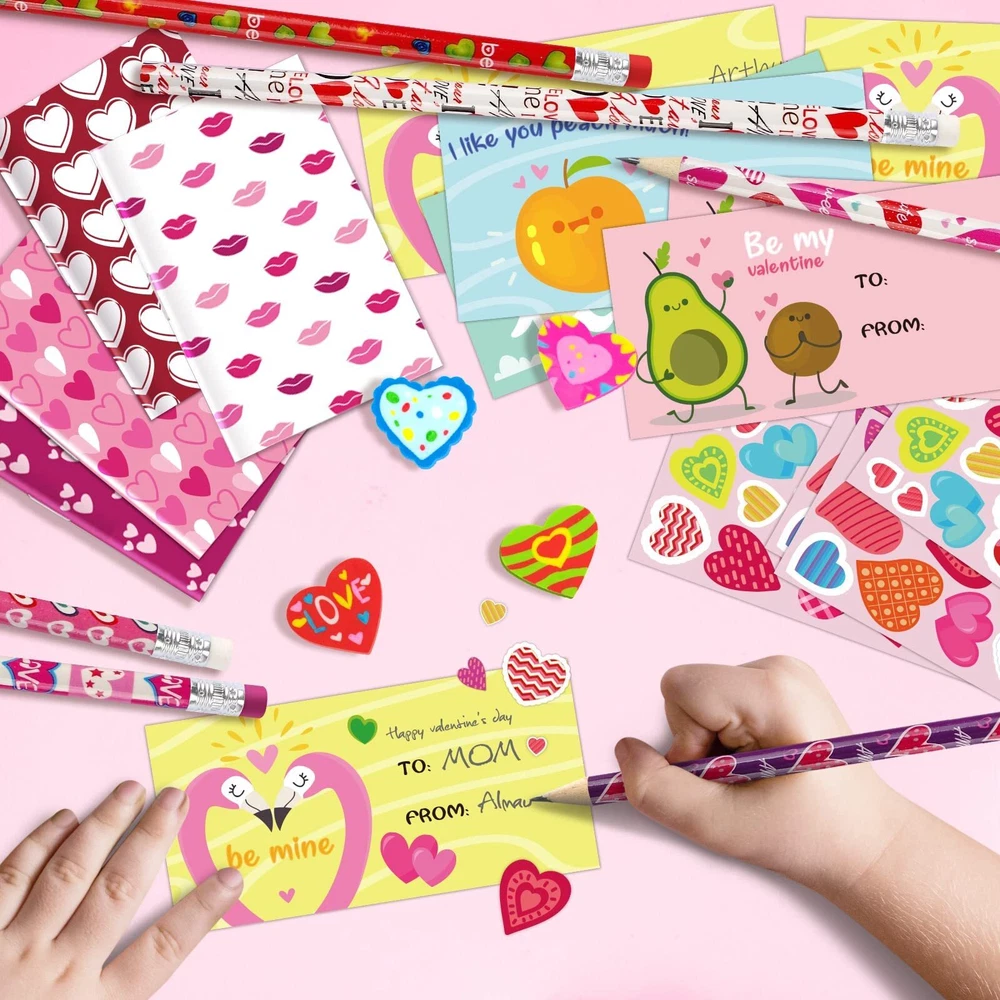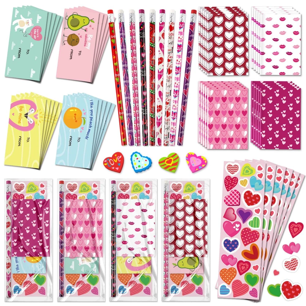 What's inside: Super Value with 28 Pack Assorted Valentine’s Stationery Gift Set for Classroom Exchange! Comes with 28 Pencils in 4 designs, 28 Erasers in 4 designs,28 lovely 3D stickers, 28 Greetings Valentine's Day Cards in 4 designs,28 Notepads in 4 designs.Rich enough for whole class. Special Function. Accompaniment to any great Valentine's Day gift and a memorable way for everyone to send wishes for a happy Valentine's Day. This Party Favor Toy will bring joy and happiness to everyone on Valentine’s day. Ideal gift: This Valentine Assorted toy brings fun to the occasion, a perfect greeting card for Sharing Special Crushes And Making New Friends. It can also be a perfect material for classroom parties and exchanges.28 packs are Enough For The Whole Class. Great for Teacher’s Classrooms, Classroom Prizes, Home School, Valentine’s Stationery Gift, Birthday Party Gift, Party Favor, and All Other Uses. Premium quality and aftersale service-Any any quality issue please return it within 180 days for refund or replacement, and if you have any questions. Please contact us freely. We will reply to you within 24 hours.