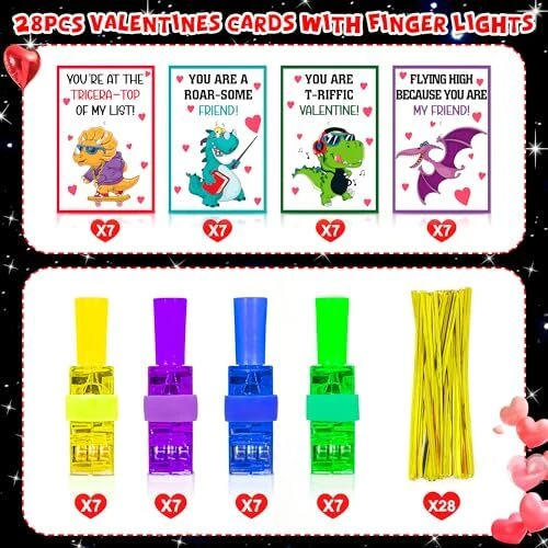 Return Policy Fast Delivery Trusted seller 28 Pack Valentines Cards for Kids with Finger Lights, Valentines Day Gifts for Kids, Light Up Toys Bulk Valentines Day Cards for Kids Classroom School Exchange Prize Goodies Bag Filler Party Favors Product Description 【valentines day cards for kids school】 Come with 28 packs of kids valentines day cards + 28 glow in the dark led finger lights + 28 twist tie. Sufficient quantity for preschool or elementary classroom valentines day gifts for kids boys girls. 【High-Quality Valentines for Kids Classroom】Meet US toy standard and safety test approved. The valentines day cards are made of high-quality cardboard. The glow finger lights are made of ABS, assembled with a insulation sheet and a rubber strap, stretchable, durable enough. The good quality beautiful Valentines party favors will make sure your fun lasts longer. 【Unique Design Kids Valentines Day Cards】Those 28PCS size of 4.72*3.54 inches valentines day cards are full of vivid expressions and valentine elements with 4 different style dinosaur and some sweet words, each for 7PCS. Just sign up “To”and From”and tie up the Finger Lights with 2 holes on each card. Send your little sweetheart to school with these kids valentines cards that'll melt all of the hearts in the classroom! 【Light-up Your Valentines】These valentines finger lights are designed in dinosaur-themed projected pattern includes different dinosaur to increase the festival atmosp. Kids will definitely love these valentines day cards with finger lights. Just turn on the button, super vibrant cute pattern in the dark, brimming with joy and fun during valentines' day. Perfect for valentines day gifts for kids classroom exchange, valentines party favors, Valentine giveaways. 【Valentines Day Gifts for Kids】 It will be the hit of your kid's Valentine's Day party with these creative Valentines day cards ideas to wow the whole class! Your kids will love decorating these valentines day cards and showing them to their friends at school. Suitable for valentines party favors, valentines day gifts for kids classroom school exchange prizes activities, classroom rewards prizes non treats goodie bag fillers. Shipping Returns Payment Shipping Shipping is FREE to all addresses other than APO/PO boxes in the lower 48 states. All our stock ships from US-based warehouses. Shipped via USPS or UPS (depending on location and package weight) Unless stated otherwise, all orders will ship within 24-72 hours of your payment being processed. Check our feedback to see the great reviews of FAST shipping we offer. Returns Seller does not accept returns Payment We currently accept payment via eBay managed payments only. Once payment is cleared, we will dispatch your shipment within 1-3 business days. Please refer to the "Shipping" tab for more information regarding shipping speed to your destination.