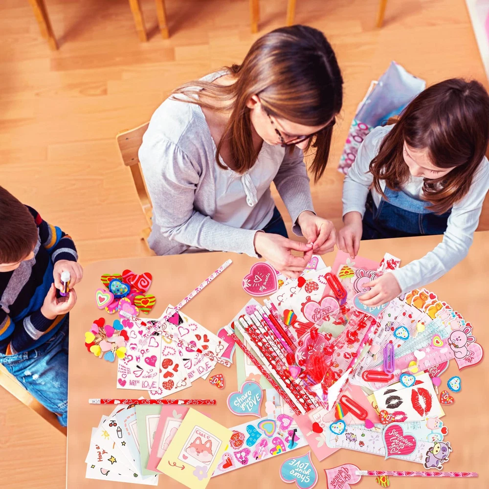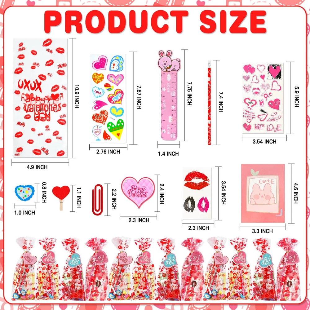 Valentine Stationery Set: 28 x Heart cards, 28 x Candy bags, 28 x Pencils, 28 x Mini Notebooks, 28 x Stickers, 28 x Clips, 28 x Erasers, 28 x Rulers, total of 224 pieces, perfect as a classroom stationery set gifts for children. Valentine's Day Theme Design: Valentine's Day heart cards, stickers, erasers, clips have cute and cozy heart shapes, Valentine's Day heart cards, notebooks, ruler, candy bags and stickers are designed with cute patterns, pencil are also infused with sweet Valentine's Day colors and patterns. DIY Gifts Time: Use unique Valentine's cards and stationery for fun DIY projects with your child! Write down classmates' names and get creative together. These goodie bags are ideal as Valentine's Day gifts for classroom exchanges, encouraging your kids to socialize and express gratitude to classmates, friends and teachers. Safety and Quality: The Valentine stationerys are made of plastic, which are safe for children. Meet US Toy Standard. ASTM & CPC Test Approved. However, the set contain small parts, children should pay attention to prevent swallowing. Ideal Valentine's Day Gifts: This kids' Valentine's stationery gifts set can bring joy to various occasions, suitable for classroom gifts exchanges, Valentine's party favors, classroom prizes, rewards, and more.