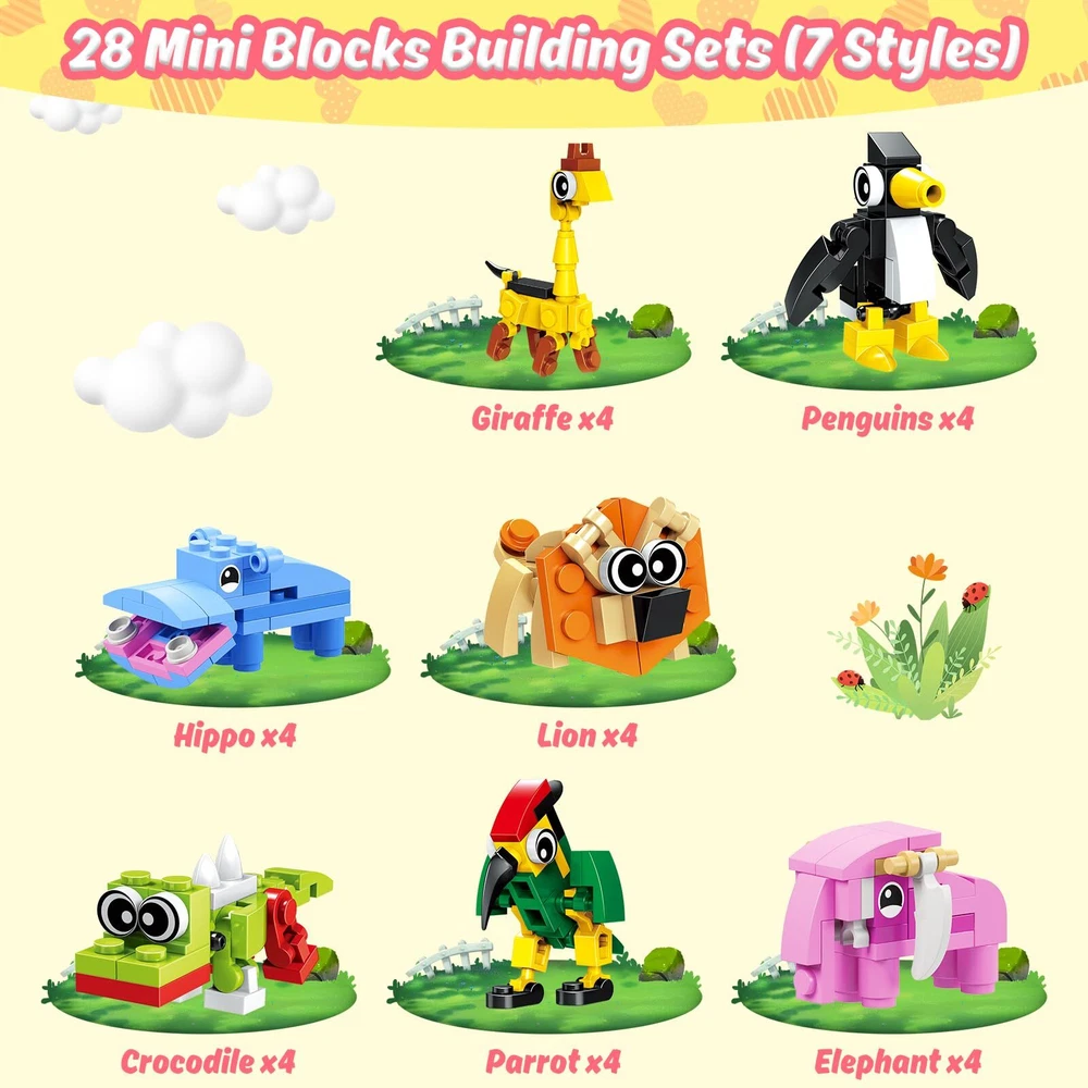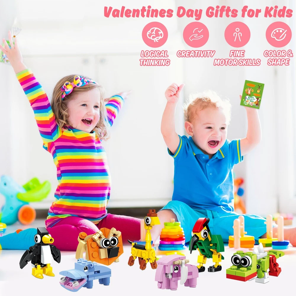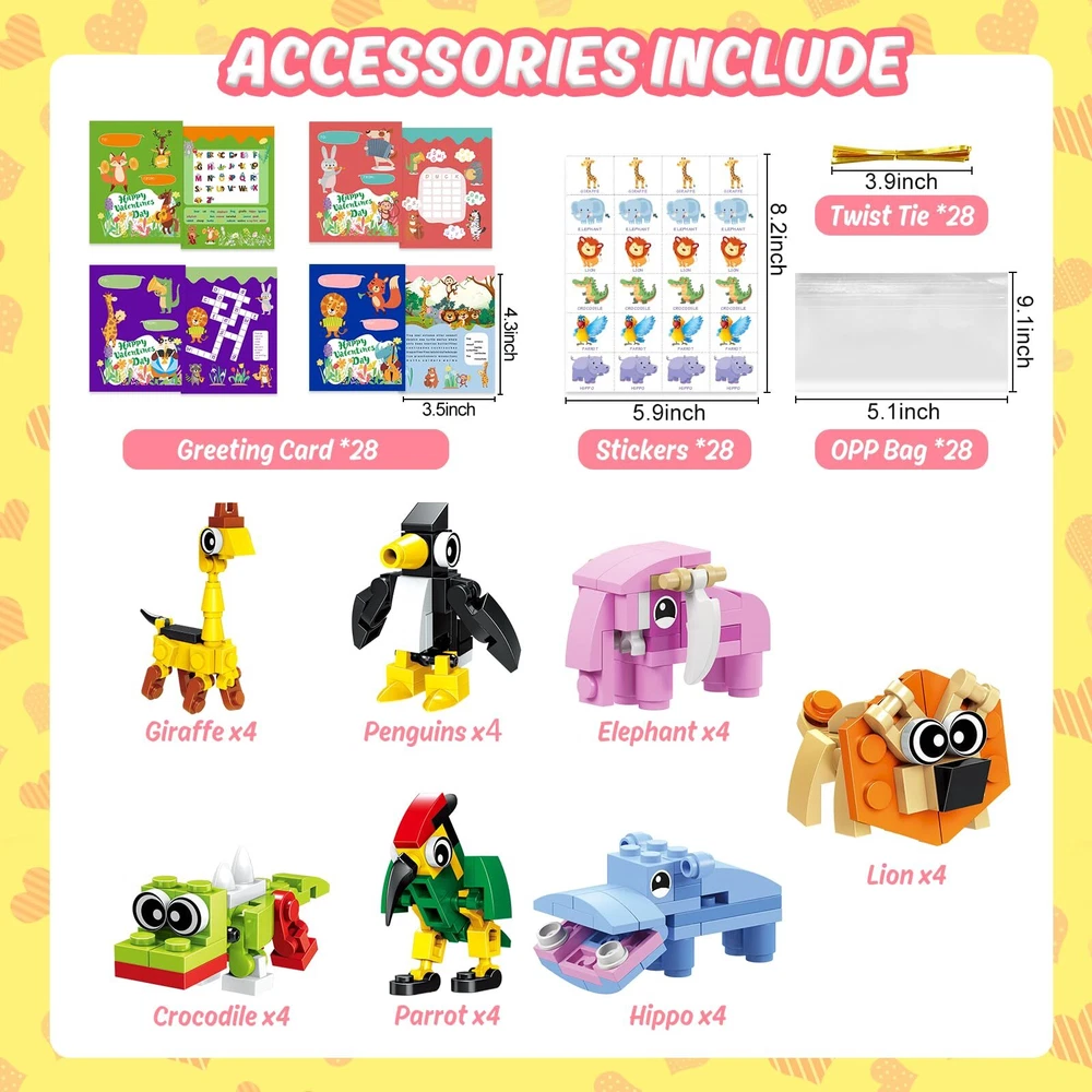 【Valentines Day Mini Blocks Building Sets】 This animal building blocks set includes 28 sets of mini building blocks, 28 fun greeting cards, 28 animal stickers and 28 OPP packaging bags. Put a pack of mini building blocks, a greeting card and a sticker into the OPP bag to form a gift, and you will totally get 28 exquisite Valentine's Day gifts. 【Realistic Animal Shapes】 There are 7 different animal shapes in total, including giraffe, lion, penguin, elephant, crocodile, parrot and hippopotamus. The appearance design of each animal is very realistic and can be shared with friends to assemble the building blocks together. Some of the animals can also be assembled into other forms according to the instructions, allowing children to use their imagination. 【Ideal Valentines Day Gifts for Kids】 These animal mini building blocks sets are not only the perfect class Valentines Day gifts for kids, but also the top choice party favors for kids. It brings the joy of sharing, helps children make new friends, improve social skills, and learn to express gratitude and love. 【Valentines Day Gifts for Various Usage Scenarios】 This Valentines Day mini building blocks set can not only be used as a gift for parents to give to their children, but can also be used as a kids Valentines Day gifts for school to enhance the friendship between classmates. It can also be Valentines Day gifts for kids classroom from teachers to promote teacher-student relationships. 【Durable and Safe Material】 Our mini blocks building sets are made of high-quality ABS material, non-toxic and odorless, 100% safe for children to use, you can rest assured that they can have fun playing. However, the building block accessories are small in size, so please be careful to prevent children under 3 years old from swallowing them.