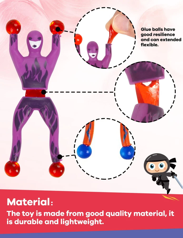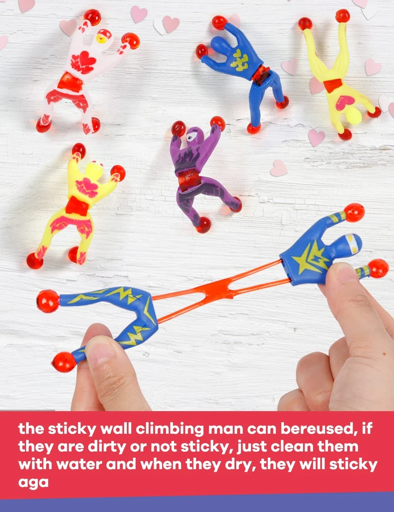 Unique Design: The colorful sticky wall climbers toys are super light and easy to throw/toss. Hands and feet have small glue balls. Glue balls have good resilience and extended flexibility. Four styles of cards with different themes to match the toy, lively and active. Super Value Pack: Our Valentine's gift Cards with wall climbers sticky toys Set includes 28 cards in 4 designs and 28 sticky men. It comes with everything you need to make great valentines gifts for your kids’ classroom valentines exchange. Ideal Valentines Gifts: Sticky wall climbing toys are ideal toys for kids to enjoy. kids will love tossing and flinging them so that they stick to the ceiling, walls, windows, tables, and virtually any surface. Let your kids or students have a perfect valentine with our Valentine wall climbers. the stretchy climbing man also can be an ideal gift for your classmates, students, colleagues, family members, and more. Safe Materials and Size: Safety test approved. The length can be stretched without breaking, and the stickiness is good. Durable and reusable and can be washed to keep it clean. the window climbers are about 3.7*1.3 inches, convenient for you to take them with you wherever you go. More Applications: These sticky toys tumble down a wall like a mountain climber scales down a mountain. A perfect chance to practice your handwork ability, kids can play it for fun, turn it over on walls, windows, or tables, like spiderman. These novelty tiny toys are great gifts for friends, classmates, and students in school activities like valentine's party favors, gift exchanging, Themed parties, celebrations, party bag stuffers and gifts, party games, or carnivals.