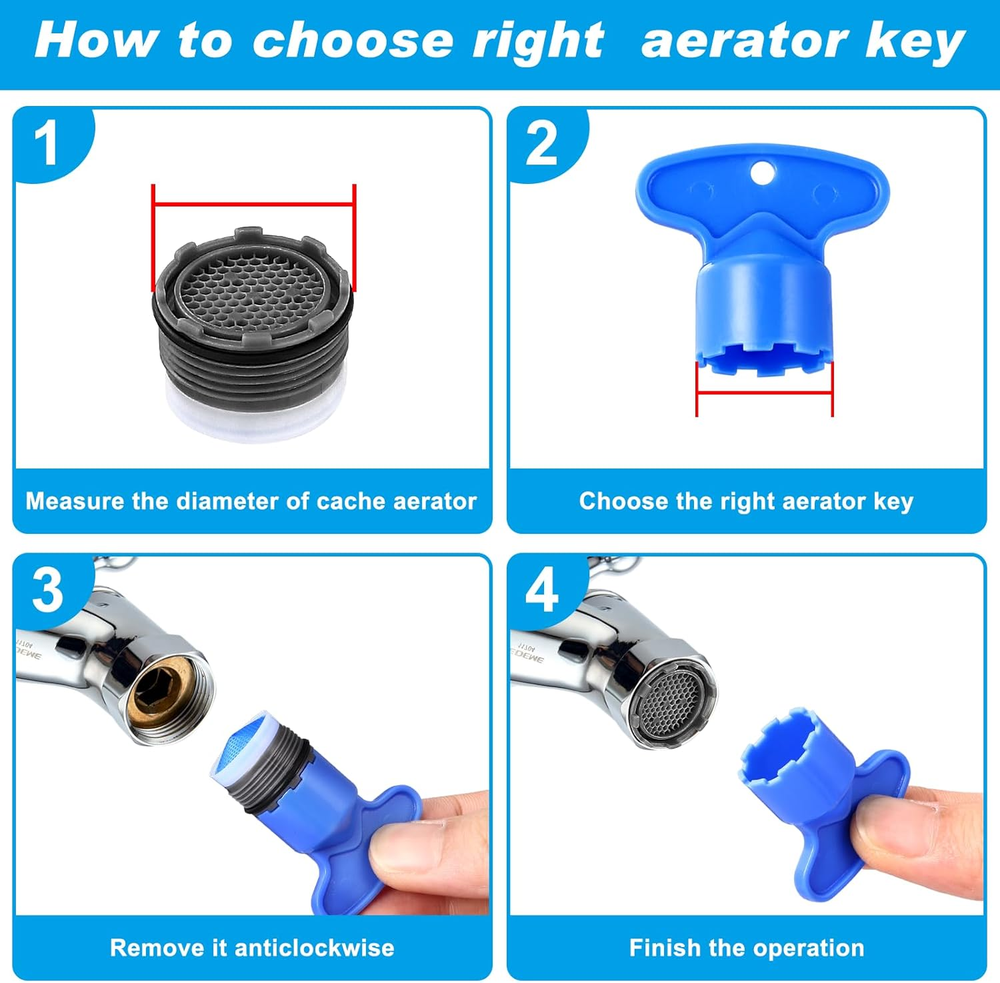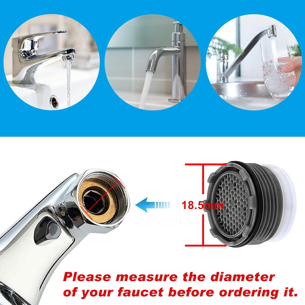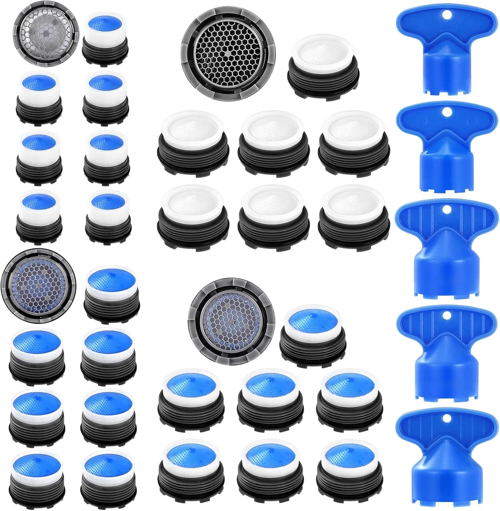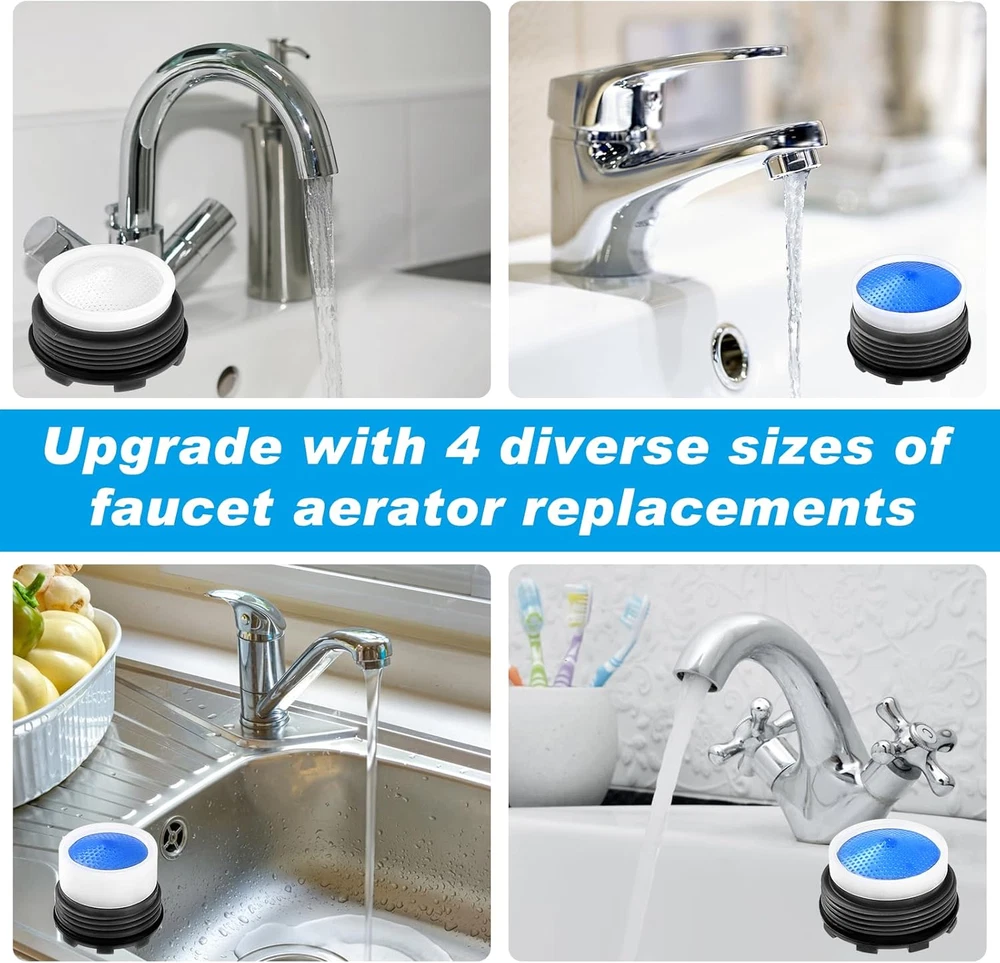 Versatile Compatibility: The faucet aerator kit includes 28 pieces of 16.5mm/ 18.5mm/21.5mm/24mm aerators, 7 pieces of each type suitable for various kitchen sinks, bathroom taps, and lavatory faucets. Ensure compatibility by measuring your faucet spout thread diameter before purchase. Effortless Installation and Replacement: This set comes with 5 faucet aerator removal wrench tools, making it simple to remove and replace aerators. Just unscrew the cap, remove the old insert, and install the new one quickly and economically. Durable and Reliable Materials: The faucet aerators are made of ABS plastic, known for their durability and resistance to wear and corrosion. The included removal wrench tools are also sturdy and designed for easy use without causing damage. Enhanced Water Efficiency: Each aerator features a fine mesh that effectively filters water and maintains a steady flow, reducing splashing and ensuring a consistent stream without compromising water pressure. Wide Application Range: Ideal for both serrated and threaded faucet aerators, this kit offers compatibility across different sizes. It's a practical solution for improving water flow and fixing low-flow faucets in homes, offices, and other settings. Product Description Prevents Shedding Rubber ring on the bottom to reinforce and prevent leakage and dislodgement Reticulated Inlet The water inlet has a mesh design that mixes the air with the water flow, turning the water into “flowing water”. Filter Impurities The filter holes are dense and fine, ensuring an even water flow rate while also filtering out small stones, sand or other dirt in the water. Faucet Aerator Key The set includes 5 different sizes of Faucet Aerator Keys, so you don't have to worry about not having the right size faucet!