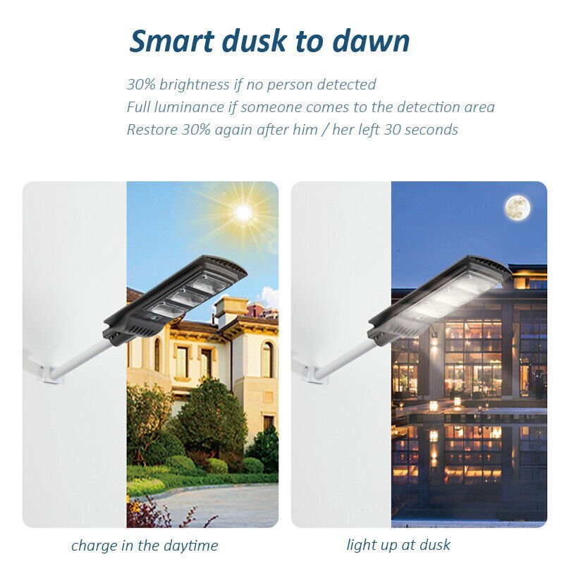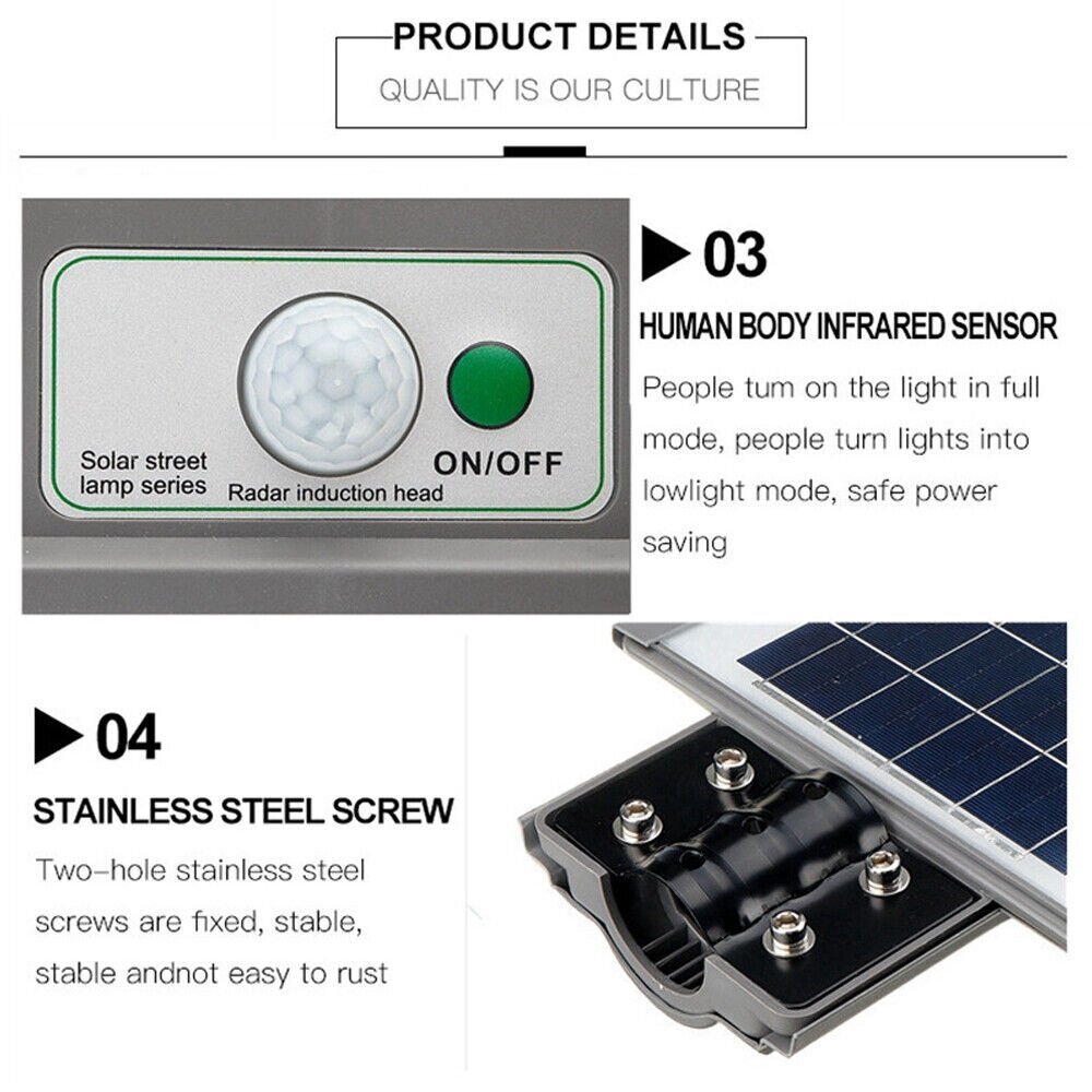 Store Categories Store Categories Home & Garden Kitchen, Dining & Bar Home Décor Yard, Garden & Outdoor Living Greeting Cards & Party Supply Household Supplies Cleaning Lamps, Lighting Ceiling Fans Tools Workshop Equipment Home Improvement Bath Holiday & Seasonal Décor Furniture Major Appliances Candles & Home Fragrance Toys & Hobbies Radio Control Control Line Diecast & Toy Vehicles Educational Model Railroads & Trains Action Figures & Accessories Puzzles Preschool Toys Pretend Play Outdoor Toys & Structures Game Stuffed Animals Electronic, Battery & Wind-Up Baby Baby Safety & Health Toys for Baby Computers/Tablets Networking Laptop & Desktop Accessories Computer Cables & Connectors Printers, Scanners & Supplies Crafts Scrapbooking & Paper Crafts Art Supplies Leathercrafts Needlecrafts & Yarn Business & Industrial Facility Maintenance & Safety Test, Measurement & Inspection Office Material Handling Electrical Equipment&Supplies Light Equipment & Tools Consumer Electronics TV, Video & Home Audio Smart Home Electronics Vehicle Electronics & GPS Other Consumer Electronics Home Telephones & Accessories Radio Communication Cell Phones & Accessories Cell Phone Accessories Smart Watches Health & Beauty Massage Health Care Makeup Medical & Mobility Bath & Body Clothing, Shoes Accessories Men's Accessories Specialty Women Kids Musical Instruments & Gear Guitars & Basses Pro Audio Equipment Stage Lighting & Effects Jewelry & Watches Jewelry Design & Repair Dolls & Bears Dolls Collectibles & Art Collectibles Paper Sporting Goods Cycling Outdoor sports Camping & Hiking Tactical & Duty Gear Outdoor Sports Equipment Hunting Equipment Indoor Games Fishing Golf Tennis & Racquet Sports eBay Motors Parts & Accessories Automotive Tools & Supplies Pet Supplies Cat Supplies Dog Supplies Cameras & Photo Lighting & Studio Digital Cameras Video Games & Consoles Video Game Accessories Sports Mem, Cards & Fan Shop Sports Trading Cards Other Solar Street Light 28000LM LED Commercial Outdoor IP67 Security Road Lamp + Pole Product Description Features: - 240LEDs High-brightness 5730 LED lamp beads, energy saving, even light, longer lasting. - Polycrystalline Solar Panel convert solar energy into electricity, more environmentally friendly. -Human body sensing technology makes it more energy-efficient, light on when sensing motion, dim light when sension no motion. -Solar panels convert solar energy into electricity, more environmentally friendly. - ABS housing, high hardness, sealed and IP65 waterproof. - Easy installation, maintenance-free dependable operation without the need for wiring or trench. Rustproof, waterproof aluminum heavy duty casing. - Please turn on the switch before installation or charging. - Application: Outdoor wall or pole in Plaza, Park, Garden, Courtyard, Street, Walkway, Pathway, Campus, Farm, Perimeter Security etc… Specifications: Light Color: Clear White ( 6500K) Light Size: 620mm*240mm*55mm/24.4*9.4*2 inch Pole Length: 50cm/19.7 inch Weight: 7.5 Lbs Shell Color: Gray Shell material: ABS+ PC Lumen: 28000LM Power Supply: Built-in Lithium Iron Phosphate Battery 32650/3.2v10000mA Solar Panel: 6V 13W Solar Panel Size: 9"*20" Charging Time: 6-9H Working Time: 13H Sensing Angle: 120 degree Lighting Range: 120-160m Waterproof Rate: IP65 Waterproof level: 95% sealed-type effective waterproof (rain) Control system: Button Control + Motion Sensor +Rada-r Induction + Remote Control Light source: 5730 High-brightness Chip LED Lamp Beads( Brighter,More resistant to temperature) Package Included: 1X Solar Street Light(Grey) 1X Remote Controller 1x Light pol Payment Shipping Returns Feedback About Reply Payment - We accep t the payment through :Credit, debit, and gift cards, Apple Pay, Google Pay, PayPal, and PayPal Credit. - Payment must be fulfilled within 4 days after the end of auction. - Please make sure your ebay address is correct. Or not, please correct it before payment. - If you are a big customer, Please contact with us about the item's PRICE and SHIPPING. - Your feedback & suggestion is deeply appreciated, thanks. Shipping 1. We are send out All the items will be dispatched within 1 business day after receipt of payment from our U S based warehouse , the delivery time is 2 -5 business days by FedEx/USPS . Due to the bad weather, Weekend, Holidays, Hot Season ect. the parcel maybe delay, If you have any problems,mssage us, we will try our best to solve it. 2. We ship to your Paypal address . Please make sure your Paypal address is correct before you pay. 3. If you want to change the shipping address,message us before our send out Returns 1. If you donot receive the items at the delivery time,the parcel has broken/missing,Please message us before you open case/return,we will try our best to solve it. 2. We offer a 30 day return policy from checkout winning date. 3. 4. Items defective upon receipt must be packaged in their retail pAn RMA number is required for all returns. Message us for return instructions. Items Returned without a RMA number will not be processed. ackaging as if new and returned with a detailed description of the problem. 5. Return shipping fees are not refundable.We reserve the right to decline any returns if the above guidelines are not followed. Feedback Your satisfaction is our pursuit. We Strive For Positive Feedback & 5stars DSR (detailed seller ratings). A Positive Feedback will be left to all buyers and we wish the same from you (*^__^*) If you have any problem /dissatisfaction, please contact us via eBay. We really appreciate the chance to improve our service. About Reply All replies will be sent to your email box, if you do not get response within 24 hours (Sat. & Sun. excluded) please check your eBay My Messages in case that our emails will be filtered automatically by your settings. Copyright © 2023 Dianxiaomi
