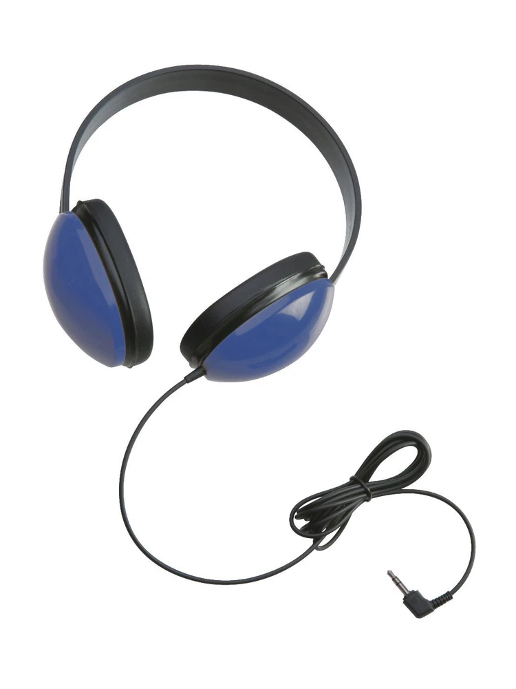 2800-BL Listening First Stereo Headphones, Blue, Adjustable Headband Comfortable for Extended Wear, Specifically Sized for Young Students, Replaceable Leatherette Ear Cushions This Listening First stereo headphone is specifically built for young students with safety as its first concern. Rugged ABS plastic earcups withstand daily use with slotted earcup baffles to prevent accidental damage from prying fingers or foreign objects. The volume control is set from the audio source (not on the headphone or cord) for student safety. It is ideal for classroom story-time, library, and computer uses. Key Features Adjustable headband comfortable for extended wear Specifically sized for young students Ideal for beginning computer classes and story-time uses Permanently attached with reinforced "strain" connection resists accidental pull out Lengthy 5'-6" straight cord with 3.5mm plug set at right angle reduces accidental pull-out Around-ear ambient noise-reducing earcups deliver maximum protection against exterior sounds (without added electronic circuitry and expense). This reduces the need to increase the volume (protecting the ears) and helps keep students on task. Rugged ABS plastic earcups resist breakage in high-use situations Replaceable leatherette ear cushions iOS, Windows, Android compatible Specifications Cone: 30mm Mylar Magnet: Ferrite Impedance: 25 Ohms each side+/-15% Frequency Response: 20 - 20KHz SPL: 110 db +/- 3db R/L output difference: 3 db Rating Input: min 20mw, max 30mw Distortion: 5% Transducers: 40mm Mylar dome driver unit Sensitivity: 98dB ± 3dB at 1kHz Plug: Right angle 3.5mm mini plug Ear Cushions: Foam-filled leatherette Weight: 9.6 ounces, shipping weight 1 lb. Adjustable headband comfortable for extended wear Ideal for beginning computer classes and story-time uses Permanently attached with reinforced "strain" connection resists accidental pull out Lengthy 5'-6" straight cord with 3.5mm plug set at right angle reduces accidental pull-out Rugged ABS plastic earcups resist breakage in high-use situations