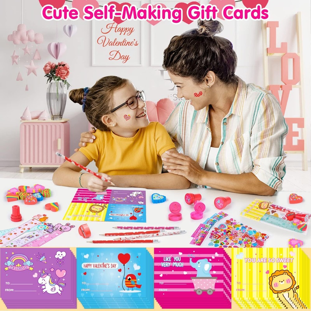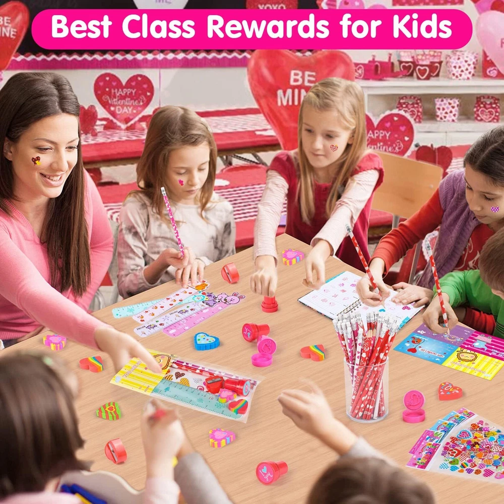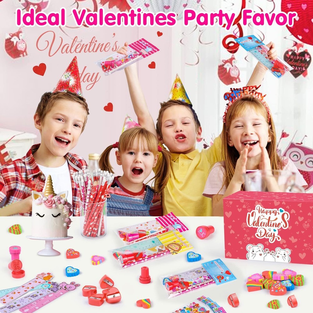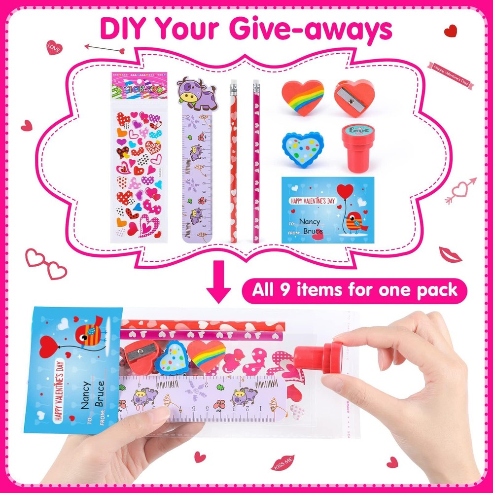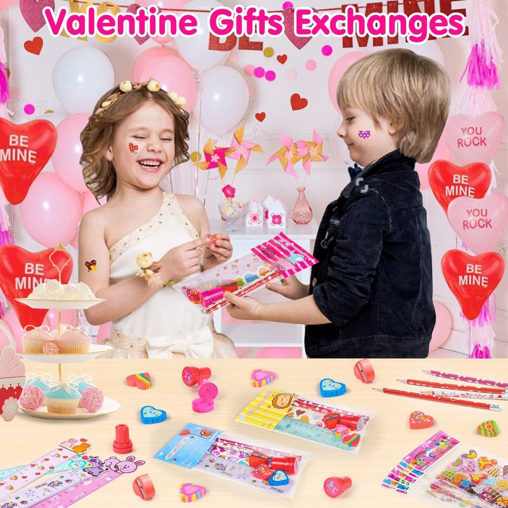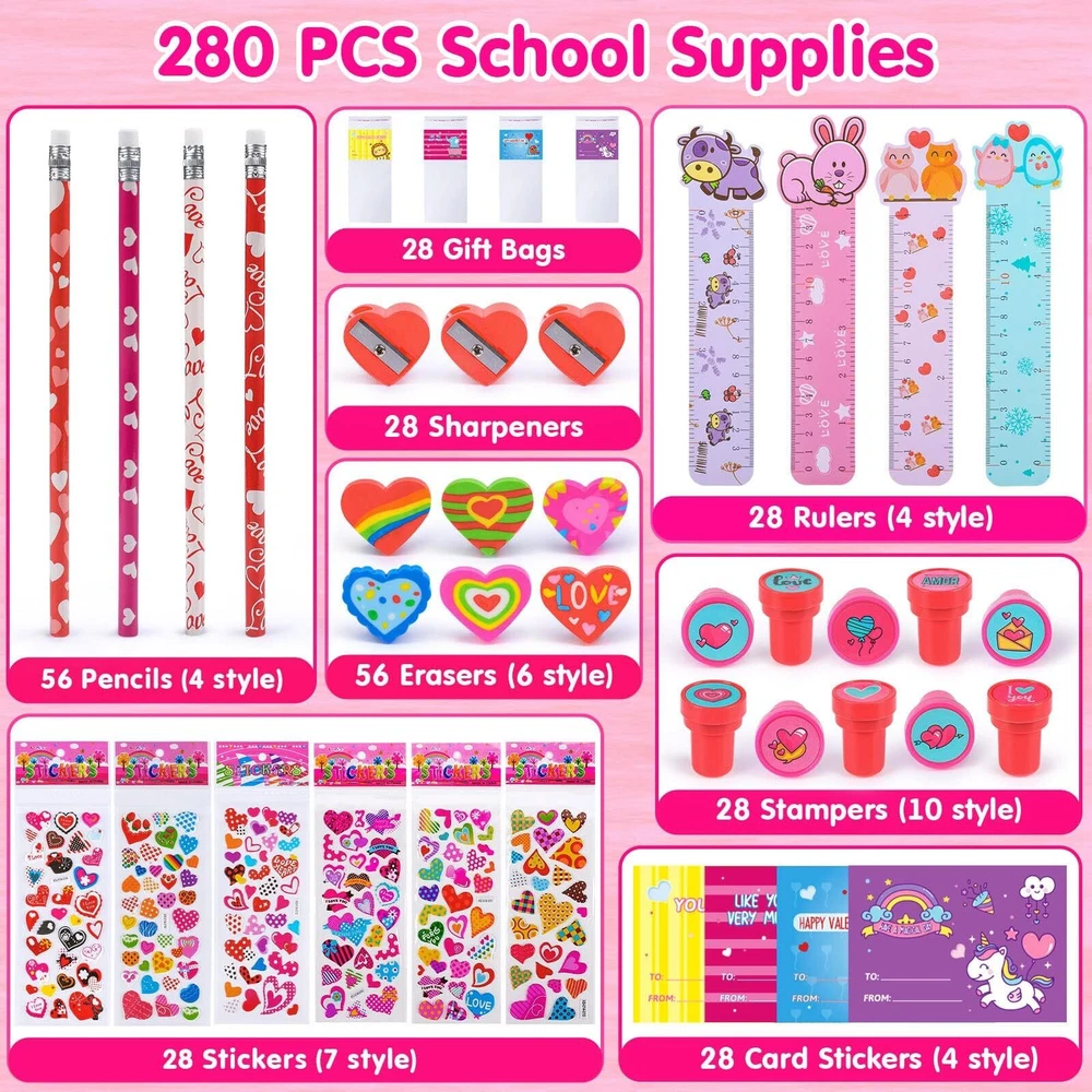 Value Pack for Kis: 280 pcs assorted valentines gifts for kids can be divided into 28 packs. Each kids valentine gifts pack has 9 items inside. Great in quantity, perfect for giving out as Valentines goodie bags, valentine party favors, surprise box, carnival prizes, daycare fun day handouts. Kids will be delightful to have cute school supplies as presents from teachers or parents Great Variety of Design: Valentines party favors has heart shape and love figures on them. Oozing oodles of romance all around! The valentine pencils and erasers has various styles, valentine cards, rulers and stickers have 4 random styles, meets different needs of girls boys. With multiple school supplies options, there's always one for your Valentine's Day Fun Give Aways Making: Non-candy Valentine's Day treats come with everything you need to DIY your valentine event giveaways. Let who receiving exclusive gifts feel your heart. Put valentine gifts for kids in 28 pcs individual bags and write on valentine cards, very quick and easy. And you can enjoy creating valentine handcrafts with your sweethearts together Class Gifts Exchange: Valentines stationery sets are the best choice for class rewards. With multiple stationery kits, kids can easily handle homework and notes for all subjects. Ideal classroom prizes help arouse their enthusiasm for studying. In addition, gifts exchange between kids brings them closer together. Great way to enhances their social skills Premium Valentine Treat: Kids valentines gifts are good in quality. Erasers can erase quickly; stickers can decorate everywhere; pencils can write smoothly; rulers can measure precisely and sharpeners can work safely. If you are looking for valentines day gifts allows boys girls to express their imagination freely