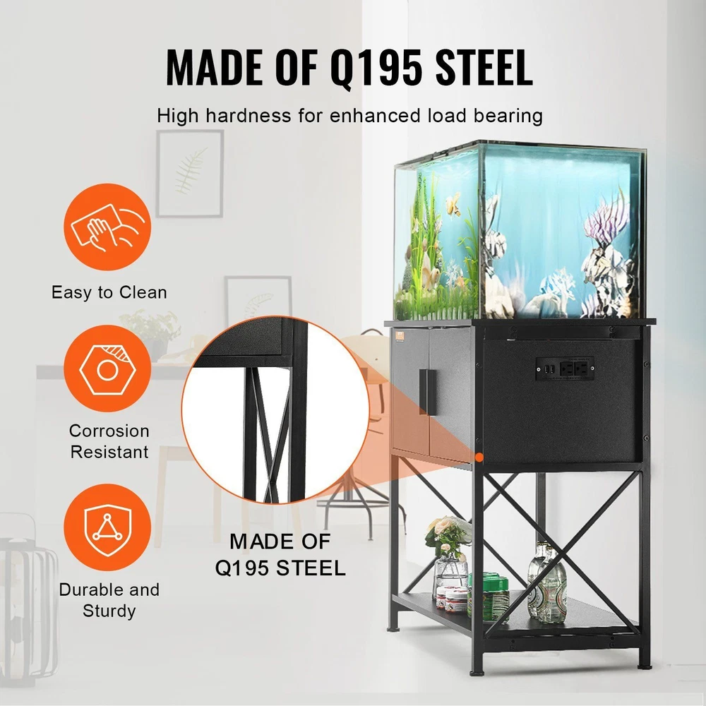 Feature: Stylish Design: Our aquarium stand features a sleek black exterior, effortlessly blending with various interior décor styles. You can place it in your living room, reception area, dining room, study, and more. Robust Load Capacity: The fish tank stand is constructed with multiple crossbar steel frames. Fixed rubber feet adapt to uneven surfaces, providing non-slip and leveling functions. It can support a maximum weight of 110 kg / 242.5 lbs. Multi-functional Power Strip: The built-in power strip for the fish stand comes with 2 AC outlets and 2 USB ports, allowing simultaneous use of multiple tools. The 1.5m cable ensures power is readily available whenever you need it. Triple the Storage Capacity: The turtle tank stand is designed with three tiers of storage space. The top frame can accommodate a maximum 29-gallon aquarium, while the bottom frame can hold a smaller fish tank. The middle enclosed storage compartment is ideal for storing various accessories and other items, providing triple the storage space for your convenience. Built to Last: Crafted from high-quality Q195 thickened steel, the reptile tank stand boasts a high-hardness steel material that provides strong load-bearing capacity while being sturdy and durable.