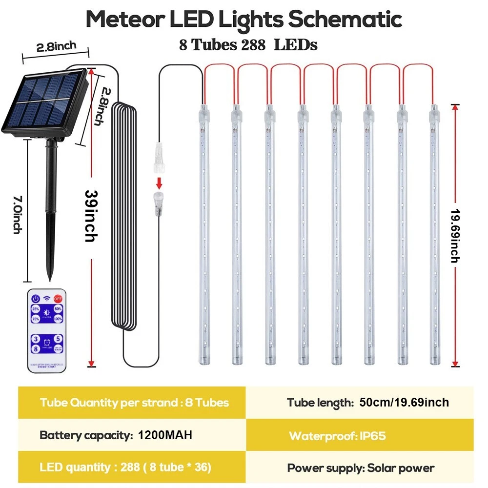Color: Clear Control Style: Remote Control LED String/Strip Type: // Energy Star: 5 Stars MPN: Does not apply Brand: Unbranded UPC: Does not apply Cord Color: Clear Department: Adults Light Shape: TUBE Installation Area: Indoor & Outdoor Lighting Technology: LED Size: 8 TUBE / 288 LED Occasion: Party Type: Waterfall Theme: Holiday/Christmas Sensor Type: Light Power Source: Solar EC Range: A++ - E gtin13: Does not apply Features: Solar, Waterproof Number of Settings: 8