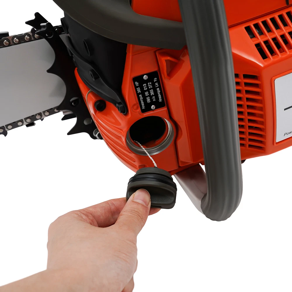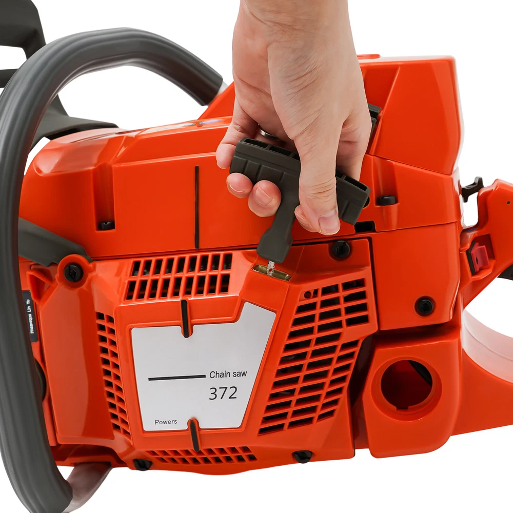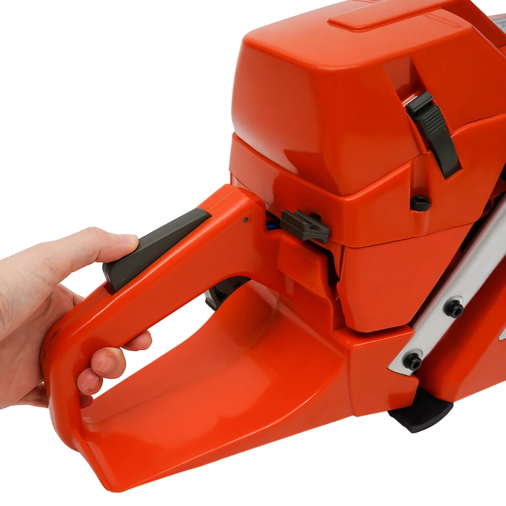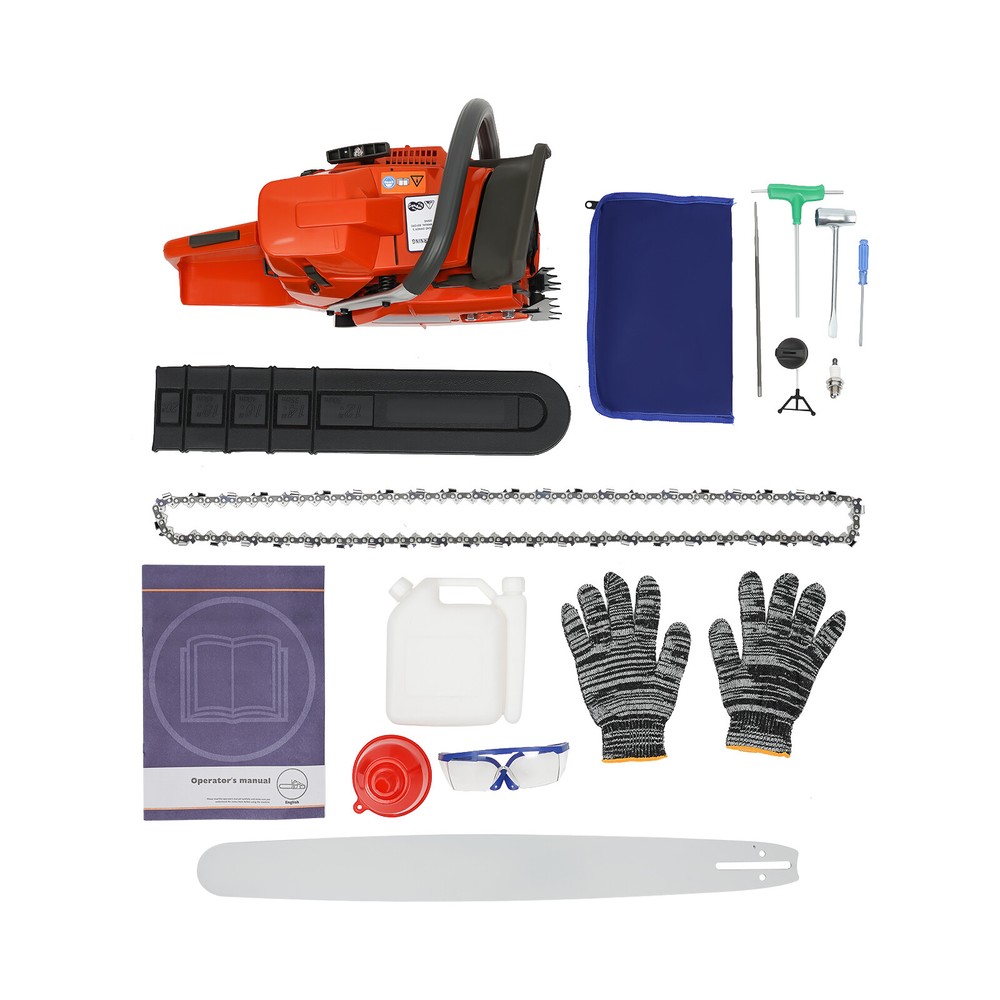 71CC 28" Gasoline Chainsaw Cordless Power Chain Saw Wood Cutting 2-Stroke Engine Handheld Cordless Petrol Chain Saw, Gas Powered Chainsaw, 71cc Gasoline Chainsaw Power Head Description Selected materials, excellent performance and powerful engine make this gas chainsaw an efficient professional cutting tool, which saves you time and labor. With silent and vibration-dampening design, an ergonomic handle, a braking baffle, and a pull-start ignition method, it is safe and comfortable to use. Key Features Made to Last: It is made of high-quality nylon housing, aluminum handle, and Mn steel guide bar&chain , which is insulating, strong, durable, wear-resistant , and not easy to deform. Excellent Performance : The 2-stoke engine with 71cc displacement, 10000rpm high speed, and 3.9KW high power, the high-magnetic flywheel with thickened blade design, the filter, the pressure-reducing valve, and the 28" guide chain can achieve fast cutting, thus providing excellent performance(about 28" cutting diameter). Cost Saving: The combination of this quality carburetor and automatic lubricating oil system enables the product to provide a stable and economical supply of chains and bars, quickly and easily adjust chain tension, and reduce friction and oil consumption by 20%, thereby improving cutting performance and extending service life. High Safety: The double protection switches that must be pressed at the same time to work can prevent the machine from accidentally starting. The heat-sink holes on the machine also ensure good heat dissipation. Moreover, the guide plate has an inertia-activated chain brake to reduce the possibility of injury due to recoil, and the practical gloves and the widened brake baffle that makes emergency braking can protect your hands from hurting, avoid sawdust splashing, and improve safety. Convenient and Comfortable: With a hand-pull spring-loaded starter handle, premium spark plug, safety switch, and throttle switch, it's convenient to use. Its Cordless design and non-slip shock-absorbing ergonomic handle allow you to operate more easily and freely. Moreover, the silencing and damping designs can effectively reduce noise and vibration, providing you with a multi-angle cutting by changing the direction of the machine, which is convenient for you to use. Easy to Install: The simple structure, complete accessories, and English manual allow you to install this product in minutes, saving you time and labor. Protective Package: To prevent the product from being damaged and bumped during transportation, we packed it with foam to protect your products to the maximum extent possible. Customer Service: We aim to provide quality products and services. If you have problems, please feel free to contact us. We will reply and solve the problem for you as soon as possible. Details Tool Bag: It can help you organize your accessories in an orderly manner, making it easy for you to carry around and effectively preventing accessory loss . Fuel Tanks: The 18.6Oz translucent fuel tank and 4.73Oz chain fuel tank allow for large capacity, a convenient mixture of fuels, and long-term use without frequent filling. Double Nuts and Piston Rings: The guide plate is fixed with double bolts to ensure the stability of the product and make the chain not easy to loosen. The rings make the product sealing performance better, which can increase the machine's power. Guide Bar Cover: It allows for convenient storage and better protection of the guide bar when not in use. Application It is suitable for garden pruning, forest logging, chopping wood, bamboo harvesting, timber making, ice cutting, tree pruning, clearing land, preparing firewood or cleaning up, outdoor wood cutting, for home, garden, ranch, and farm use. How to Assemble the Chainsaw Install the jam teeth in the right direction. Install the guide bar. Install the chain. Cover the side cover. Adjust the chain tightness. Tighten the screw. How to Start the Chainsaw 1. Push the brake. 2. Move the On/Off switch to the On position. 3. Pull the choke knob fully out to position. 4. Pull the start handle(Max 6 times). 5. Push the choke knob back fully. 6. Pull the starter until the engine start. Specification Color: Orange Style: Modern Assembly Required: Yes Material: Nylon, Mn Steel, Aluminum Engine Type: Single Cylinder, Air-cooled, 2-Stroke Ignition System: Self-reset Pull Start Fuel Tank Capacity: 550ml/18.6Oz Chain Fuel Tank Capacity: 140ml/4.73Oz Bore : 45.2mm/1.78inch Volume: 116dB Power: 3.9kw Speed: 10000rpm Displacement: 71cc Oil Mixture: 25:1( 90# Gasoline : Oil) Max. Cutting Diameter: 71cm/28in Chain Length: 71cm/28inch Guide Plate Package Size: 85*15*3cm/33.46*5.9*1.18inch Guide Plate Gross Weight: 2.2kg/4.85lbs Host Gross Weight: 7.5kg/16.53lbs Host Package Size: 70*29*35cm/27.56*11.42*13.78inch Package Included 1* Gas Chainsaw 1* Chain 1* Guide Plate 1* Tool Bag 1 Pair*Glooves 1 Pair*Goggles 1* English Manual Other Accessories for Assembly Notes Before starting the gasoline chainsaw, please ensure that it fits well with the guide bar, and use a wrench to adjust the chain. When installing the guide bar, please note that the screw column on the side cover must be aligned with the guide bar hole before installation(The function of the screw column is to adjust the chain tightness.). Please use gasoline 90# with special 2-cycle engine oil and never use pure gasoline . Gasoline and oil mixture ratio: 25:1. The oil output can be controlled to turn larger to the left and smaller to the right. Please note that after the first ignition sound, closing the choke and repeatedly pulling the start handle will suck in too much fuel and prevent the engine from starting. If the choke knob is not fully pushed back after pulling the starter handle up to 6 times, the engine preheating may be missed. Too much fuel will flow out and submerge the spark plug. Then you can't start the chainsaw. The damper is used to regulate air intake. When the engine is cold or not