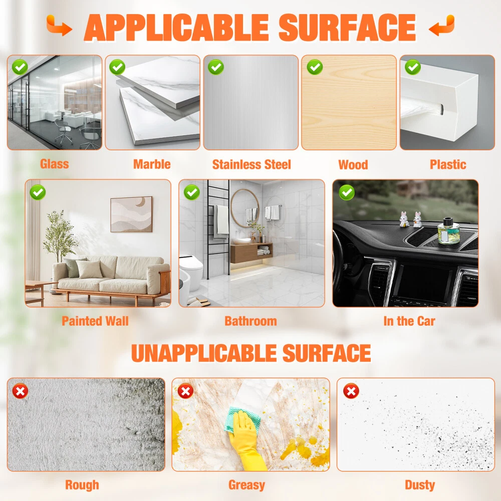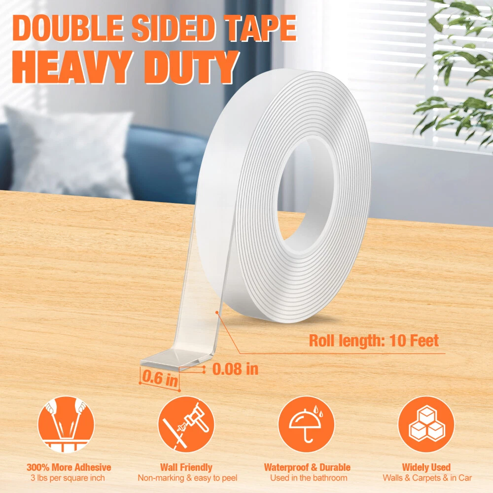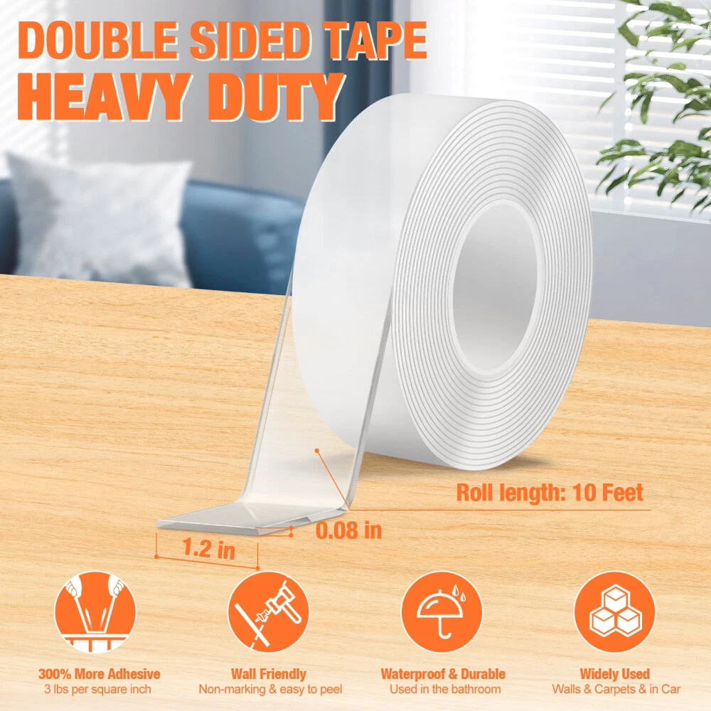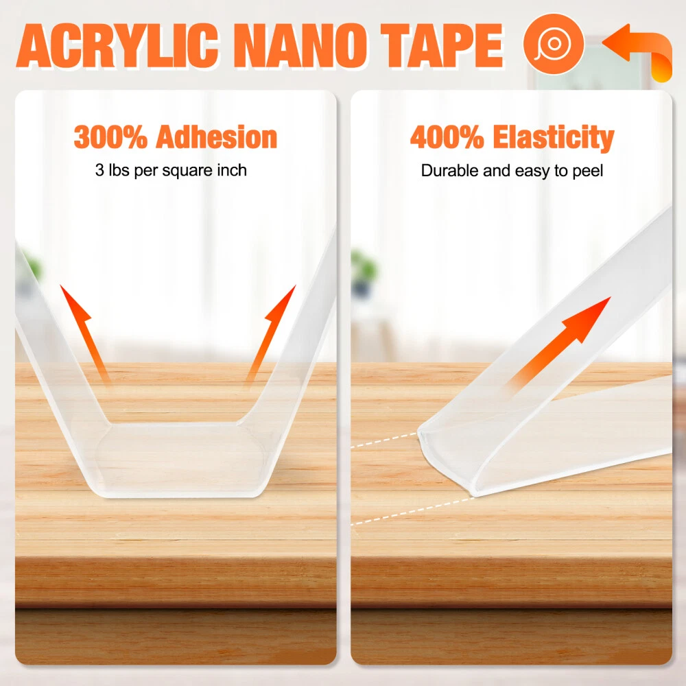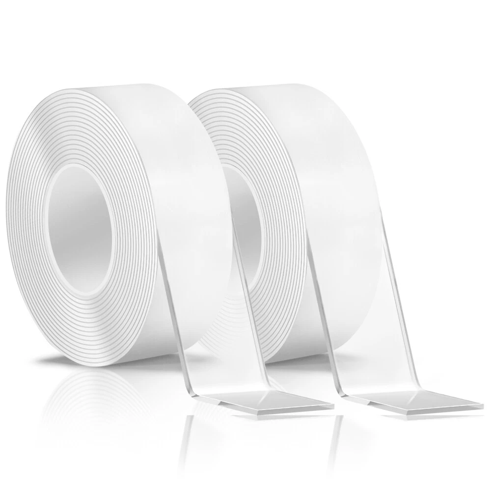 STRONG ADHESIVE Our nano glue allows easy and damage-free attachment of items to the wall.Made of leading acrylic gel material, this clear adhesive double-sided tape demonstrates strong durability and adhesion, three times that of conventional tape. And it is very easy to remove and leave no residue. MULTI FUNCTIONAL DOUBLE-SIDED TAPE The double-sided transparent tape can be used for car phone holders, posters, picture frames, pen holders, wall stickers, hooks, small tools, sticky pads, phone cases, patches, decorative items, and wall decor. Additionally, this tape is washable and reusable. SAFE NANO GEL MATERIAL: This double sided mounting tape is non-toxic, environmentally friendly and recyclable. transparent, no residue, removable. STRONG STICKY: Unlike ordinary tapes, this washable adhesive tape is used the most advanced nano-technology, made of the latest acrylic gel material, ensuring high viscosity, durability, elasticity, and residue-free performance. It adheres perfectly to smooth, clean, non-porous surfaces like glass, windows, doors, wardrobes, table tops, bathroom tiles, and marble. Not suitable for powder wall, plaster wall, rough wall, or paint wall to prevent wall damage. WASHABLE & REUSABLE: The reusable transparent two sided tape can be easily cleaned with water when dirty, but avoid using other wipes or detergents. Simply wash and dry the tape to restore its stickiness for repeated use, with the caveat that the number of uses may vary depending on viscosity. EASY TO USE: Easily cut to any size and length you want! It can be stretched, bending and folded out of shape to meet your needs. The transparent double-sided tape is very easy to remove and leave no residue. MULTI-FUNCTION AND NO MORE MESSY: Say goodbye to disorderly small items with this removable mounting tape. It is versatile and can be used in various settings such as home, office, wardrobe, and bathroom. Use it to easily fix frames, photos, festival decorations, posters, carpets, power sockets, wall stickers, hooks, small tools, pads, phone cases, patches, , wall decor and more, lightweight items.