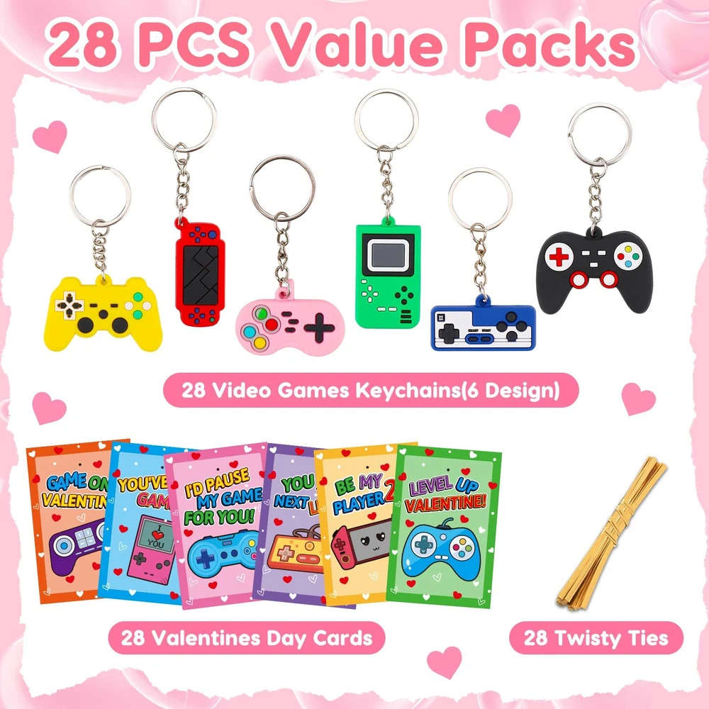 Super Value Set for Valentine's Day: These keychains for kids valentines includes 28 video game keychains, 28 cards and 28 twisty ties. Come with 6 unique designs, each personalized valentine's greeting card perfectly matched with the corresponding keychain. Great valentines day gifts for kids school, video game party favors, valentines cards for kids classroom, valentines gifts for kids Valentines Day Exchange Gifts Cards for Kids: Our boys valentines cards degign combines valentine's day with a gaming theme. Each card has a different game machine pattern, kids only need to write "To" and "From" on the reverse side to give to friends as valentines day gifts to share their love. Perfect gamer party favors decorations, class valentines day gifts for kids, valentines day goodie bags stuffers Surprise Valentine Gifts for Game Lovers: Our kids keychains has a wide range of uses, you can hang it on your school bag, keys, luggage, backpack and various other places, or as valentines gifts for kids classroom! Perfect for any video game-themed birthday party or event! Ideal kids valentines day gifts for school, toddler valentines day gifts, valentines for kids classroom, valentines classroom favors Premium Material & Good Size: Our video game controller key ring is made of alloy, and the pendant is crafted from quality rubber, which is comfortable, lightweight, and easy to carry. Ideal for kids who love games, super surprise valentines day cards for kids school, valentine class & classroom prizes, perfect for school class kids valentines, girls boys valentine cards for school Perfect Valentines Gifts: Our valentine day gifts cards with keychains is perfect for valentines party favors, video games party supplies, children's valentine's day cards, valentine's day exchanges gifts, goodies bag stuffers, classroom gift exchanges, valentine's day class prizes, preschool exchange cards, class treats, valentine gifts bulk, return gifts for birthday party and more celebrations