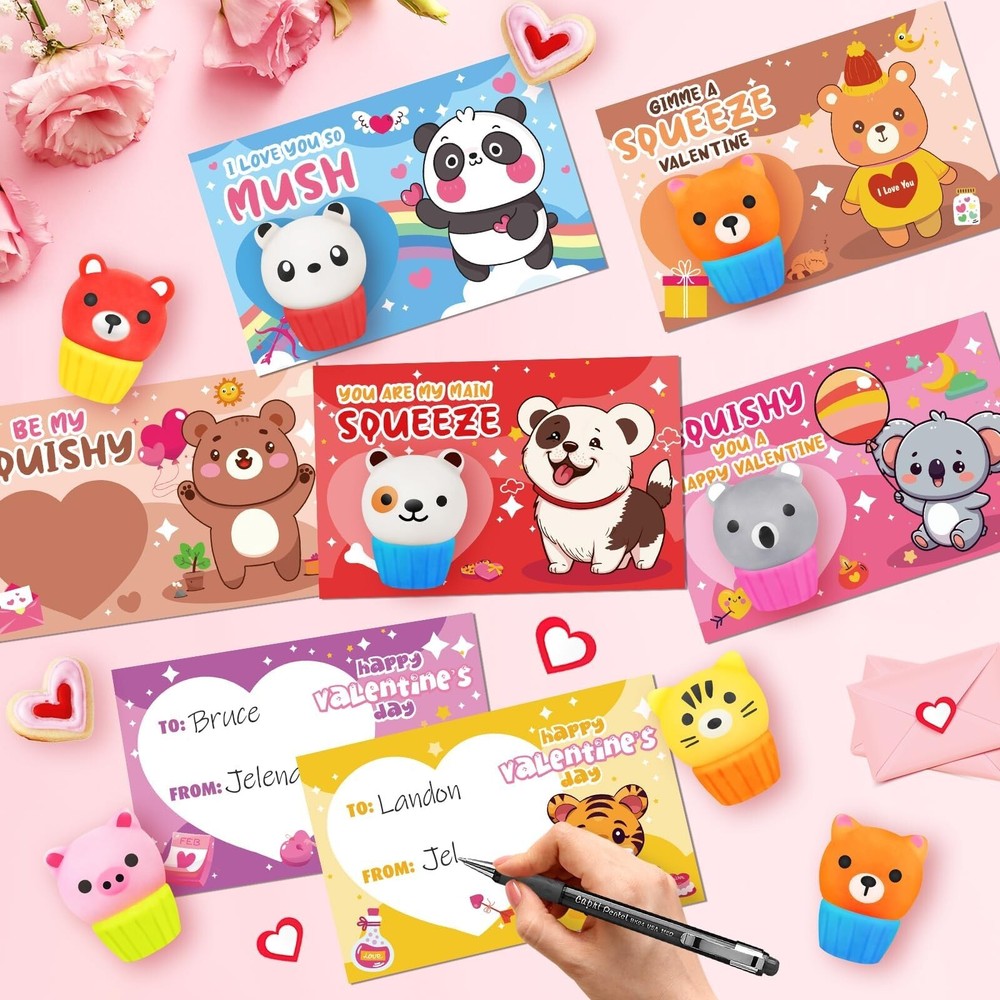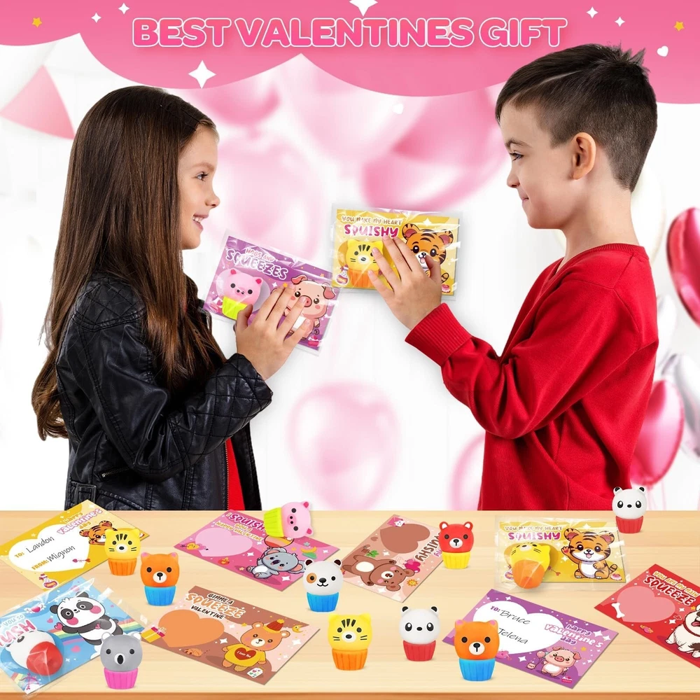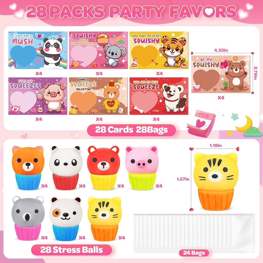 Valentines Day Gifts Cards for Kids, 28 Pack Kawaii Animals Squeeze Toys with Greeting Cards for Kid Classroom Exchange Prizes, Stretchy Toy Balls Bulk Gift, Squeeze Relief Fidget Toys for Party Favor Product Details Brand: Bstoyder Item dimensions L x W x H: 2 x 0.98 x 1 inches Item Weight: 0.55 Kilograms Manufacturer: Bstoyder Product Dimensions: 2 x 0.98 x 1 inches Item Weight: 1.21 pounds Country of Origin: China Manufacturer recommended age: 3 years and up Manufacturer: Bstoyder Value Gift Set for Kids - Our Valentines Day cards with animal squeeze toys for kids are the perfect Valentines gift! This exceptional valentines day gifts for kids includes 28 beautifully designed Valentines Day cards and 28 squeeze animal toys. The quantity is enough for the teacher to prepare a Valentine's party for the whole class. These cards are designed for kids, making them ideal for Valentines Day in the classroom or school. Well-Design Valentine's Cards - There are 7 kinds of animal squeeze toys with 7 card designs. Each with attractive decorations, and a special punchline matching a Toys theme. Boys and girls could write down their best wishes on the valentines cards to express love & gratitude for family and friends. It's a fantastic present option for kids, friends, classmates, and students in school classroom. They are sure to be a hit among kids during Valentines Day exchanges at school. "Kids Valentines Day Gift- Kids can bend, and stretch these relief fidget balls. It can help toddlers and kids learn colors and shapes, develop their brains, and improve their imagination, creativity, and hands-on ability. These balls have good flexibility, are flexible and comfortable, are easy to hold in your hand, help to relieve the fidget and tension in your daily life, and you can have fun with your friend, also share them with your friends or colleagues as a special valentines day gifts. Safe & Durable - Our squeeze animal toys are composed of soft rubber (TPR) material outer layer, not easy to break, deform, or fade, and can retain their vivid colors after a long time of use. It is non-toxic and free of BPA. It's safe for kids. These stretchy animal toys all come with 7 different animals, which makes them cute and attractive. The squeeze animal toys are about 1.57", perfect for kids to catch, and can be placed in a bag and carried anywhere. Kids will love this Valentine's stretchy gift for classroom. Ideal Gift for Valentine's Day - Kids can write best wishes on the Valentine's greeting card, and give them to their friends on Valentine's Day. Children could exchange gifts and share their love with their family, friends, and classmates. Our Valentine's greeting cards set with animal squeeze toys is perfect for Kid's Valentine's Day. It's a great gift option for kids' school classroom prizes, Valentine's Day gifts for kids school, class events, party favor supplies, or any Valentine's occasions.