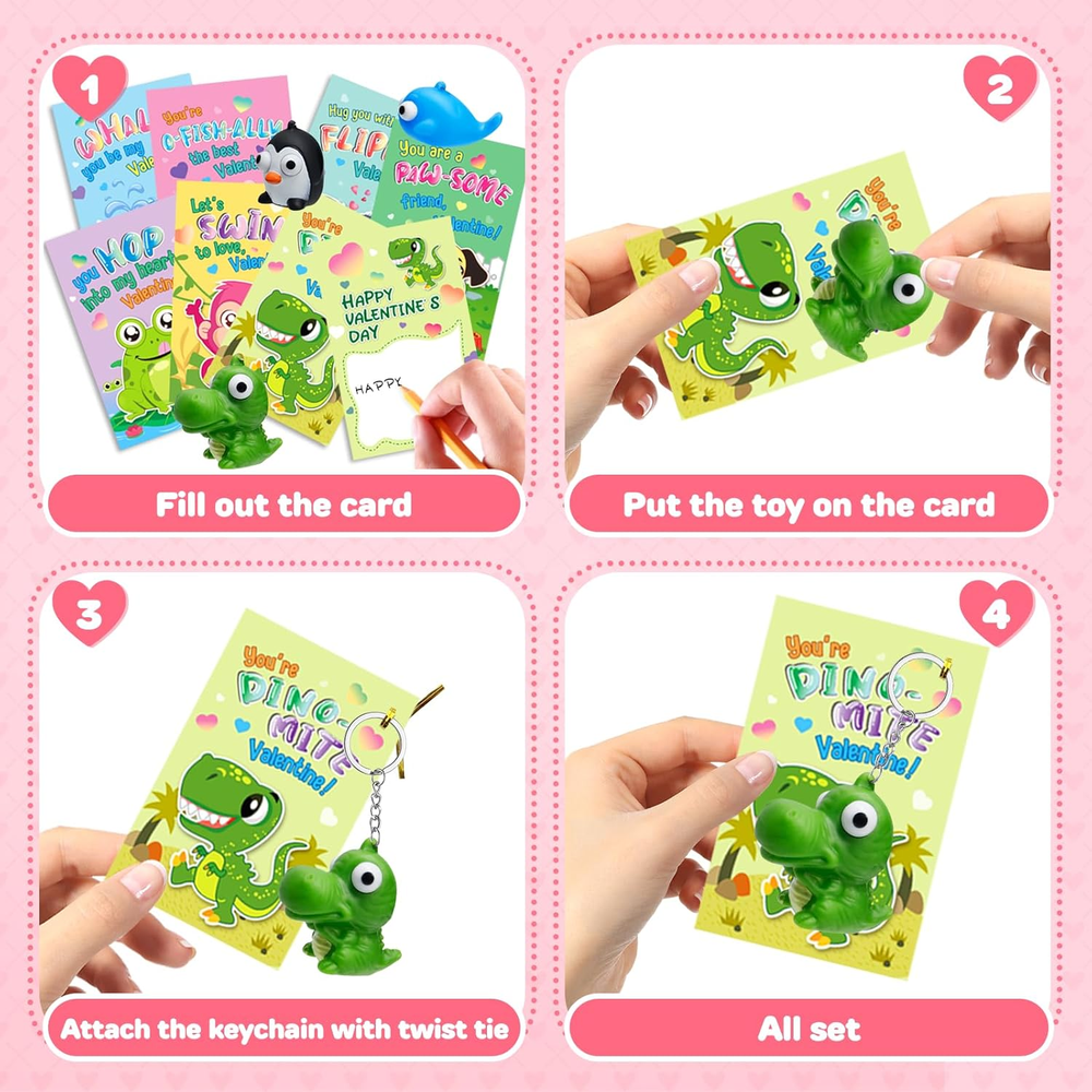 Great Valentine's Day Gift Set - If you're looking for a unique and funny Valentine's Day gift for kids, our popping eyes keychain is the perfect choice! This set includes 28 pcs cards + 28 animal keychains in 7 different styles. Each Valentines Card has a special blessing that matches the animal keychains. Quantity enough for your child to share with classmates. Let’s prepare interesting Valentine’s Day gifts for the kids! Great Valentine's Day Gift Set - If you're looking for a unique and funny Valentine's Day gift for kids, our popping eyes keychain is the perfect choice! This set includes 28 pcs cards + 28 animal keychains in 7 different styles. Each Valentines Card has a special blessing that matches the animal keychains. Quantity enough for your child to share with classmates. Let’s prepare interesting Valentine’s Day gifts for the kids! Funny Card Design - Compared with traditional Valentine's Day cards, our cards add more lovely cartoon elements and rich colors, making your child's gift stand out. Each Valentines card has a cute, humorous messages that uniquely match the animal keychains. Get ready to write blessings on the card and exchange it on Valentine’s Day, will bring endless fun to the kids. High Quality & Easy to Assembly - For the health and safety of children, we use high demanding quality standards. Animal keychains made of safety material, non-toxic, non-BPA. And the cards part is made of high quality coated paper, which is Clear printing and bright colors. The entire set of products has passed the children's product safety test and complies with US toy standards. Tie the keychain and card together with a twist tie, the unique Valentine's Day gift is ready! Fit for Various Occasions - This great value is Ideal gifts for kids valentines day gifts, school event prizes,valentines class exchanging gifts and other. By squeezing the animal, children can atisfying relax fun and entertaining, both entertaining and practical.We believe kids will like this, but if you are not satisfied for any reason, please let us know and we will refund your amount. Product Description