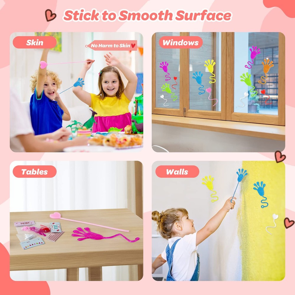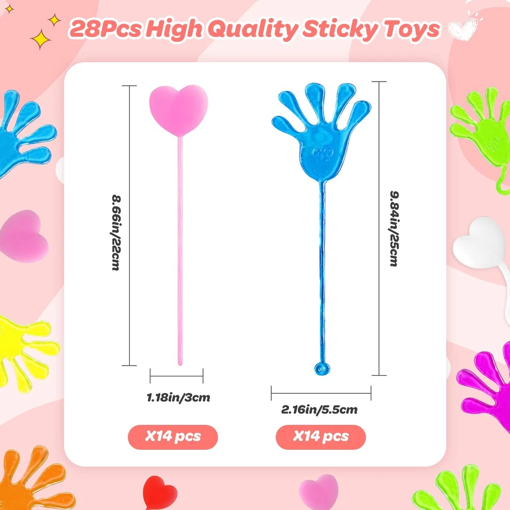 【Package Includes】 Cute Valentines Cards × 28 (4 Designs, 7 Each) Slap Sticky Hands × 14 Slap Sticky Hearts × 14 (The sticky toys come with bright colors randomly including pink, red, yellow, blue, green, orange, etc.) 【Recommended Age】 Suitable for Boys Girls Kids Ages 3+ Perfect for kids Valentines day cards and gifts for friends, Valentine's Day exchange and giveaways, Valentines boxes for kids, bulk Valentines Day party favors for kids 3-5, Valentines goodie bags stuffers, preschool toddler baby Valentines Day gift basket, Valentine Day treats bags, prizes for kids classroom and more! 【28Pack Valentines Day Gifts for Kids】Our toddler valentines toy set comes with 28pcs cute Valentines Day Cards and 28pcs colorful sticky toys (14pcs sticky hands & 14pcs sticky hearts). Lovely designs and sufficient quantity can perfectly meet the needs of Valentines cards for kids classroom exchange and Valentines party favors. Let’s make an impressive Valentines for kids classroom! 【Valentines Cards with Unique Greetings】Each sticky fidget toy is individually wrapped in packages. Humorous greetings are printed on the kids Valentines day cards to match the sticky toys. Kids could sign name on To-From area of the greeting cards, expressing their sincere blessing and appreciation to their friends and classmates. 【Cute Stretchy & Sticky Bulk Toys】The sticky toys are in various bright colors, gooey, stretchy, and soft. Vivid hand-shaped and heart-shaped design can arouse kids’ interests. Kids will have great fun in flinging or tossing the sticky toys on the walls, doors, windows, skins or any smooth surface. Hope these fidget toys for kids provide infinite fun in this class Valentines! 【Great for classroom Valentines Exchange】As kids Valentines gifts, the sticky sensory toys are perfect for Valentines day cards for kids school exchange, goodie bags stuffers for kids, Valentines treats, classroom prizes, and preschool Valentines for class! Your kids will have an unforgettable fidget Valentines with our sticky hands and sticky hearts. 【Great for classroom Valentines Exchange】As kids Valentines gifts, the sticky sensory toys are perfect for Valentines day cards for kids school exchange, goodie bags stuffers for kids, Valentines treats, classroom prizes, and preschool Valentines for class! Your kids will have an unforgettable fidget Valentines with our sticky hands and sticky hearts.