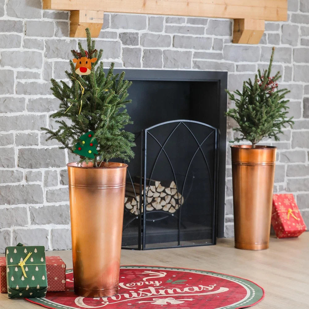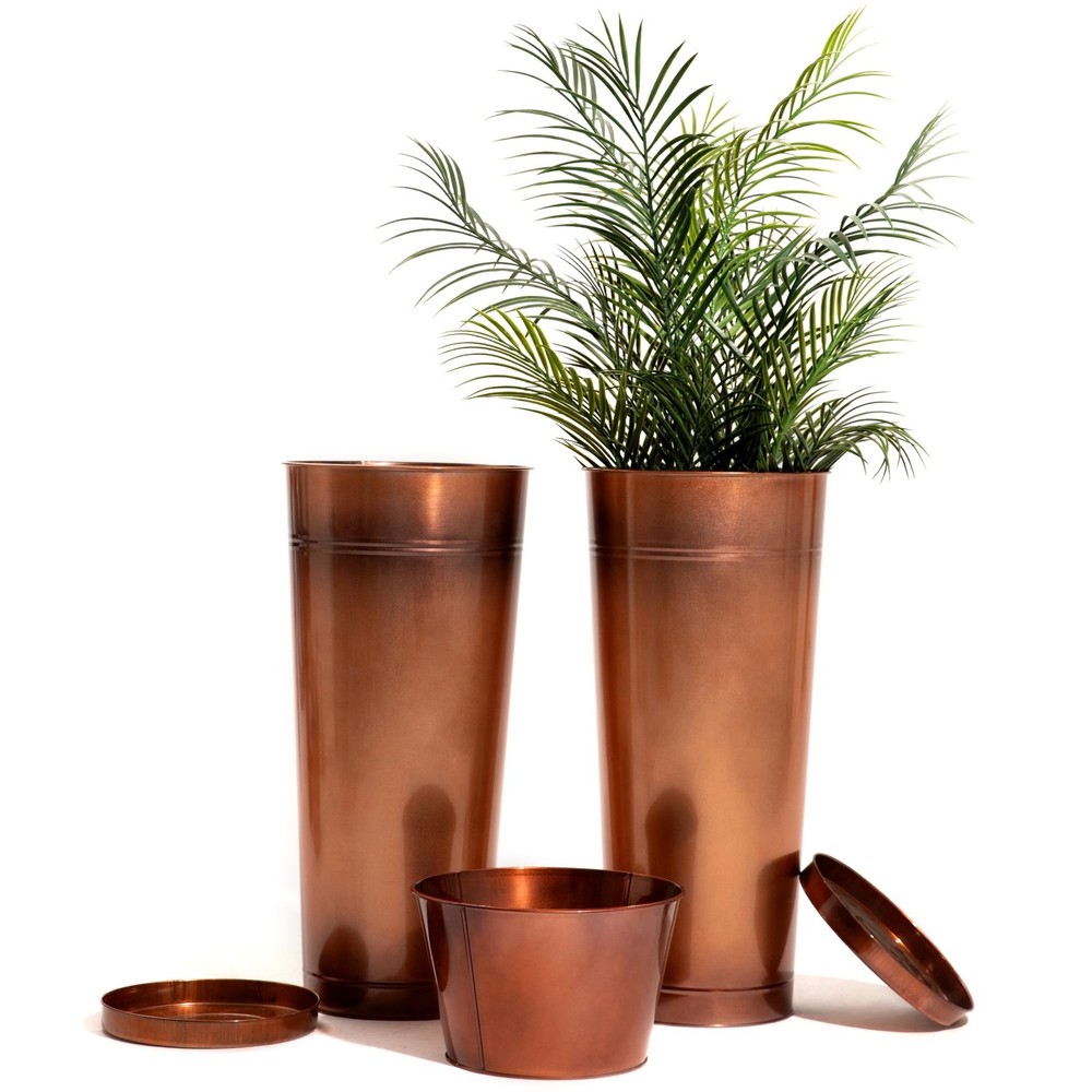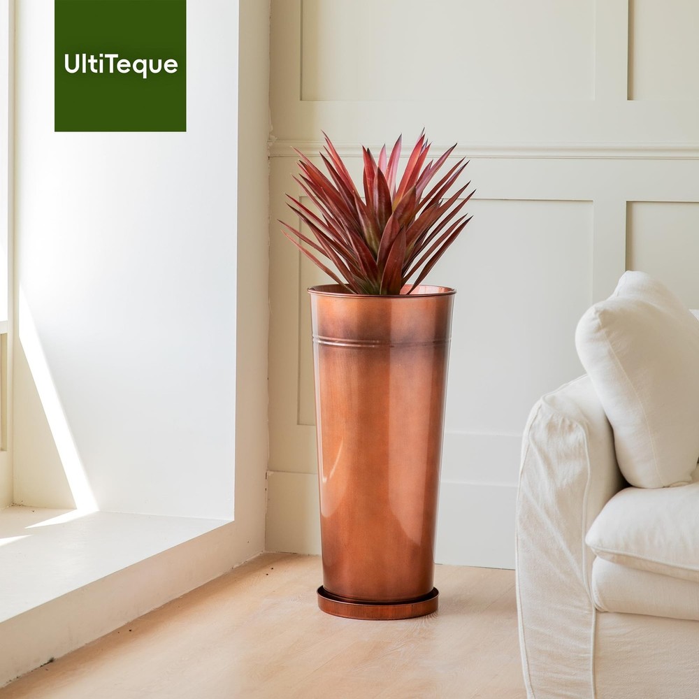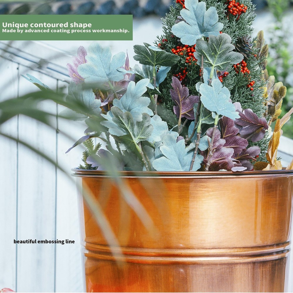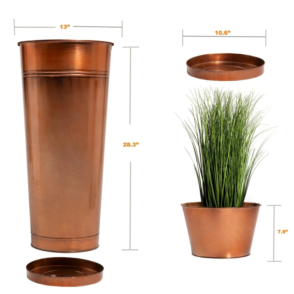 28in Tall Copper Planters Set of 2,Galvanized Steel Tall Outdoor Planter for Indoor/porches- Copper Color(2planters,2inner pots with Holes,2trays) Product Details Material: Galvanized steel, Metal Color: Vintage Copper Special Feature: Includes Inner Insert, Porch planter, Stain Resistant, handmade, portability Style: Casual Planter Form: Plant Pot Color: Vintage Copper Product Style: Casual Planter Form: Plant Pot Shape: Round & Tall Pattern: Solid Theme: Vegetable Other Special Features of the Product: Includes Inner Insert, Porch planter, Stain Resistant, handmade, portability Mounting Type: Floor Standing Material Type: Galvanized steel, Metal Finish Types: Brushed Indoor Outdoor Usage: Indoor, Outdoor Item Dimensions D x W x H: 13.4"D x 13.4"W x 28"H Number of Pieces: 2 Number of Levels: 1 Item Dimensions: 13.4 x 13.4 x 28 inches Size: 28in copper Brand Name: UltiTeque Included Components: planting pot and sauces Set Name: 2 planters Model Number: Ulti-hy25b Manufacturer Part Number: Ulti-hy25b Unit Count: 288.0 Ounce Manufacturer: Paishun co-friendly quality material: The metal tall copper planter is 28 inches. Height,13. The width, equipped with removable inner POTS, saucers, and drainage holes, makes potting easier, watering effectively and lifting your plants effortlessly. What's more, the flowerpot is made of galvanized metal, which won't rust. Prevent rain erosion. More durable than a concrete flowerpot. More environmentally friendly than plastic flowerpots. It can be reused. Indoor&porches Use:UltiTeque features is a a Antique copper tall metal planter and beautiful addition to your home garden or any ground space centrepiece, and creating a stunning focal point that will transform your interior space. Each piece surface is handmade, making it one-of-a-kind and unavailable elsewhere.Upon close examination, one can discern subtle variations in the shade and texture of each planter. Each planter possesses its own unique characteristics! Regarding color: Keep in mind that the handmade nature may result in slight variations and imperfections, but we believe this only adds to the charm of the product. Manual spray painting may cause uneven coating thickness. Prolonged sun exposure (over three months) can fade color. Recommended for indoor or porches use!! Accompanied with: Ideally for houseplants, especially vertical accents like snakeplants, dracaena, bromeliads, or pencil cactus. Outdoors it will beautifully house herbs like basil or rosemary, or an arrangement of flowers centered around an architectural upright plant. Durable Construction: Crafted by High precision mechanical equipment, premium quality craftsmanship and customer service. Any damages or dissatisfied with these planters, we offer 100% fully refund.