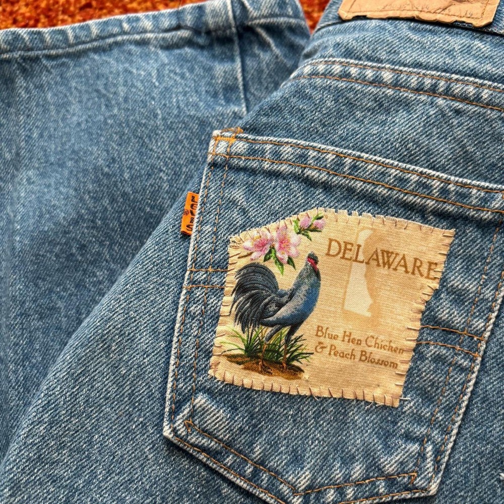 28x30.5 patchwork vintage 1970s-80s Levis orange tab jeans Good condition, original Delaware rooster patch on the back Ladies style levis with zipper fly, good shape Bundle for free shipping