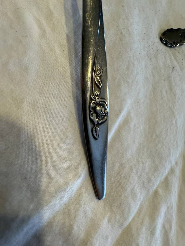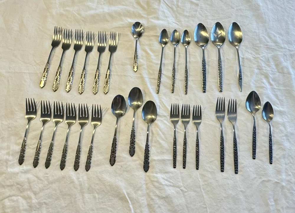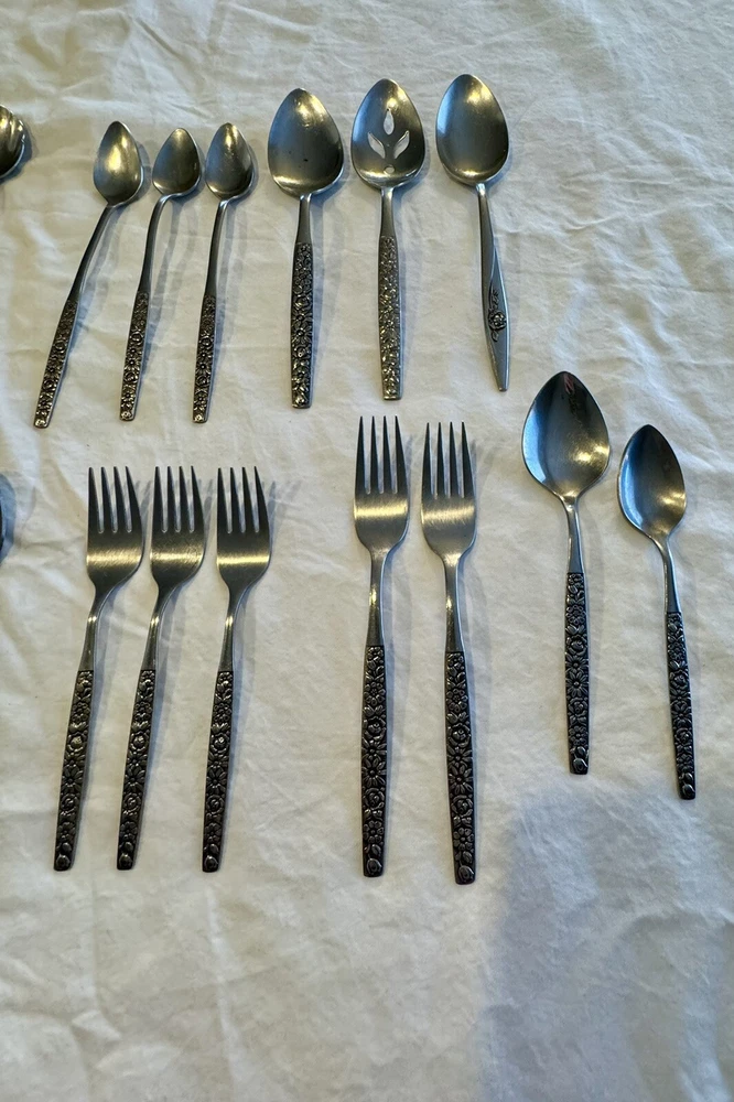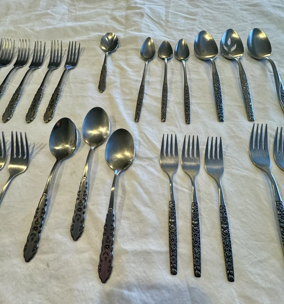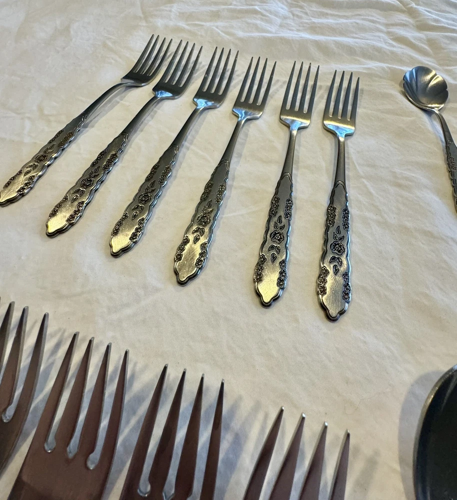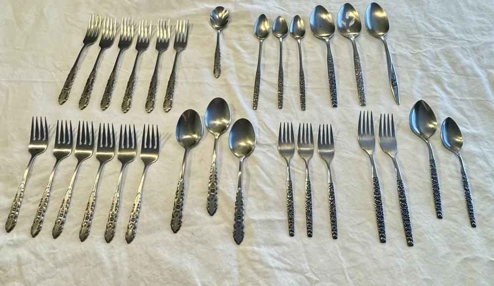 This 29 piece mixed lot consisting of mostly half and half Oneida floral bouquet and Wm Rogers Malibu flatware plus one single spoon with a rose pattern on the handle (still Oneida but unsure of the name of this style) Lot features various utensils such as knives, forks, spoons… This traditional and beautiful style flatware is perfect for all occasions! Can be used for anyone with the love of flowers and Oneida brands, or even for crafts. Whatever your heart desires! Each piece may have surface scratches or slight tarnish but is overall in good condition! Lot includes: 6 smaller forks FLORAL BOUQUET by Oneida 6 larger forks FLORAL BOUQUET by Oneida 3 larger spoons FLORAL BOUQUET by Oneida 1 scalloped shaped spoon FLORAL BOUQET by Oneida 3 Narrow, Long, (stir?) spoons MALIBU by Wm Rogers Oneida 2 larger spoons MALIBU by Wm Rogers Oneida 1 smaller spoon MALIBU by Wm Rogers Oneida 1 larger SLOTTED spoon MALIBU by Wm Rogers Oneida 2 larger forks MALIBU by Wm Rogers Oneida 3 smaller forks MALIBU by Wm Rogers Oneida 1 spoon with a ROSE handle, also by Oneida. 29 pieces total! See ALL pictures!! Great collection of beautiful flatware!
