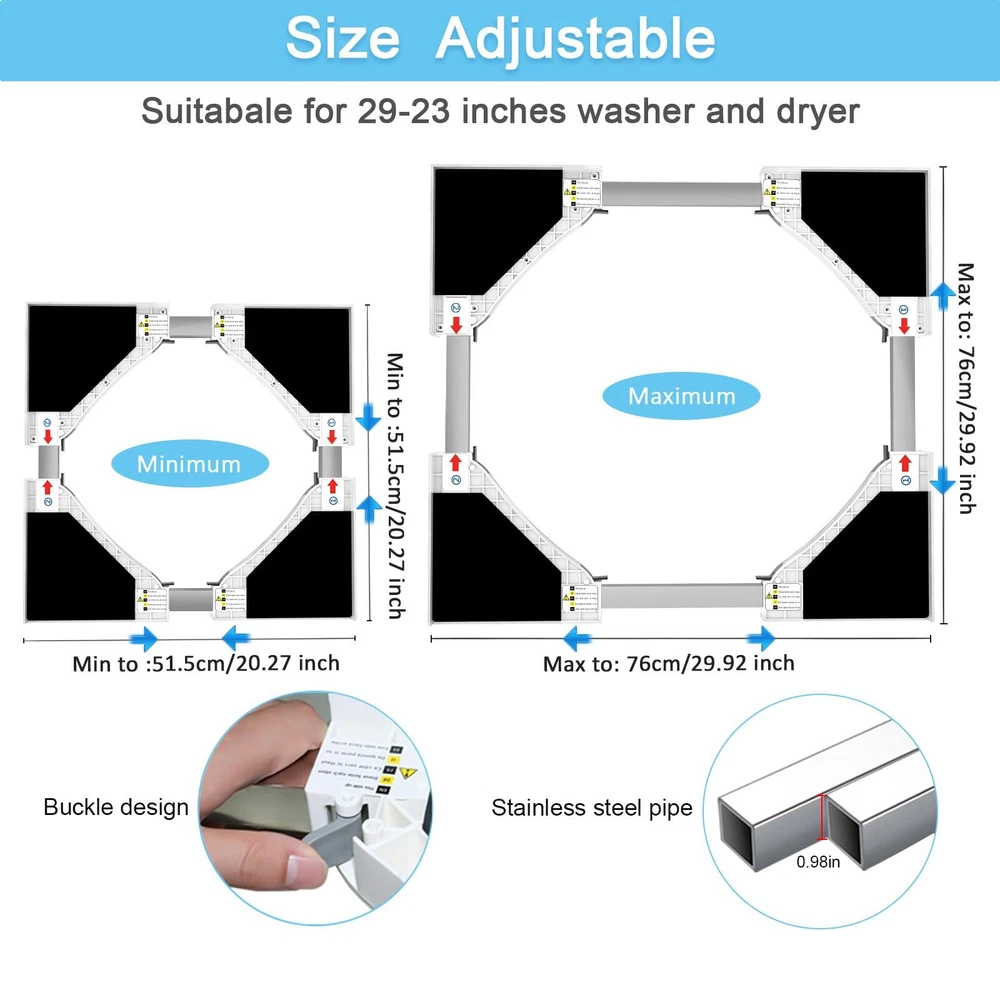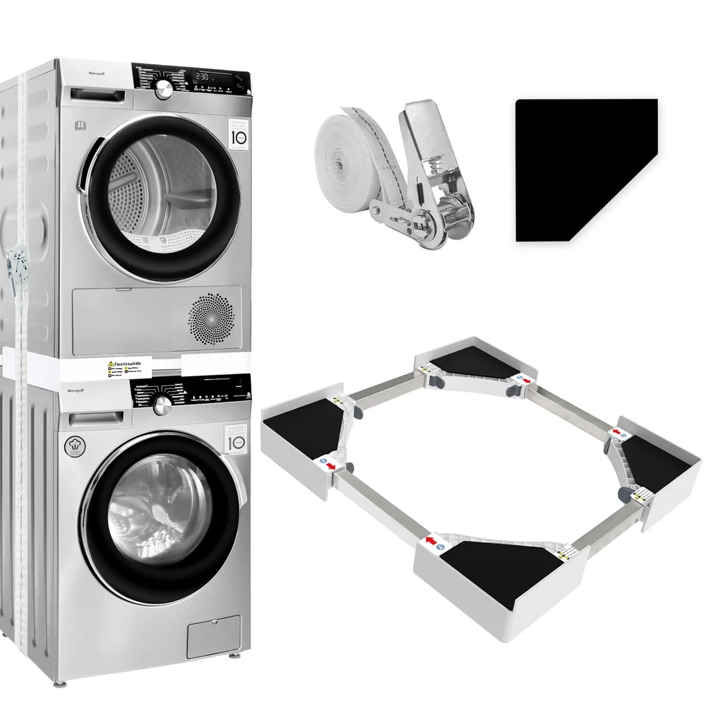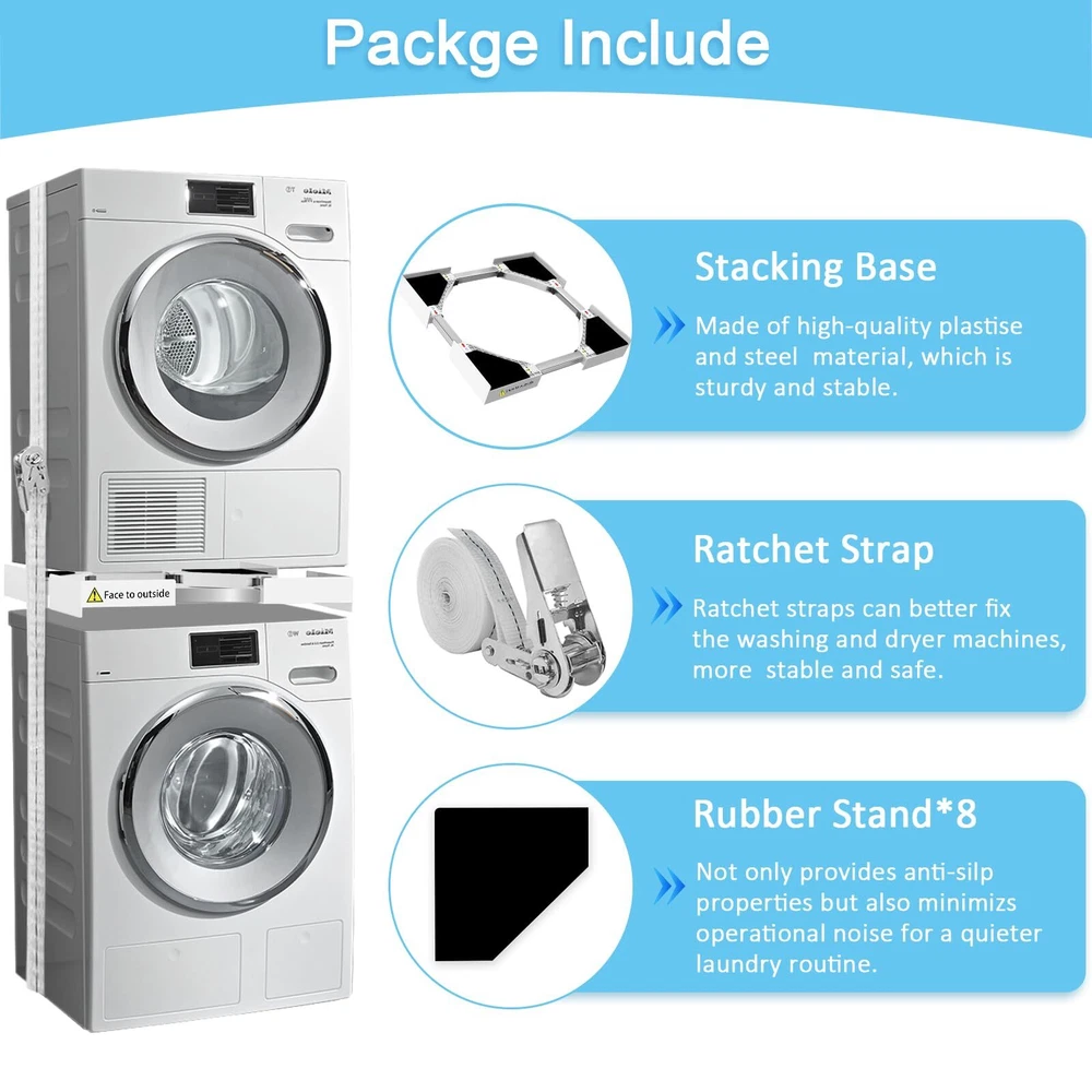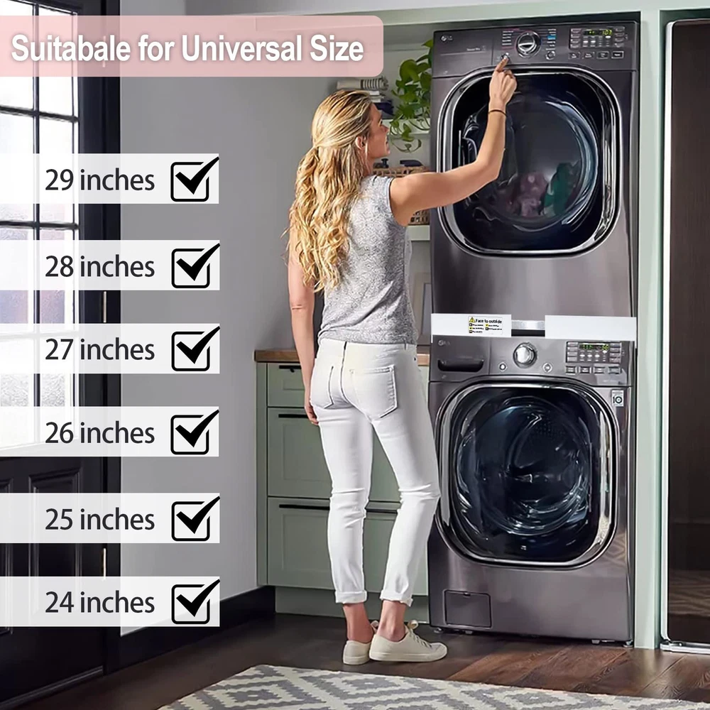 Stacking kit Applicatons: This washing machine stacking kit be used to help you install the dryer on the top of your washing machine, which greatly saves your storage space, making your living space more tidy Universally Applicable: Adjustable Staking kit for more different size washer/dryer machine, universal for 29"/28"/27"/26"/25"/24" washer/dryer, max to the 76 x 76 cm/29" x 29"(W x D). Please notice before ordering Premium Quality: 29 inch Stacking Kit for Washing Machine and Dryer is made of high-quality plastic and steel substance, which is sturdy and stable, sturdy, anti-corrosion, anti-rust with a long service life Easy to Use: No hardware or tools required, just take 5 minutes to the instructions to install. Finally put the dryer on top of the washing machine and then fix it with ratchet straps and you can enjoy a comfortable life Brands: Stacking Kit for Washer and Dryer is the perfect size for a wide range of washing machines. Include, Whirlpool, GE, Samsung, LG, Frigidaire, Bosch, Maytag, Kenmore, Electrolux, Amana, Crosley and Admiral