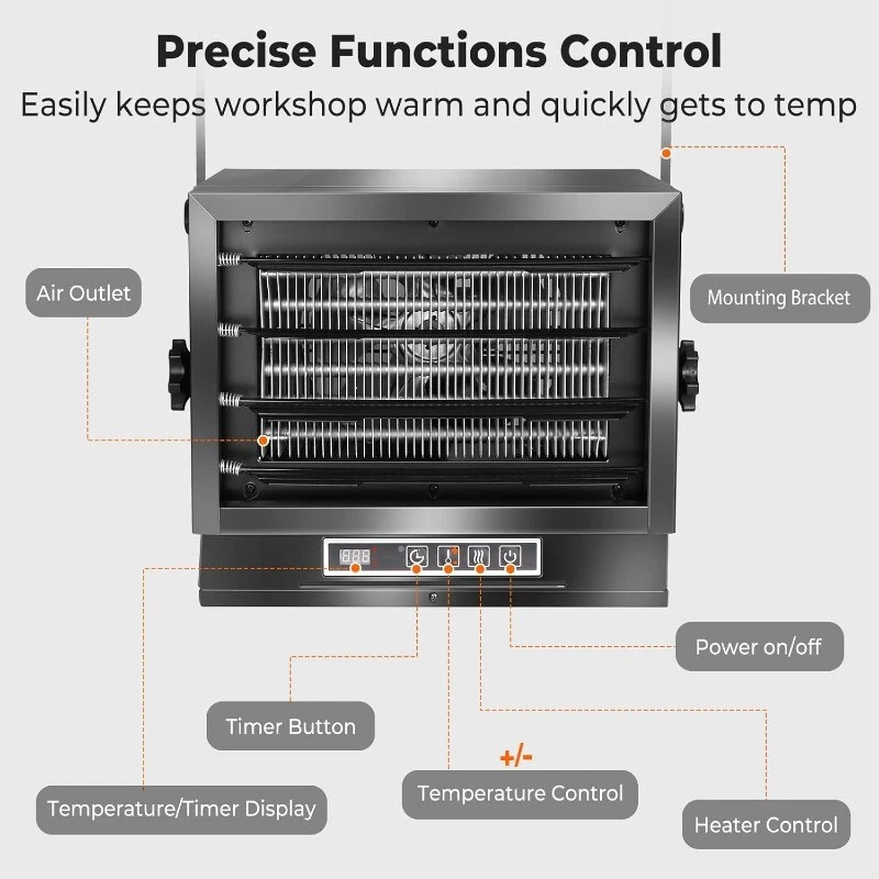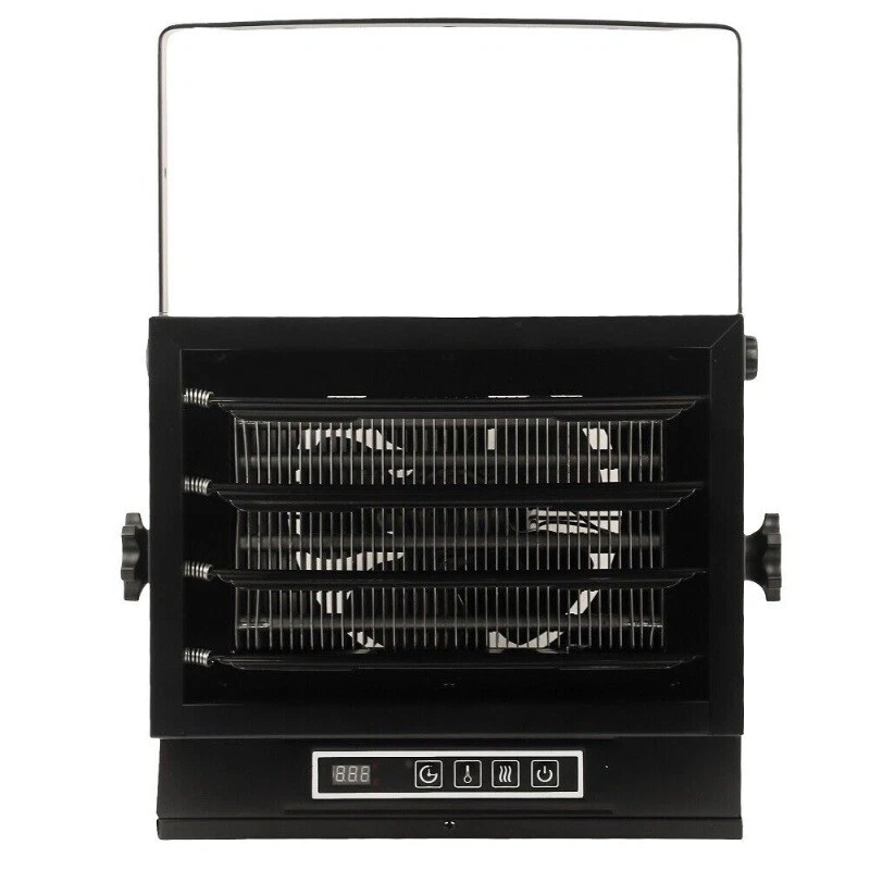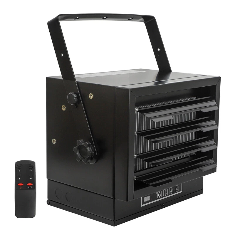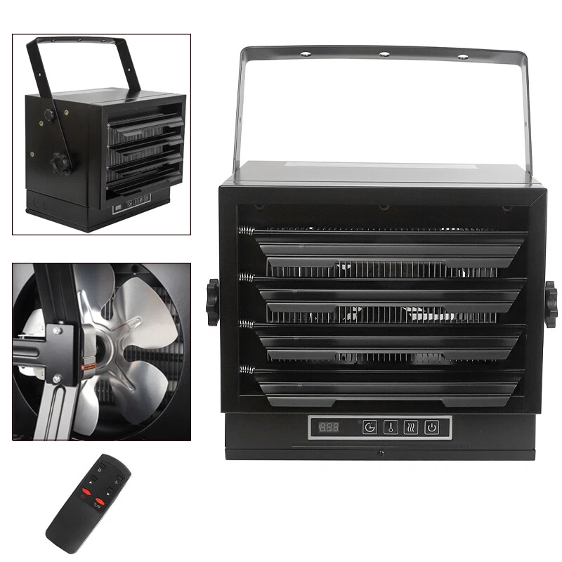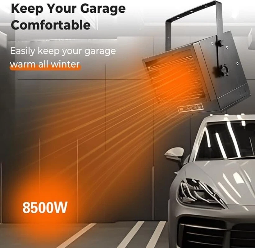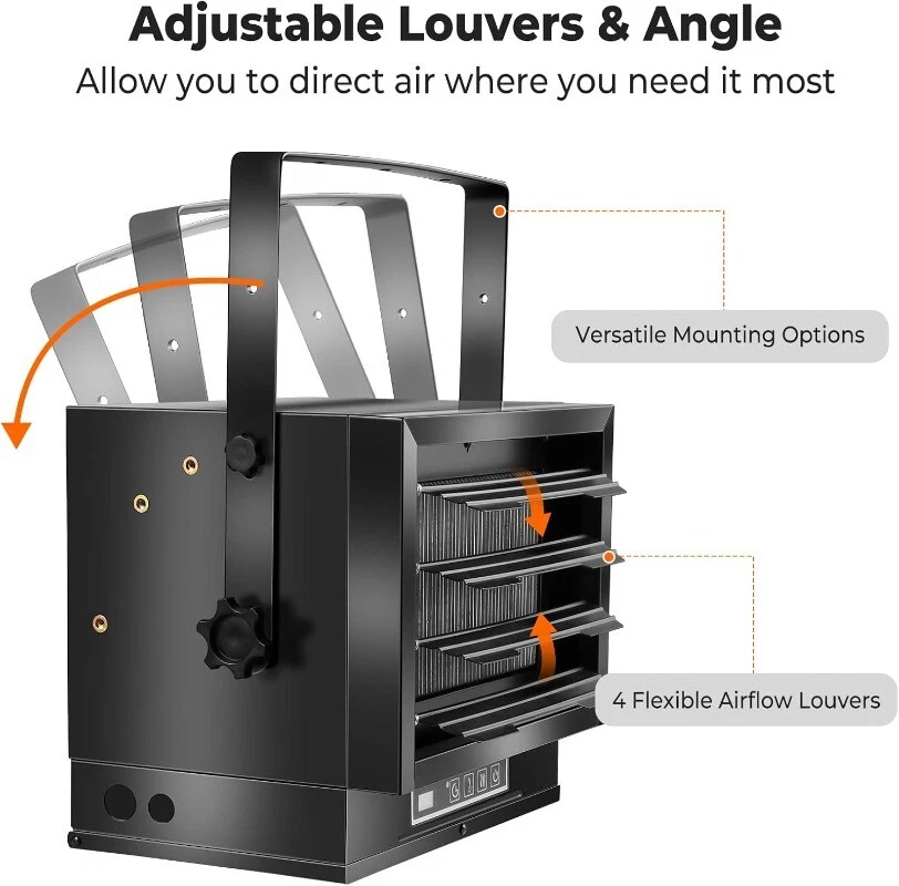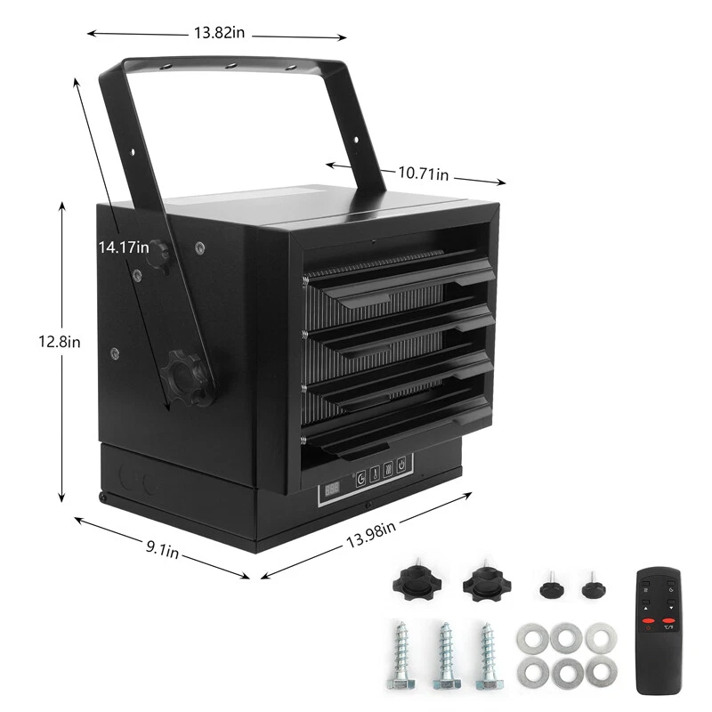 29010 BTU Forced Air Electric Garage Heater Wall Warmer 240V Warehouse Workshop Description: Adjustable & 2 Heat Settings: This garage heater has adjustable panels for precise airflow direction. Its maximum BTUs of 29010 is powerful enough to heat a large area up to 750 square feet. Power ranges from 6400W to 8500W to meet your different needs; Built-in adjustable thermostat with 2 Heat Settings Overheated Protection: The garage heater is equipped with safety features to prevent overheating. It utilizes a durable heating element and has built-in thermostats and fuses. If the heater detects overheating, it will automatically shut off to prevent any potential hazards. Convenient Remote Control and LED Touch Screen Display: The heater comes with a remote control for convenient operation. It also features an LED touch screen display that allows you to easily monitor and adjust the settings. Timer Function: This garage heater includes a timer function that lets you set an auto-off timer ranging from 1 to 8 hours. Additionally, it has a smart ECO mode that can automatically adjust the heating mode or turn off the heater based on the ambient temperature. These features help you save energy and reduce heating costs. Safe & Sturdy Structure: The heater is constructed from heavy-duty steel material, making it strong, durable, and long-lasting. It is ETL certified, ensuring that it meets safety standards for your peace of mind while using it in your workshop or garage. Specifications: Main Color:Black Main Material:Iron power:8500W Volts: 208/240V/60Hz Watts:6400W/8500W BTUS: 21843 BTU and 29010 BTU Package Size: 18.7"L x 14.6"W x 15.7"H Package Weight:25.40lbs Product Features: Durable Heating Element Built-in adjustable thermostat with 2 Heat Settings Over-heating Protection Convenient remote control and LED touch screen display and control Adjustable angles for horizontal and vetical mounting bracket with safety lock Adjustable panels for precise airflow direction Space saving ceiling mounted design