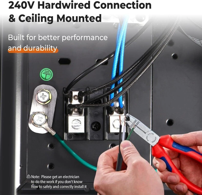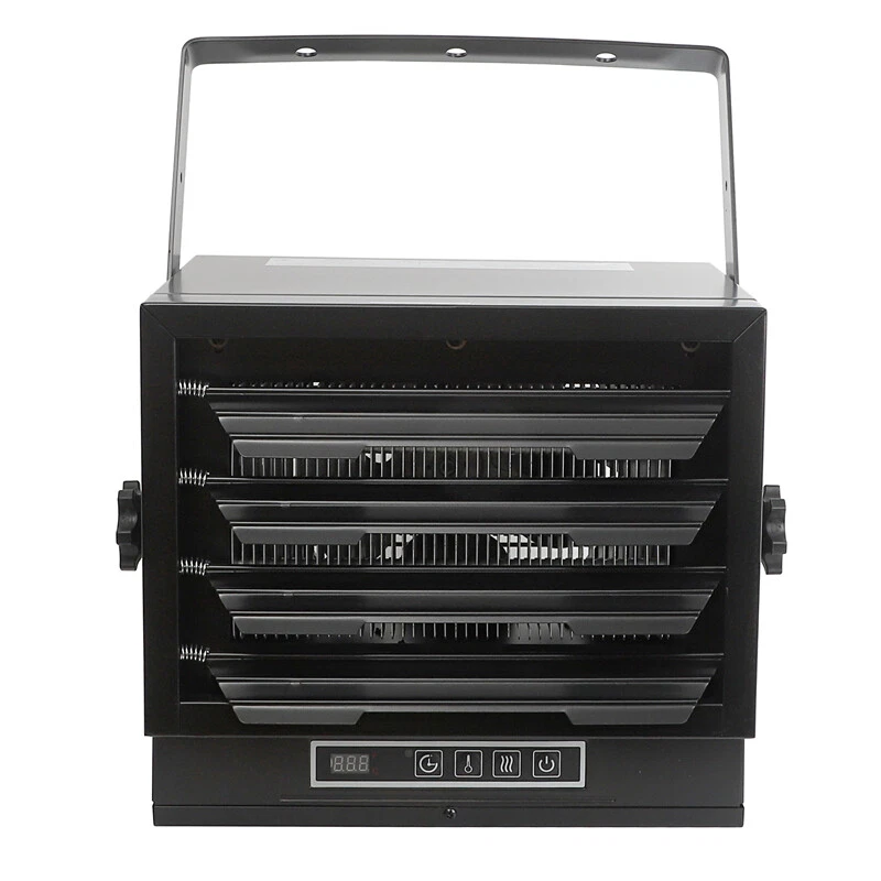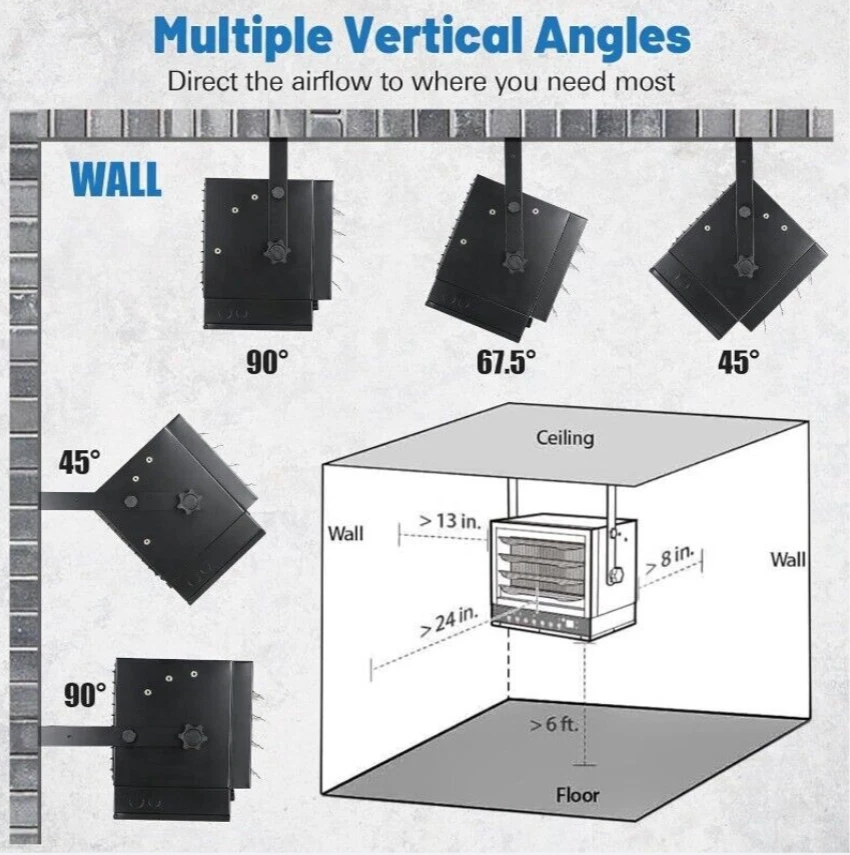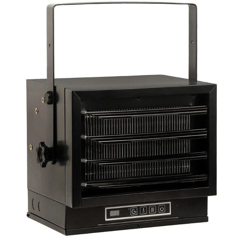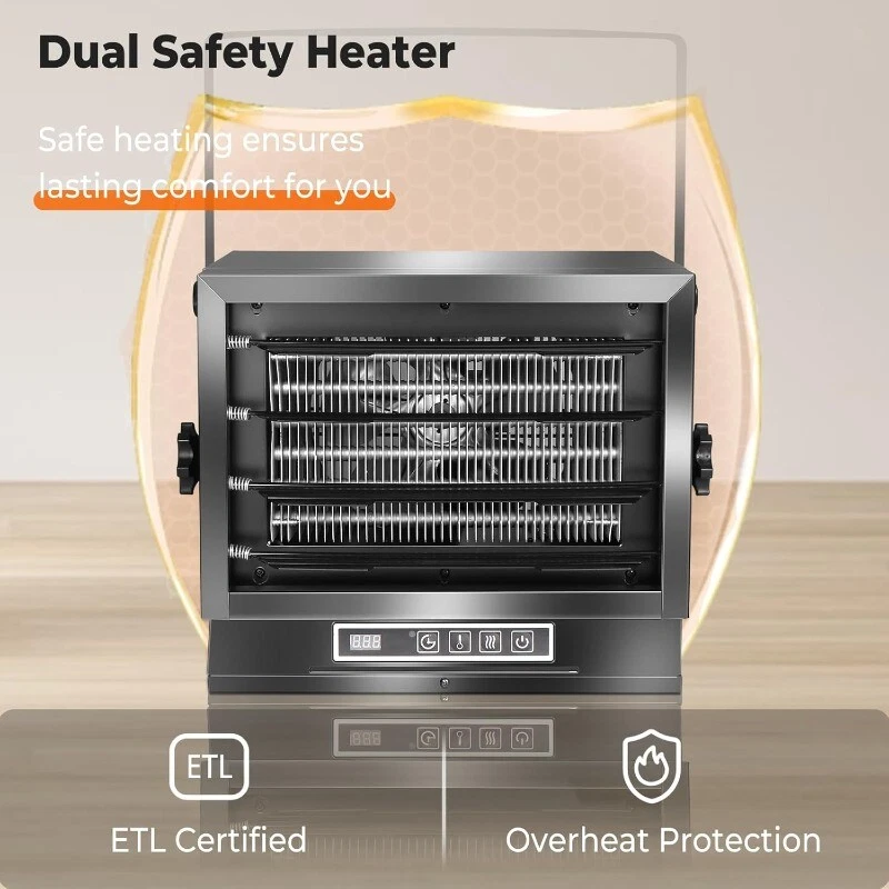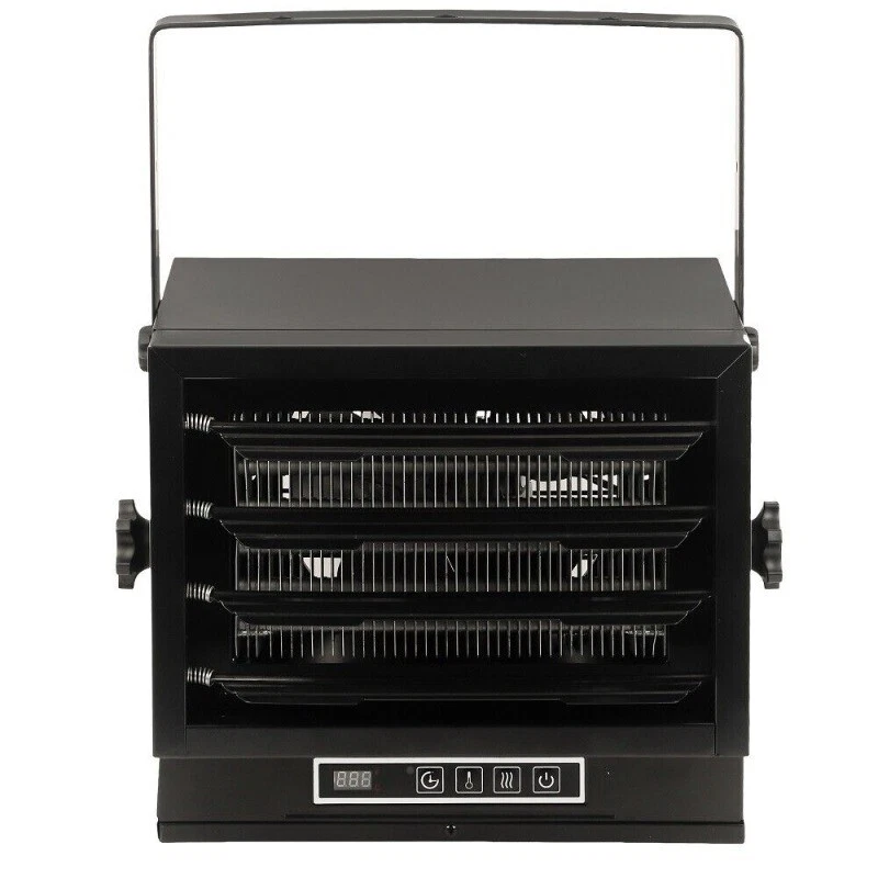 29010 BTU Forced Air Electric Garage Heater Wall Warmer 240V Warehouse Workshop Description: Adjustable & 2 Heat Settings: This garage heater has adjustable panels for precise airflow direction. Its maximum BTUs of 29010 is powerful enough to heat a large area up to 750 square feet. Power ranges from 6400W to 8500W to meet your different needs; Built-in adjustable thermostat with 2 Heat Settings Overheated Protection: The garage heater is equipped with safety features to prevent overheating. It utilizes a durable heating element and has built-in thermostats and fuses. If the heater detects overheating, it will automatically shut off to prevent any potential hazards. Convenient Remote Control and LED Touch Screen Display: The heater comes with a remote control for convenient operation. It also features an LED touch screen display that allows you to easily monitor and adjust the settings. Timer Function: This garage heater includes a timer function that lets you set an auto-off timer ranging from 1 to 8 hours. Additionally, it has a smart ECO mode that can automatically adjust the heating mode or turn off the heater based on the ambient temperature. These features help you save energy and reduce heating costs. Safe & Sturdy Structure: The heater is constructed from heavy-duty steel material, making it strong, durable, and long-lasting. It is ETL certified, ensuring that it meets safety standards for your peace of mind while using it in your workshop or garage. Specifications: Main Color:Black Main Material:Iron power:8500W Volts: 208/240V/60Hz Watts:6400W/8500W BTUS: 21843 BTU and 29010 BTU Package Size: 18.7"L x 14.6"W x 15.7"H Package Weight:25.40lbs Product Features: Durable Heating Element Built-in adjustable thermostat with 2 Heat Settings Over-heating Protection Convenient remote control and LED touch screen display and control Adjustable angles for horizontal and vetical mounting bracket with safety lock Adjustable panels for precise airflow direction Space saving ceiling mounted design
