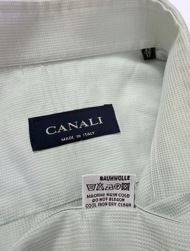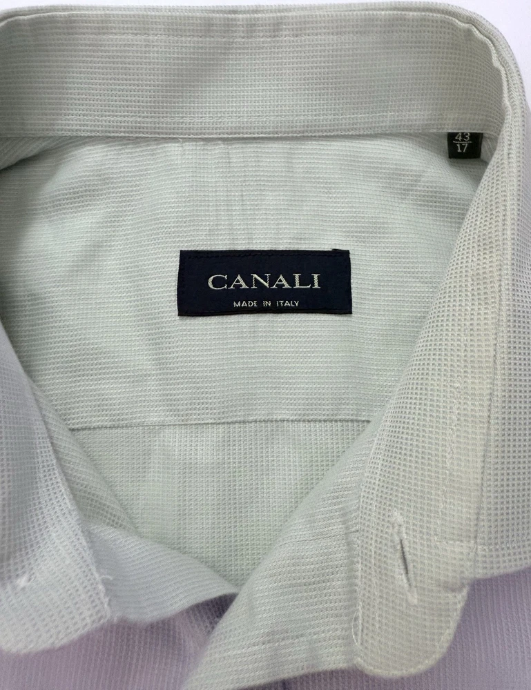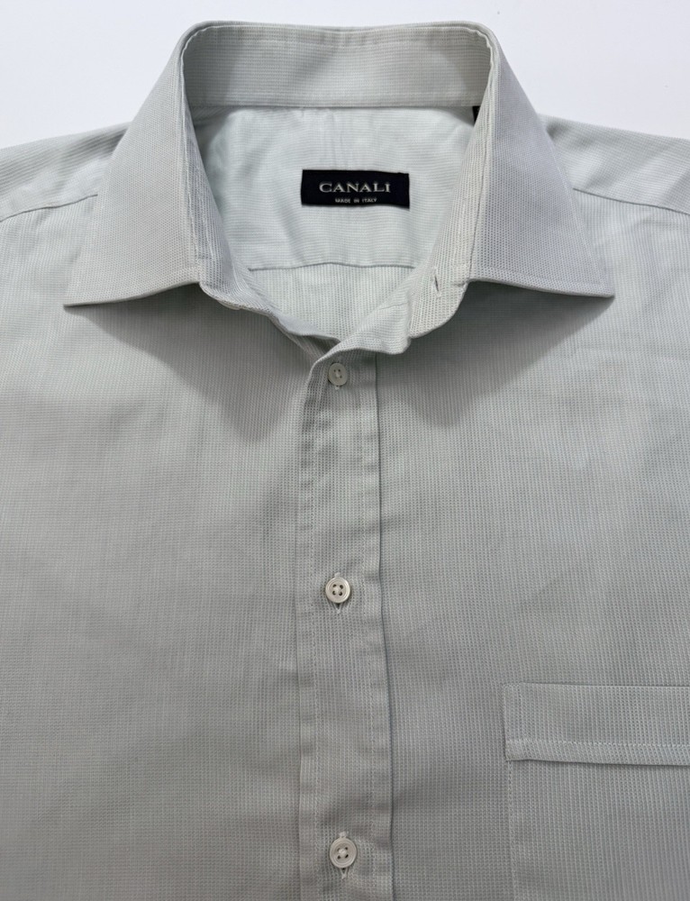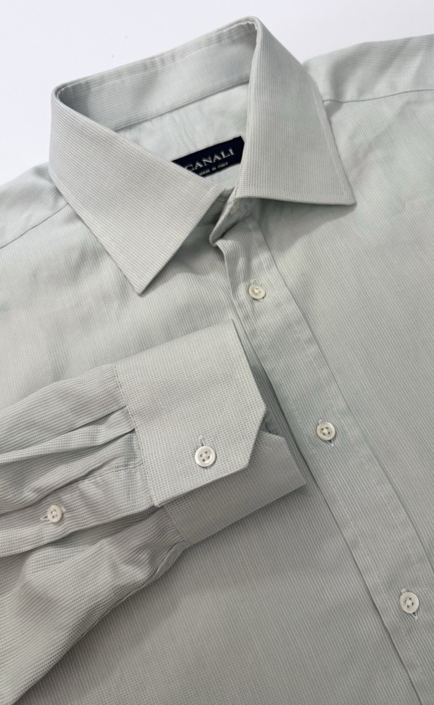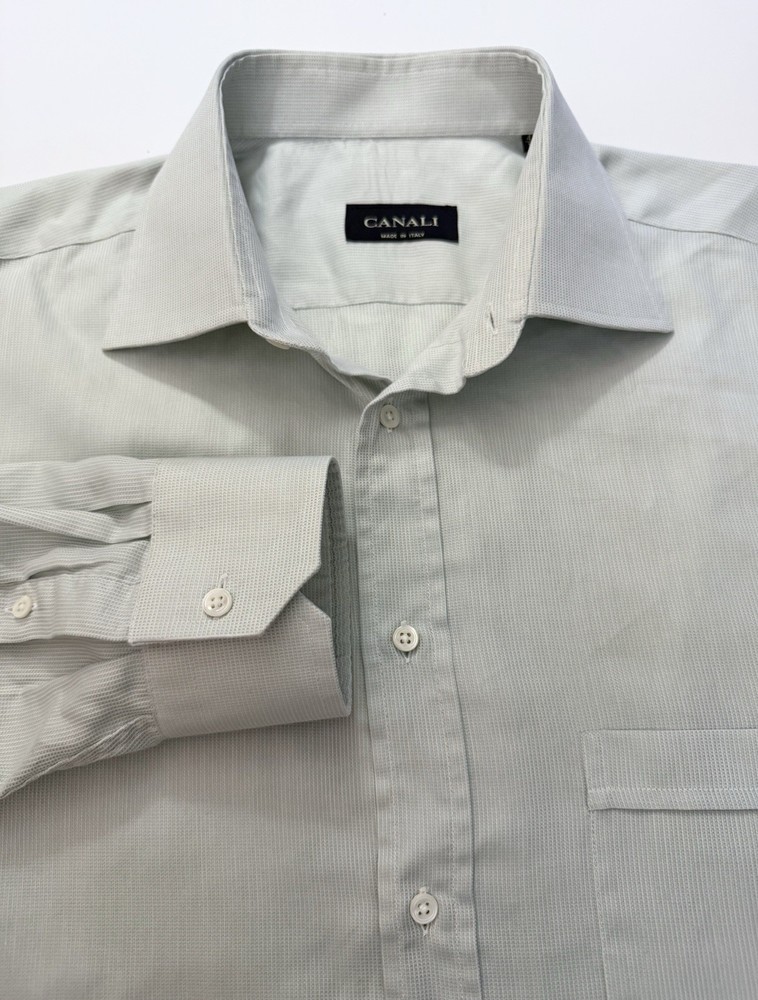 EUC. No signs of wear or flaw. LNWOT. Looks unworn or new. The product is a high-quality Canali dress shirt for men, made in Italy. It features a solid light green and hint of blue color with a textured weave, perfect for various occasions including formal events, workwear, and casual outings. With a spread collar, barrel cuff, and button closure, this shirt offers a classic and preppy look. The cotton material and machine washable fabric make it easy to care for and suitable for all seasons. With its designer Italian theme, this shirt is a versatile and stylish addition to any man's wardrobe. CANALI is a high end Italian brand known for its quality craftsmanship. Measurements: Armpit to armpit: 25” Shoulder to hem: 32” Curve hem FLAT FEE NEXT DAY SHIPPING WITHIN THE US
