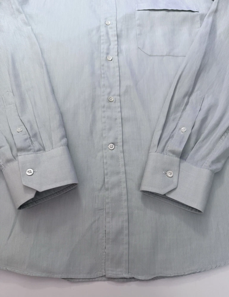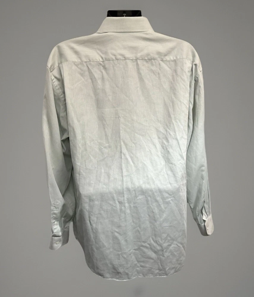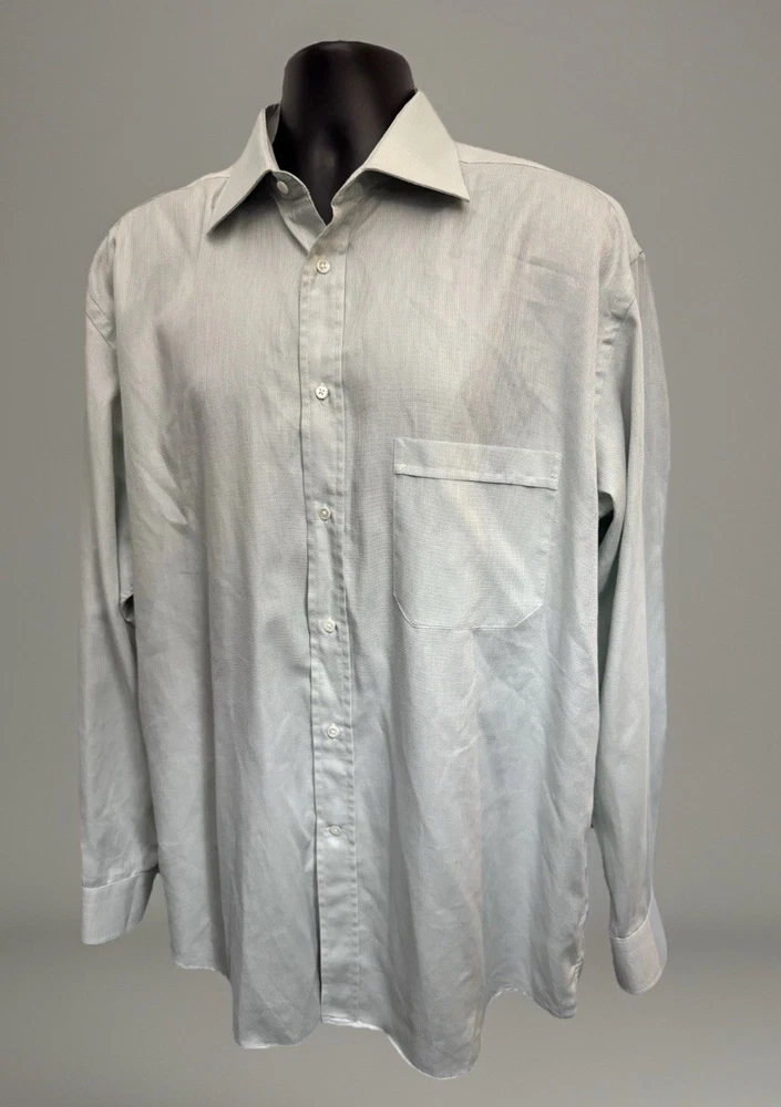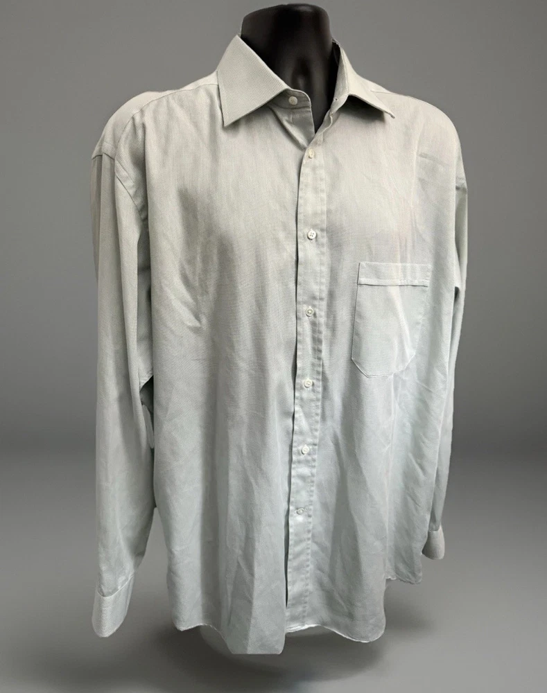 Accents: Button Pattern: Solid Sleeve Length: Long Sleeve Fabric Type: Woven Collar Style: Spread Size: 17/43 Closure: Button Occasion: Business, Casual, Christening, Formal, Party/Cocktail, Travel, Wedding, Workwear Features: All Seasons, Easy Care Department: Men Size Type: Regular Country of Origin: Italy Garment Care: Machine Washable Sleeve Type: Long Sleeve Material: Cotton Brand: Canali Color: Light Green and Hint of Blue Type: Dress Shirt Fit: Regular Neckline: Collared Theme: City, Classic, Designer, Italian, Preppy Top Cuff Style: Barrel Cuff Neck Size: 17 in