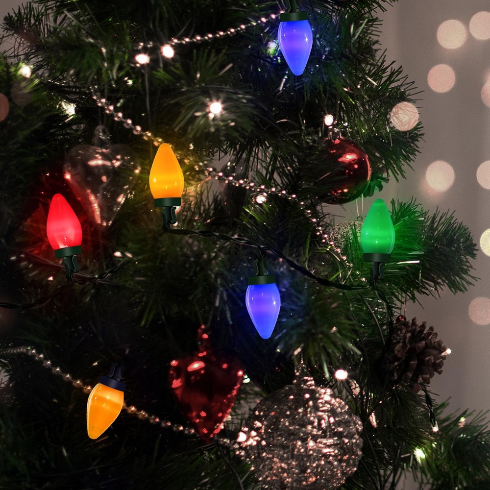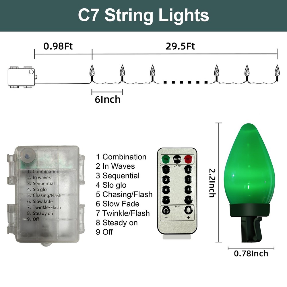 Christmas Lights, 29.5 FT 60 LEDs C7 Battery Operated Strings Lights 8 Modes with Auto On/Off Time for Xmas Tree Garland Garden Patio Indoor Outdoor Christmas Decorations 【Battery-Operated & More convenient】Powered by 3*AA batteries (1.5V)(Not Included), totally 4.5 V, do not have to plug it into an outlet, no need extension cord, and can decorate it anywhere, especially suit for place or object that away from socket, perfect for Christmas , christmas trees, wreath, bushes, garden etc. 【Automatically Timer 】The use of remote control timing function, timing function is only a 6 hours on 18 hours off, remote control TIMER close to the power, press the TIMER button, the light flickers weakly once, indicating that the timing function is on, press the timer button again, the light flickers weakly three times, indicating that the timing function is off. 【8 Modes】Includes combination, in wave, sequential, slo glo, chasing/flash, slow fade, twinkle/flash, and steady on, giving you a impressed experience of lights show, enhancing your holiday atmosphere. 【IP65 Waterproof】 Sturdy plastic housing, waterproof plastic strip, enable the christmas lights to prevent rain and water from entering effectively. Perfect for indoors and outdoors christmas decoration, such as christmas trees, wreath, bushes, garden etc. 【Safety & High Quality】Just need 3*AA batteries, no need socket and extension cord, much safer and convenient. Besides, all products have been examinated for many times after produced, you can purchase it confidently. If any problem, you can email us and we will respond within 24hours.