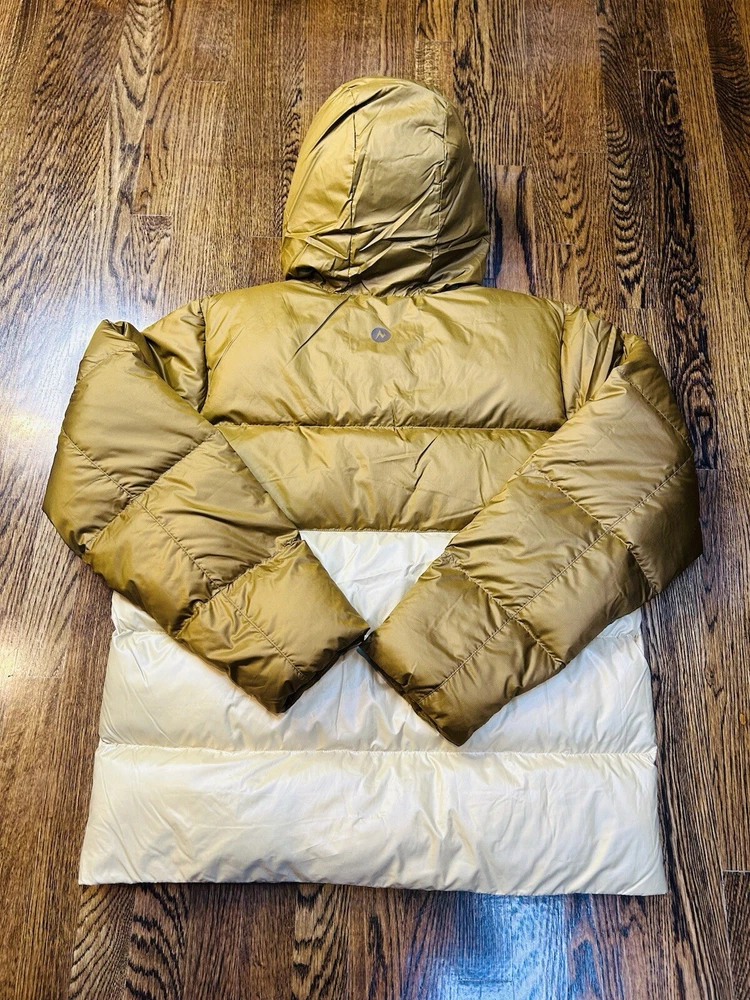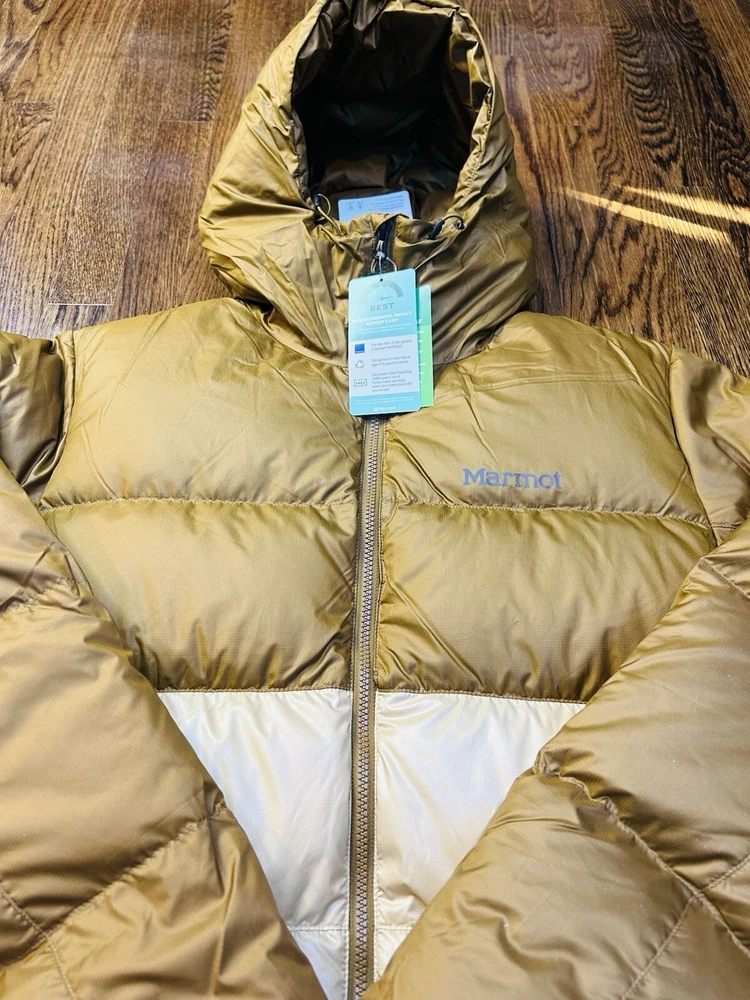 Stay warm and stylish with this Marmot Guides Down Hoody Puffer Jacket in Hazel Brown Cream. Made with soft shell fabric and a stand-up collar, this mid-length parka features a full zip closure and zipped pockets for your convenience. The jacket is wind-resistant, lightweight, and quick-drying, making it perfect for winter outdoor activities like skiing, hiking, and hunting. The Marmot Down product line ensures that you get the best quality in a jacket that is machine washable. This jacket is perfect for travel, casual wear, and workwear. The jacket is available in size 2XL and is a regular fit. The Marmot Guides Down Hoody Puffer Jacket is a must-have for anyone who wants to stay warm and fashionable in the winter season.