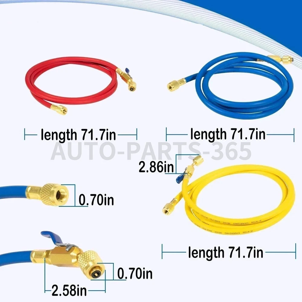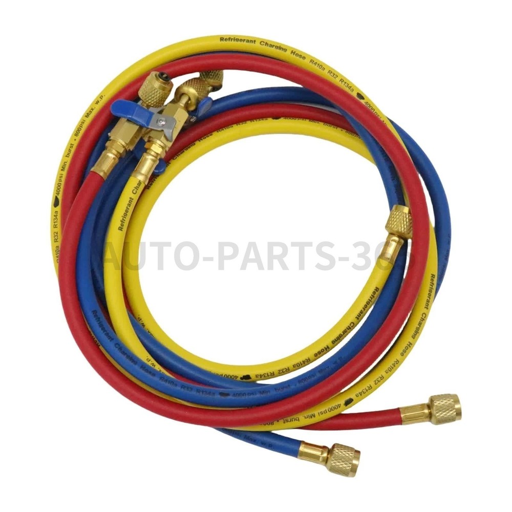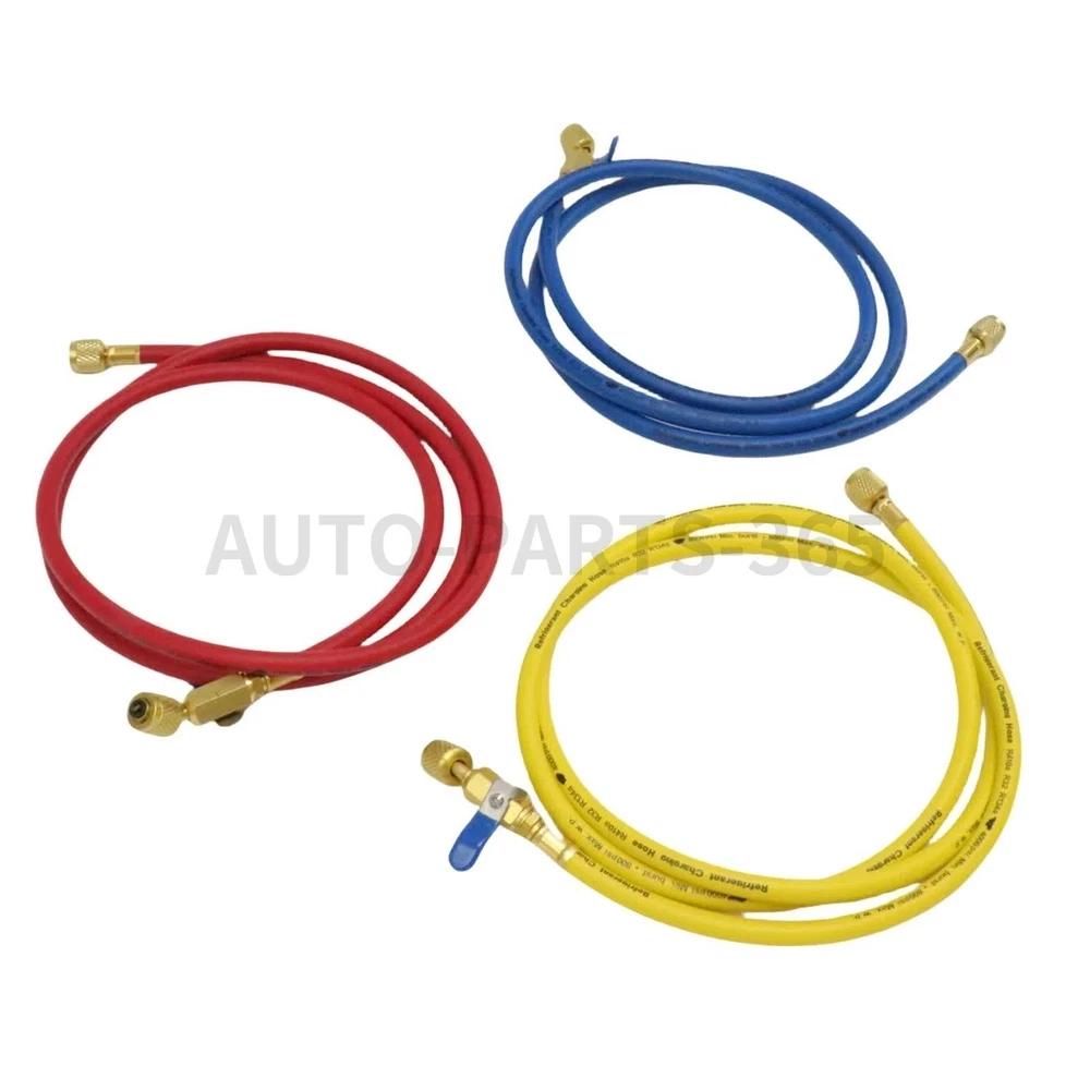 Product Details Material: Brass, Rubber Color: red blue yellow Item Weight: 2.3 Pounds Maximum Pressure: 4000 Pound per Square Inch Item Length: 72 Inches Specific Uses For Product: HVAC and A/C maintenance, Refrigerant charging Batteries Included?: No Batteries Required?: No Adaptation: 29986 hose recommended for R-410A, necessary tool for HVAC, car air conditioning (A/C) maintenance and adding coolant Professional Design: Compact, lightweight design is easy to install and use. Ball valve design with quarter turn valve handle switch for refrigerant control. it can be operated with one hand Product Details Material: Brass, Rubber Color: red blue yellow Item Weight: 2.3 Pounds Maximum Pressure: 4000 Pound per Square Inch Item Length: 72 Inches Specific Uses For Product: HVAC and A/C maintenance, Refrigerant charging Batteries Included?: No Batteries Required?: No Adaptation: 29986 hose recommended for R-410A, necessary tool for HVAC, car air conditioning (A/C) maintenance and adding coolant Professional Design: Compact, lightweight design is easy to install and use. Ball valve design with quarter turn valve handle switch for refrigerant control. it can be operated with one hand Function: Full flow valves using standard gaskets and valve openers. Metal handle on the end of the hose is suitable for sealing the area and traps all gas High-quality Material: Made of brass and high-quality rubber, with strong airtightness and high safety. High-quality HVAC instrument hose for durability and reliability; Diaphragm valve with rotary ball valve seal for more reliable sealing and reduced wear Specifications: Replaces part number: 29986, 72" long 1/4" hose, blue hose*1, red hose*1, yellow hose*1, three total, hose with compact ball valve end. Minimum burst pressure is 4000 psi (276 bar) and maximum working pressure is 800 psi (55 bar). Operating temperature is -20F to 180F (-28.8°C to 82.2°C). Minimum Bend Radius: 6" (152mm) Notice: A. Manual measurement, please allow slight errors in size. B. Due to different screen display, the color may be slightly different Buyers must read: please confirm whether the part number or photo of the product matches your original before purchasing