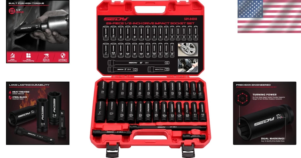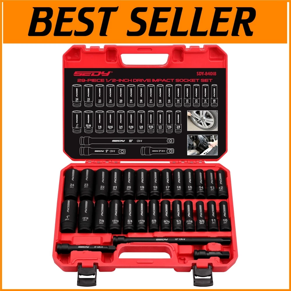 29-Piece 1/2" Drive Impact Socket Set - Chrome Vanadium Steel | SAE & Metric ‹ › ‹ › ‹ › ‹ › ‹ › ‹ › ‹ › ‹ › ‹ › ‹ › ‹ › 29-Piece 1/2" Drive Impact Socket Set - Crafted from high-quality Chrome Vanadium Steel - Includes both SAE and Metric sizes Features: High Durability: Made from premium CR-V material with a black phosphate finish for unbeatable hardness and long-lasting performance. Precision Engineering: Deep and shallow metric tool sockets are expertly perforated and chamfered to enable greater torque and effortless identification with laser marking. Versatile Utility: Ideal for automotive repairs, large equipment maintenance, and home improvement projects. The set includes 3 Shipping Free & Fast Shipping - We offer free shipping to most of the USA with a normal delivery time of 3-10 businessdays. However, due to various situations, additional delivery time (up to 3 weeks) may be required for some items. Alternative Carriers - We may use alternative carriers (e.g. USPS, FedEx, UPS, etc.) to ensure your package arrives safely and on time. Due to the use of multiple carriers, we are unable to provide a tracking number automatically. Handling Time - Orders are processed and shipped within 1-5 business days of receiving cleared payment. Shipping Restrictions - Shipping to Alaska, Hawaii, Puerto Rico, Guam, and other US territories may incur shipping charges or delivery restrictions. Please contact us before ordering, or your order can be refunded/cancelled. State Restrictions - There may be restrictions based on your state of purchase. For example, certain items may not be shipped to California due to state regulations. Contact for Tracking Updates - If you require tracking updates or have any concerns about the delivery of your order, please feel free to contact us, and we will be happy to assist you. Return Please see our ebay return policy. We do not accept return on most products. This is to avoid customers mis-using ebay returns. All sales are final. Please be sure to check the return policy listed at the top of the listing. In rare cases, we may accept returns, if the buyer pays both ways shipping and 20% restocking fee. If you are un-sure of return policy of a particular item, please ask before buying. Payment We accept all major credit cards, PayPal, and Apple Pay for your convenience. Your payment information is secure and encrypted to ensure a safe and seamless transaction. Please complete your payment within 3 days of purchase to avoid any delays in shipping. Feedback Your feedback is extremely important to us. We strive to provide the best products and customer service possible. If you are satisfied with your purchase, please take a moment to leave us a positive review. If you have any concerns or issues with your order, please contact us before leaving negative feedback. We are committed to resolving any problems and ensuring your satisfaction. Contact Us If you have any questions or concerns, please feel free to reach out to our customer support team. You can contact us through the eBay messaging system. We are available Monday to Friday, 9:00 am to 5:00 pm EST, and we will do our best to respond to your inquiry within 24 hours. Buy it now and enjoy a pleasant shopping experience! Manufacturer Part Number: Impact Socket Set UPC: Not Set Unit Quantity: 15.38 Tools Included: Extension,26x 1/2 drive impact sockets,3x extension bars System of Measurement: Metric,SAE Size: 10mm,11mm,12mm,13mm,14mm,15mm,16mm,17mm,18mm,19mm,20mm,21mm,22mm,23mm,24mm,3/8in.,1/2in.,1in. Brand: Unbranded Socket Type: Impact Drive Type: Hex/Allen Drive Size: 1/2in. Surface Finish: Black Oxide Warranty: No Warranty Number of Pieces: 29 Country/Region of Manufacture: Not Set Unit Type: lb Set or Single Item: Not Set